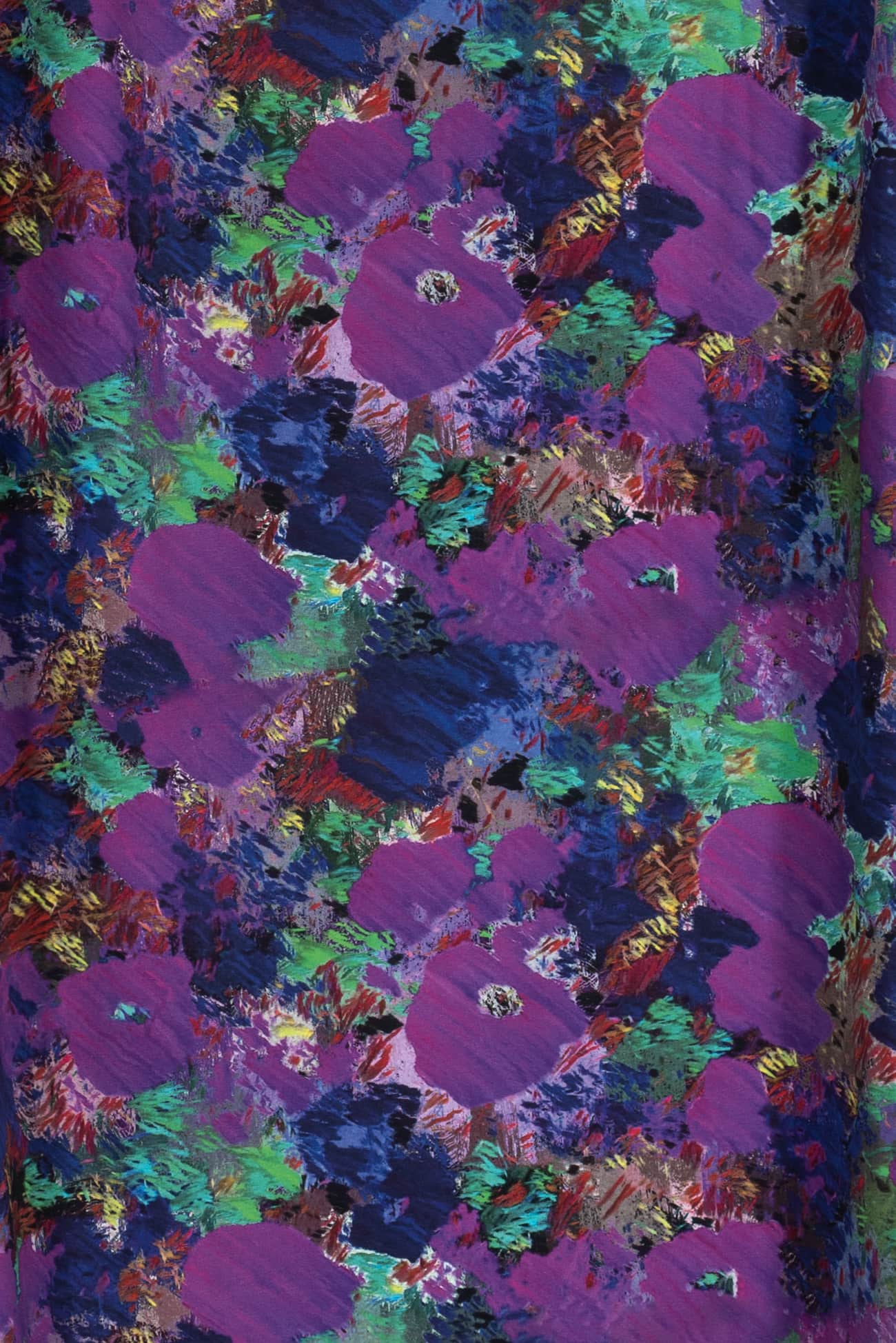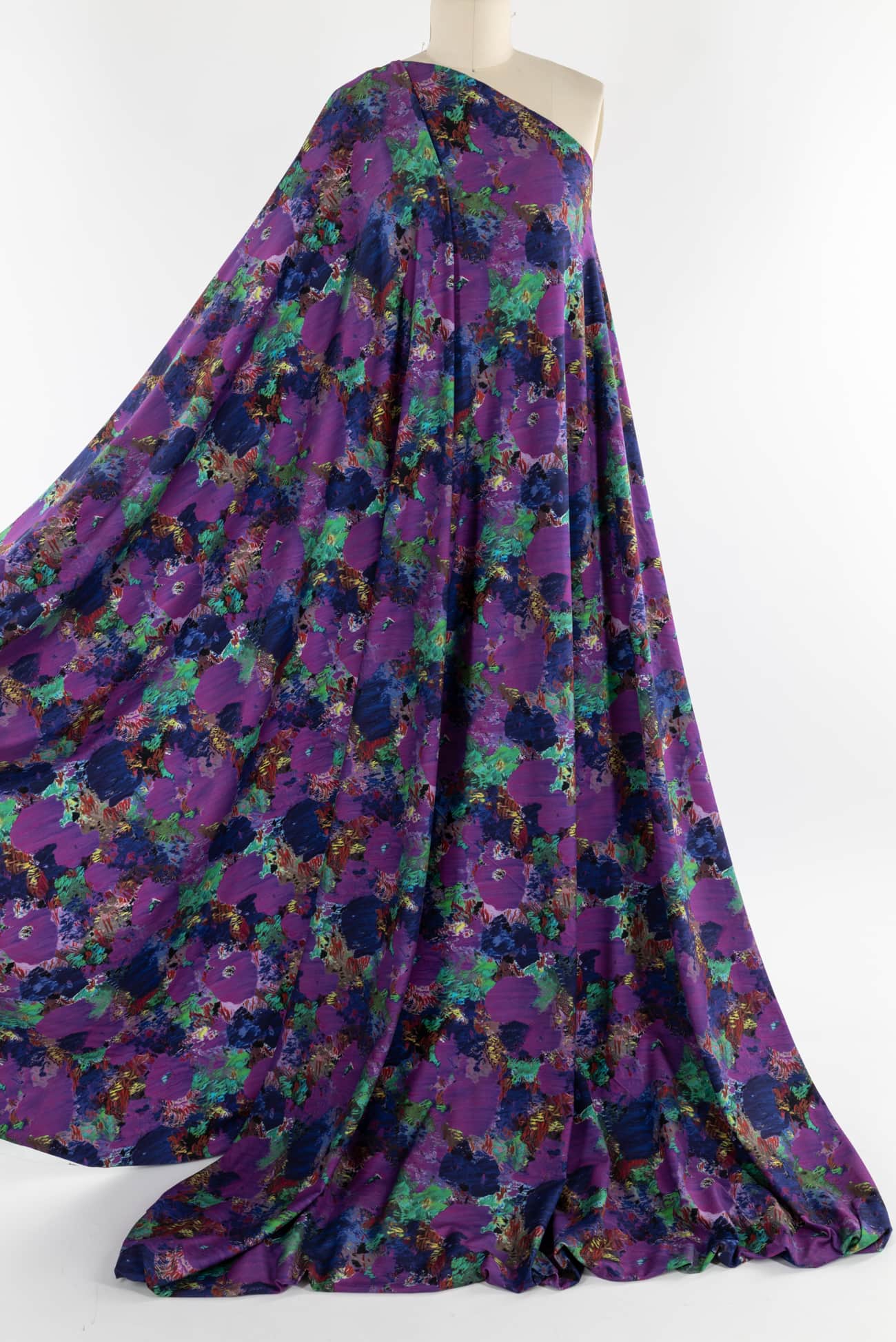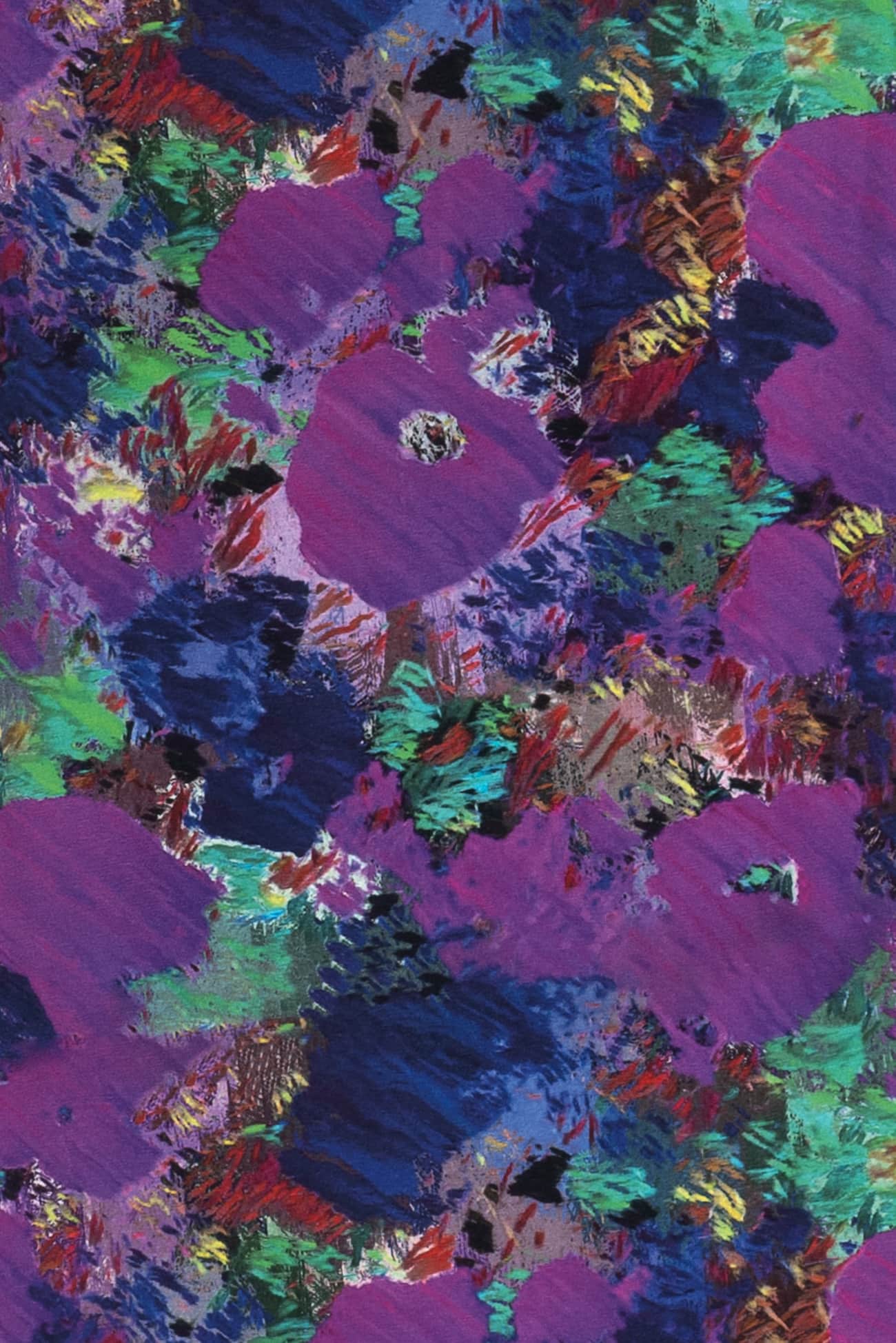 Impressionistic painterly floral in brilliant shades of purple and orchid with green in a digital print on an impeccable European quality cotton/spandex jersey knit, from Denmark. Light/mid-weight, opaque, and will skim the body in a flattering way. It has a soft, smooth texture, fluid drape, 4-way stretch, a 12" repeat, and some rolling at the cut edge. Right for a t-shirt, tunic, dress, soft pants, leggings, cardigan, skirt, or loungewear, as well as children's or men's clothing. Oeko-Tex® certified.