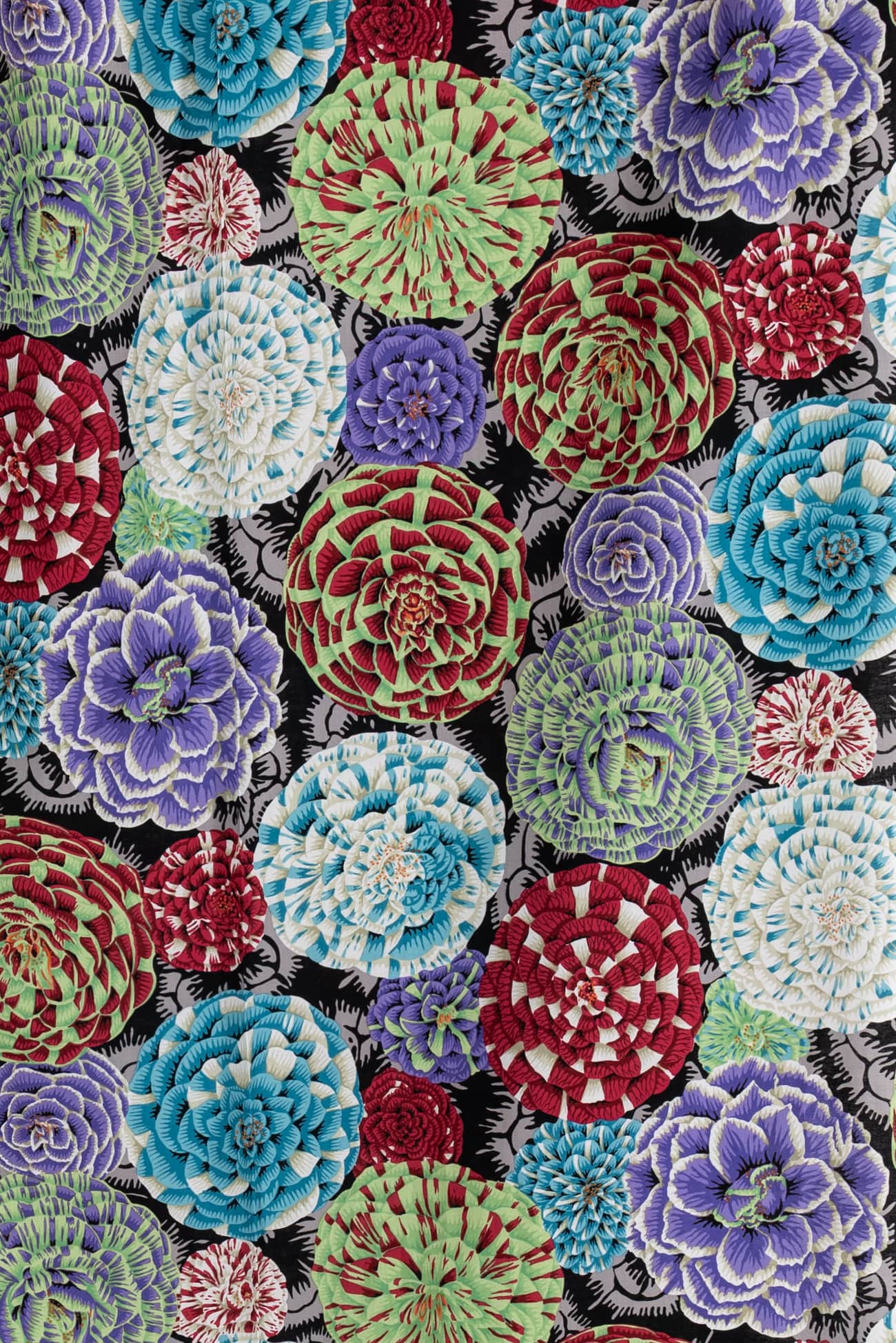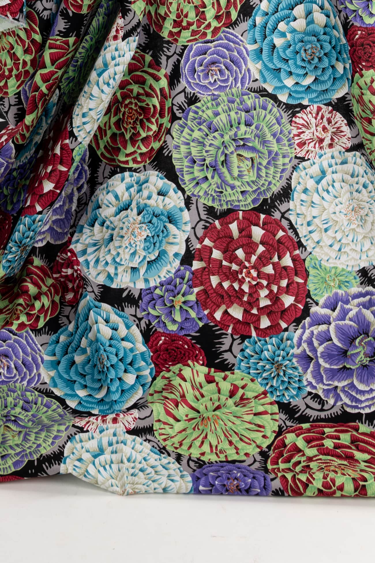 A rich kaleidoscope of dahlias in shades of blue, green, ruby and violet with black accents in a fine-grained white cotton woven, from the studio of renowned colorist Kaffe Fassett. Lightweight, opaque with a smooth matte hand, a 24" repeat and light drape. Right for a dress, shirt, skirt, tunic, top, soft pant, caftan, kimono, loungewear, men's or children's.