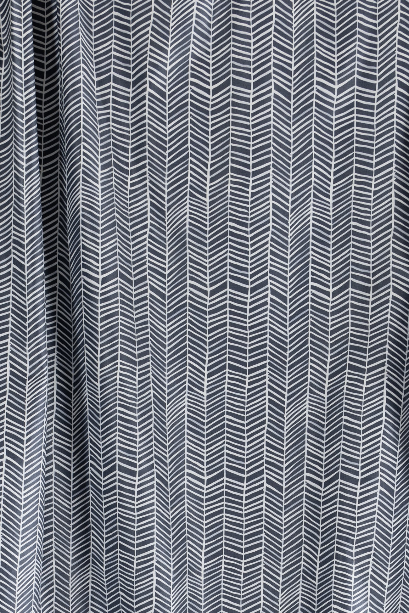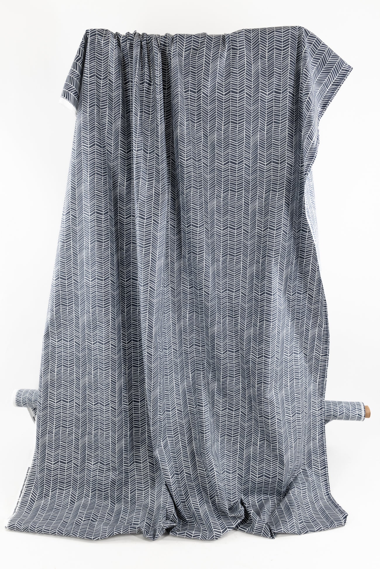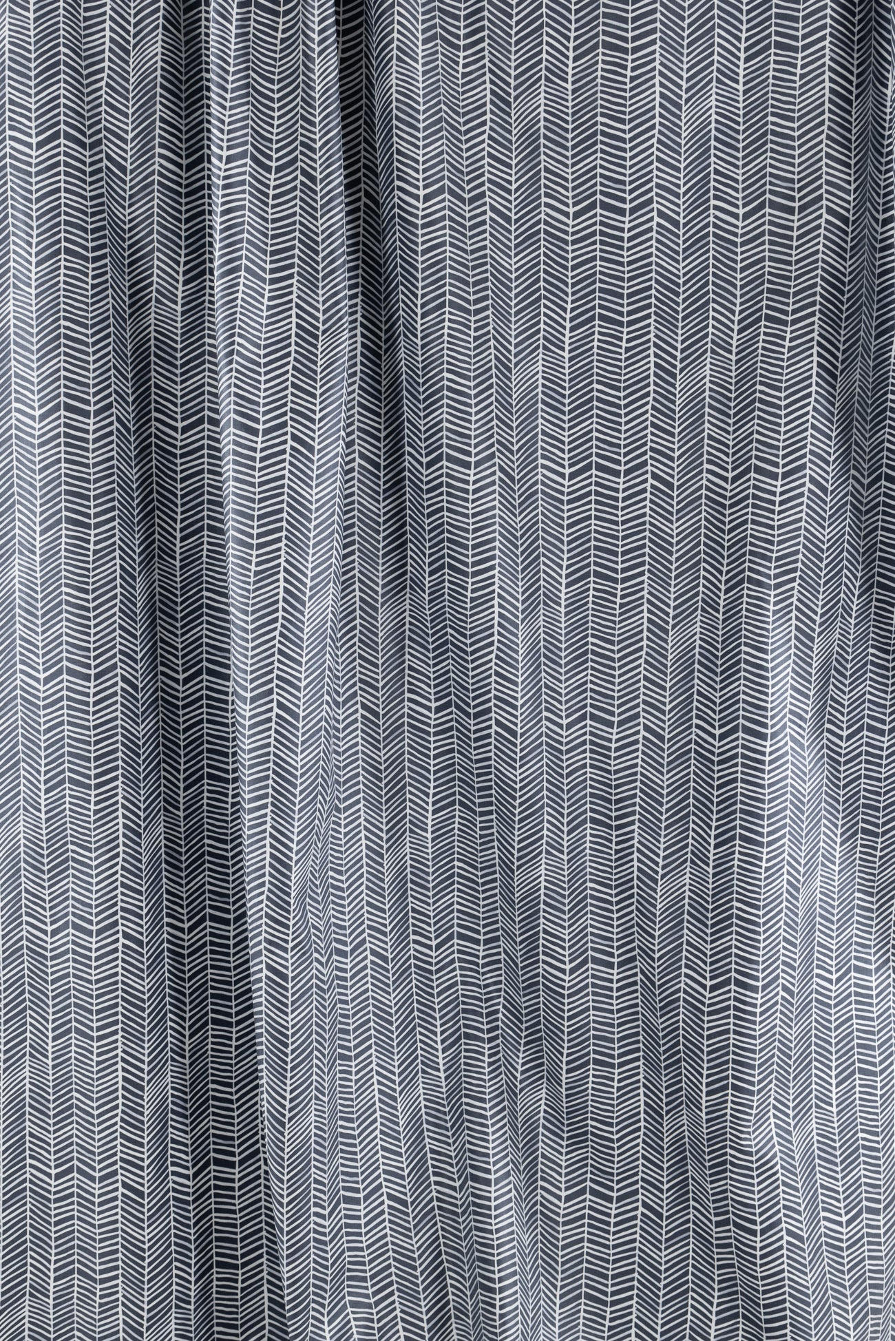 Chic and cheerful white on charcoal gray herringbone is printed on a certified organic cotton and then layered under a thin waterproof BFA free coating. Beautiful, supple, with a malleable smooth dry hand, matte surface, and lightly structured drape. Perfect for a coat or jacket, cape, poncho, children's, home dec, or crafting.