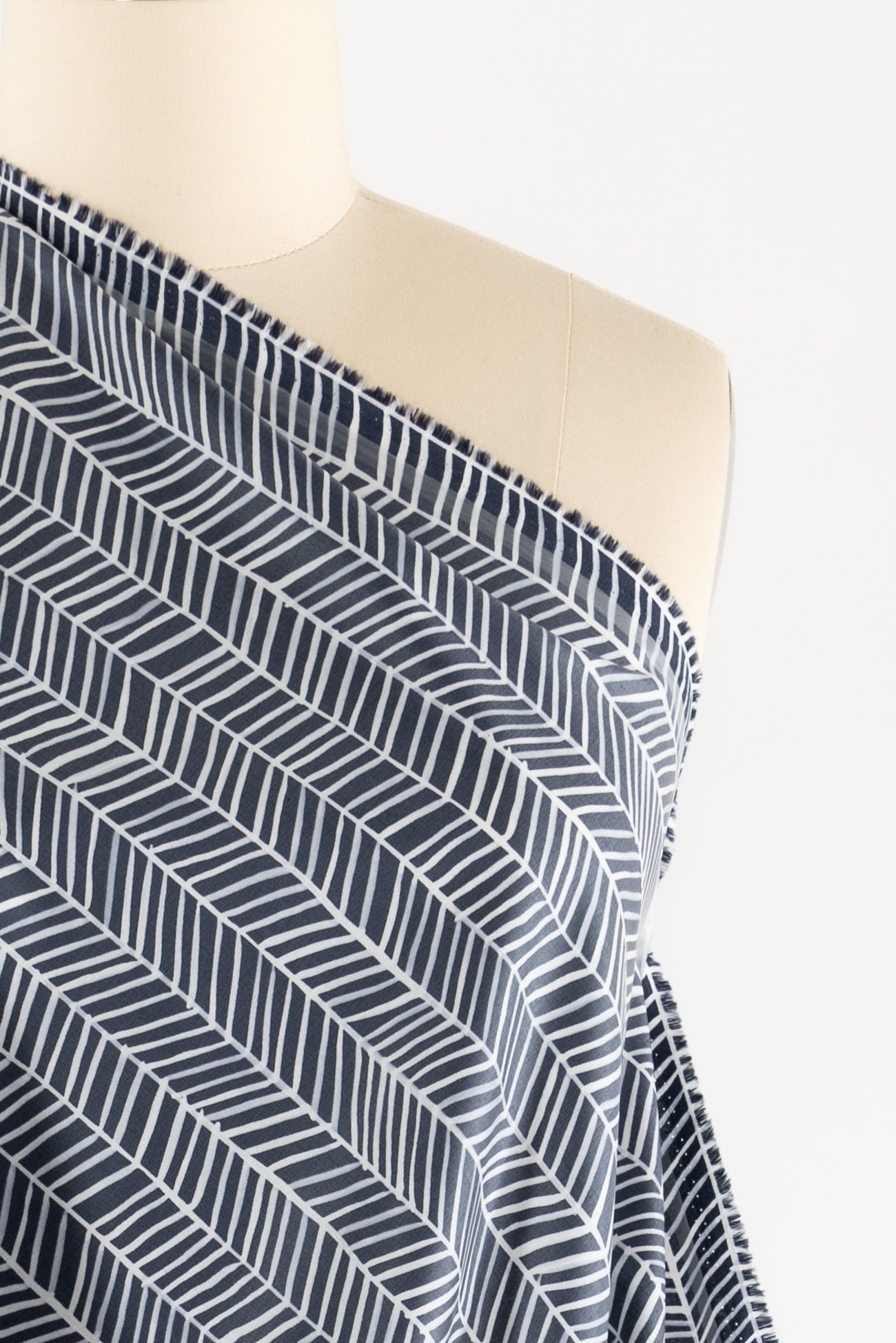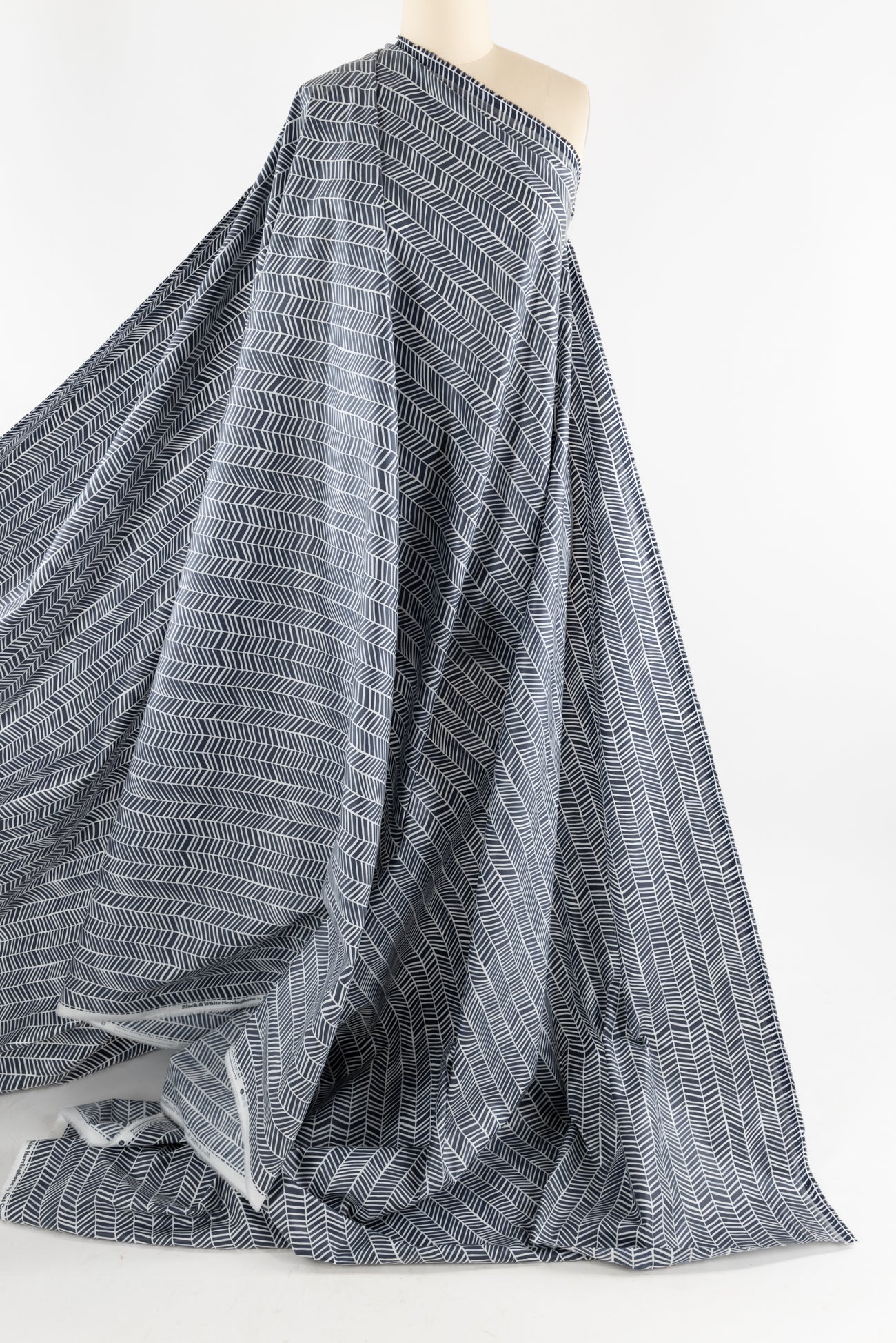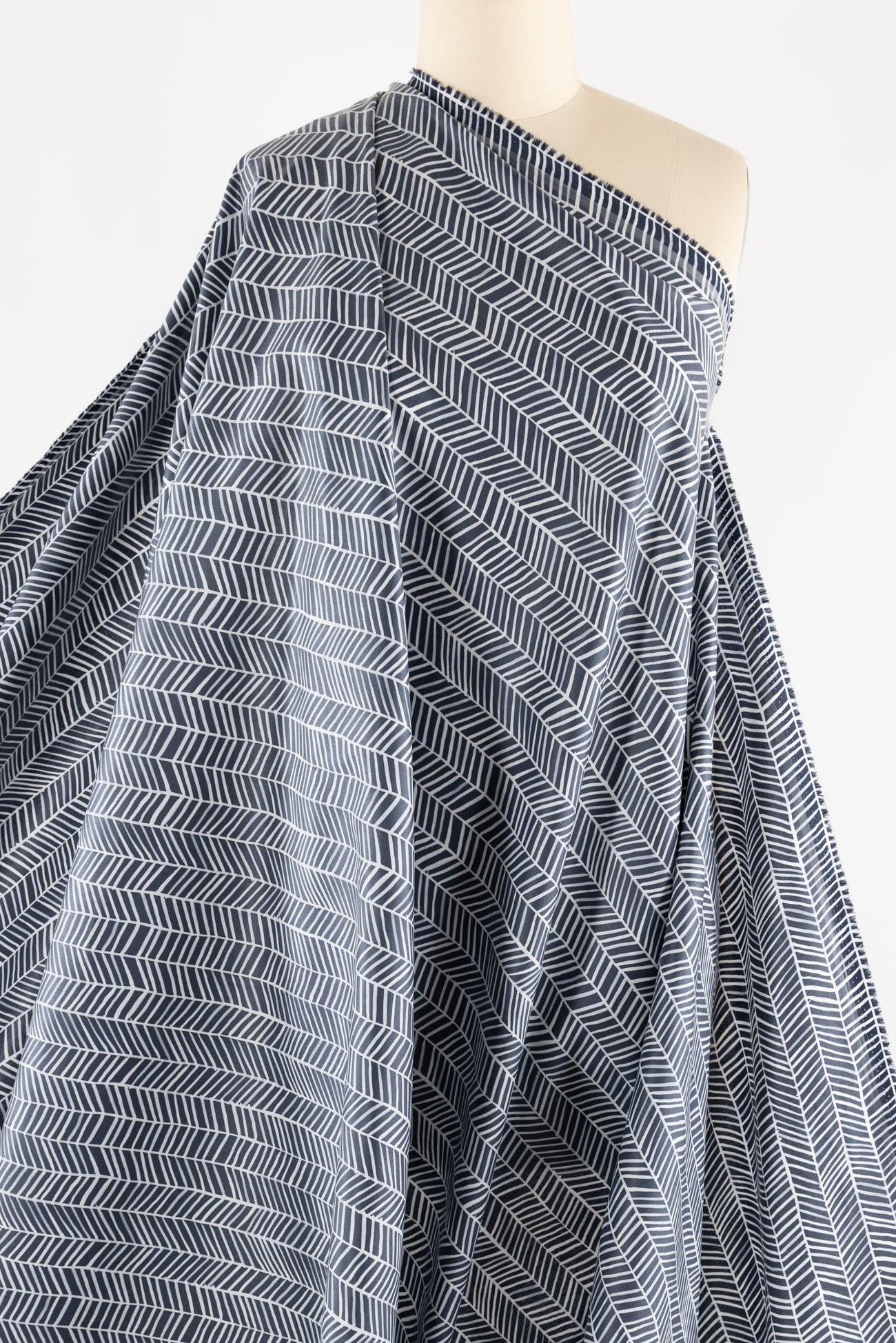 Chic and cheerful white on charcoal gray herringbone is printed on a certified organic cotton and then layered under a thin waterproof BFA free coating. Beautiful, supple, with a malleable smooth dry hand, matte surface, and lightly structured drape. Perfect for a coat or jacket, cape, poncho, children's, home dec, or crafting.
