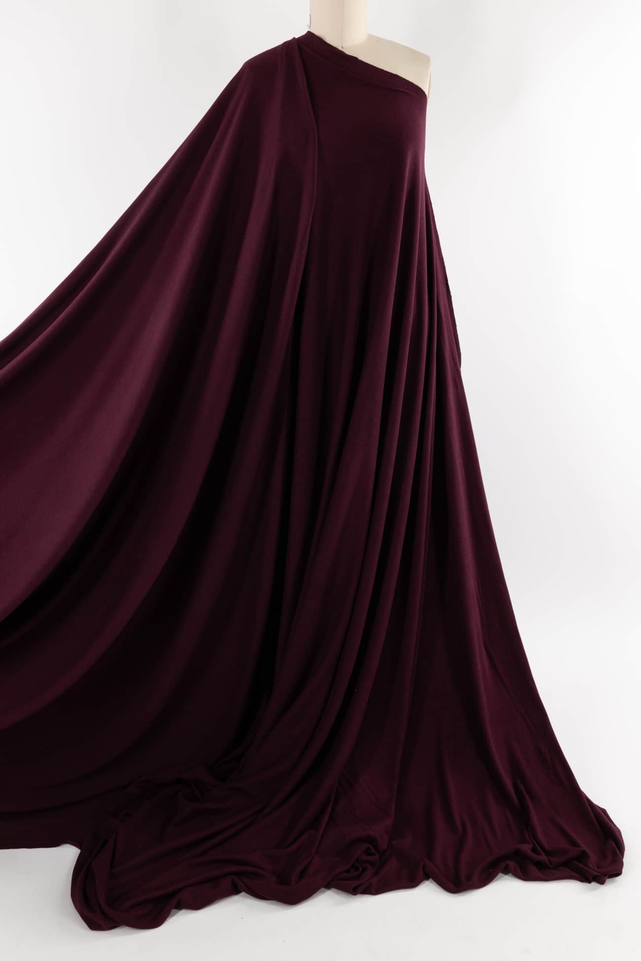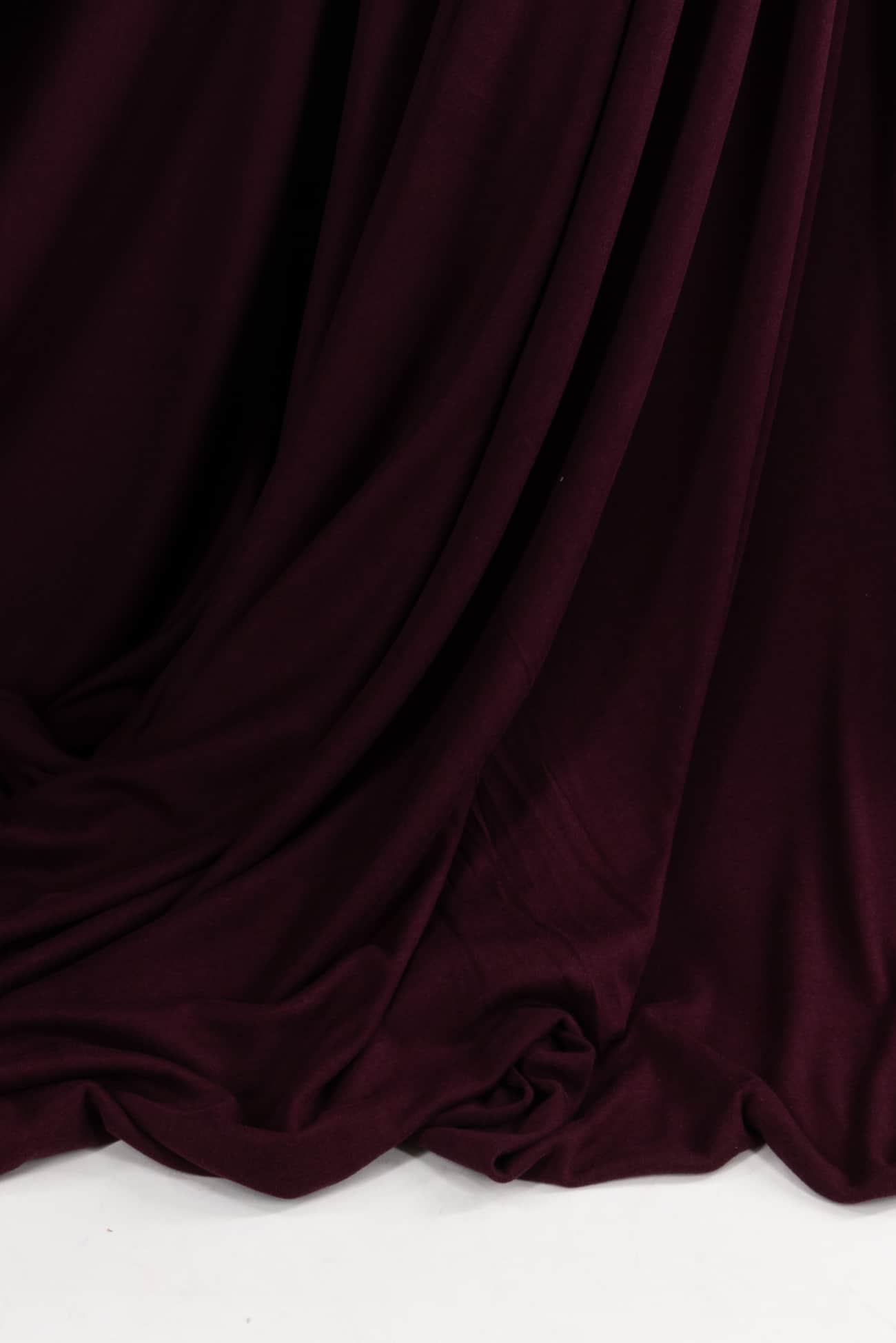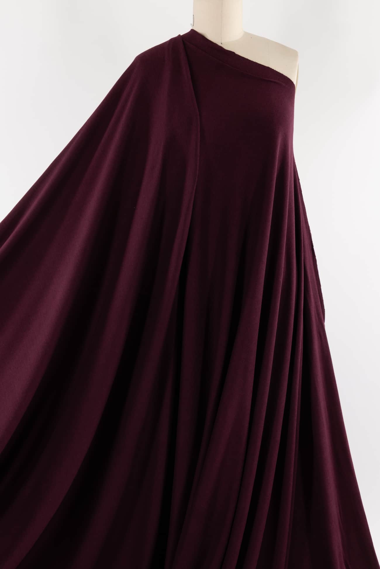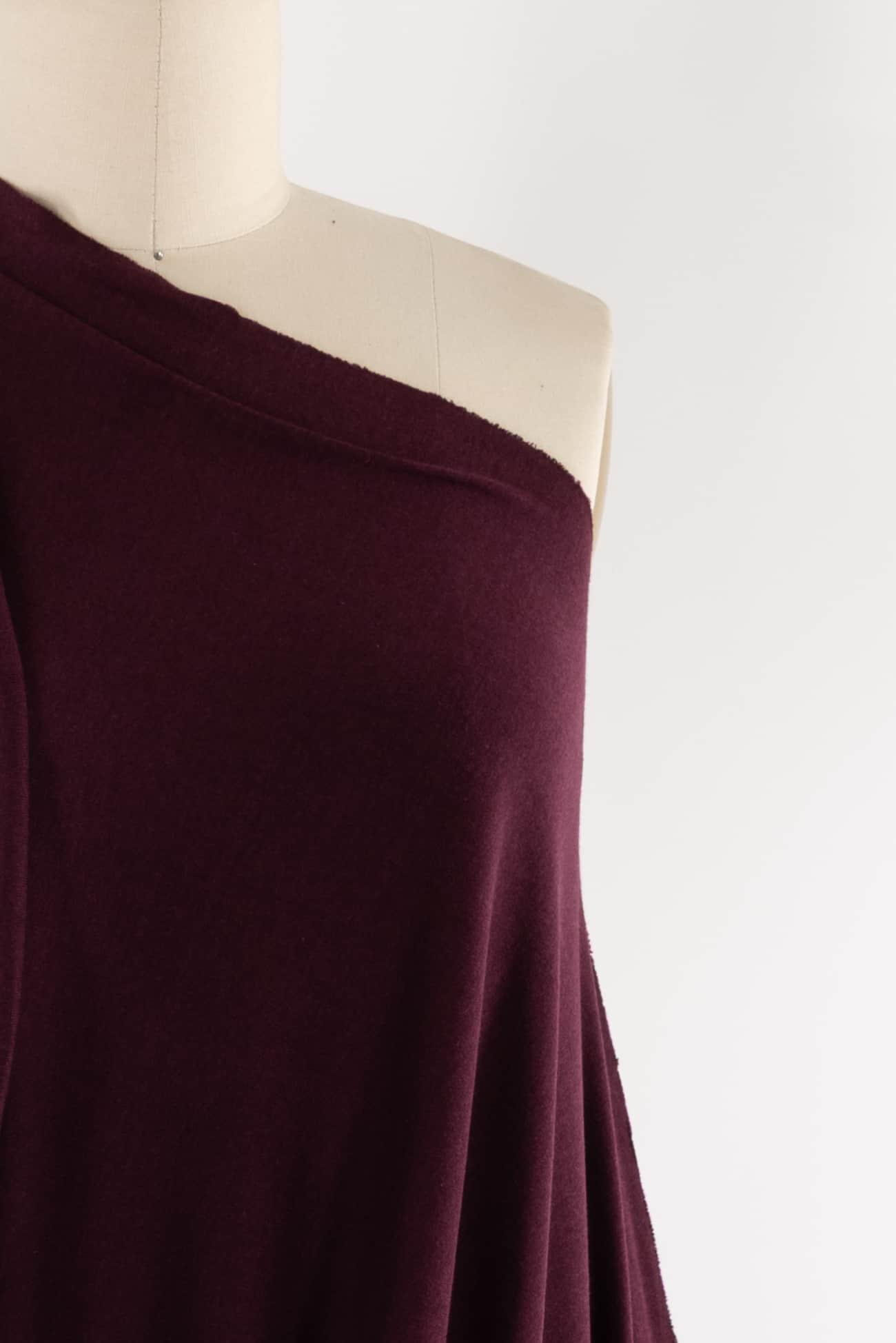 Lush purple-y burgundy double knit in an unusual & rare organic hemp/cotton blend, deadstock from an LA designer. Light/midweight, with a cozy soft hand and supple drape, crosswise stretch with slight recovery and no rolling at the cut edge. Right for a top, T-shirt, dress, cardi, hoodie, dress, soft pant, light jacket, or loungewear.
