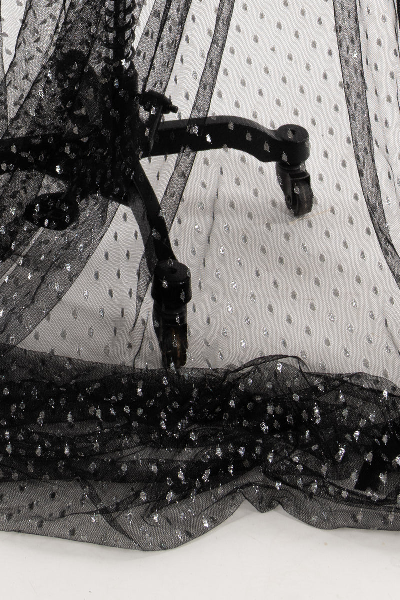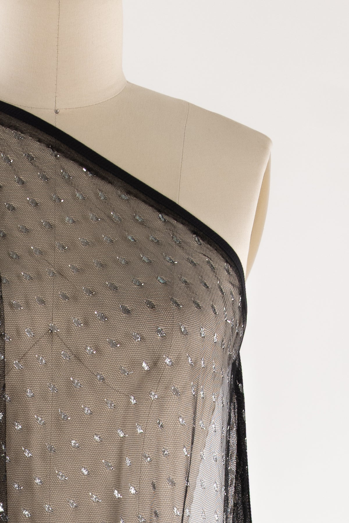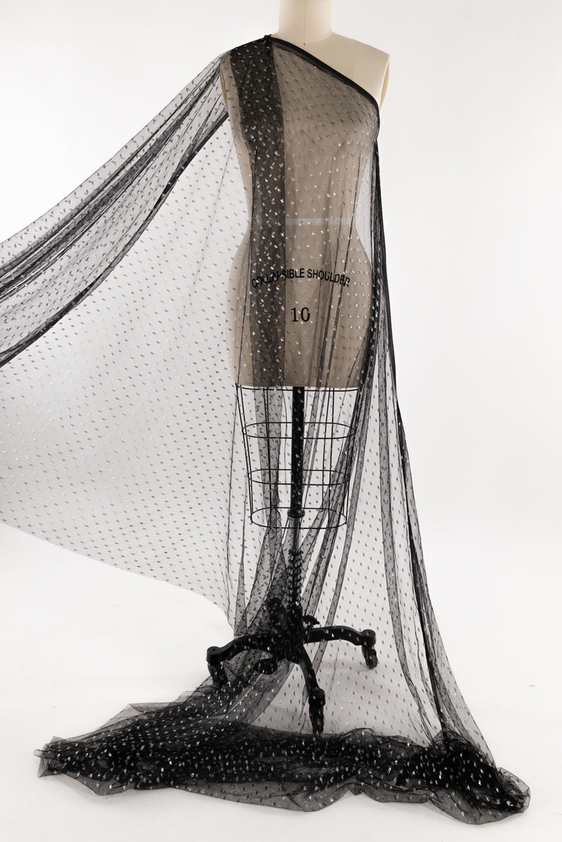 Sophisticated silver metallic dots float on a fine black nylon mesh. Stunning deadstock from a NYC designer. Light and airy yet stable, with a touch of crosswise stretch, a soft hand, and light airy drape. A very fun fabric to design with. Right for a mysterious over-layer or used in combination with other fabrics. You could line it or leave sheer or line parts of a garment or layer. For a top, cardigan, airy vest, skirt, shrug, dress, or detail areas.