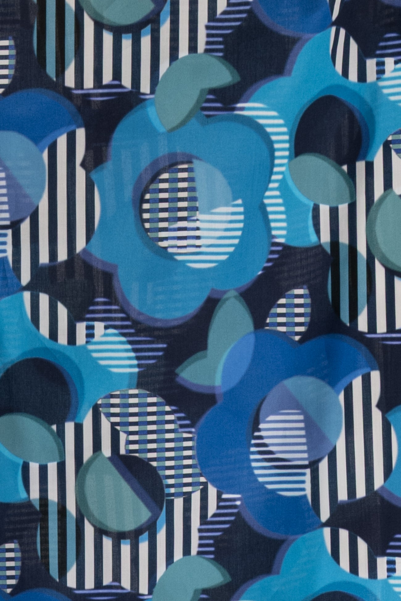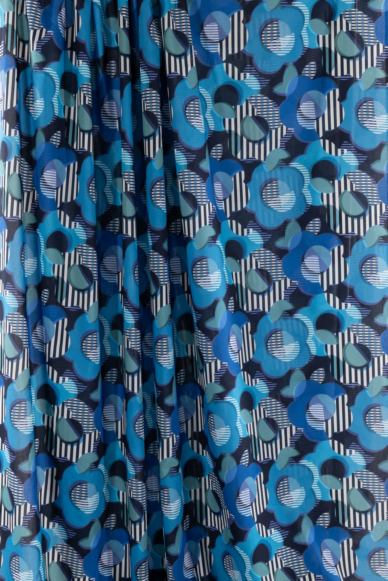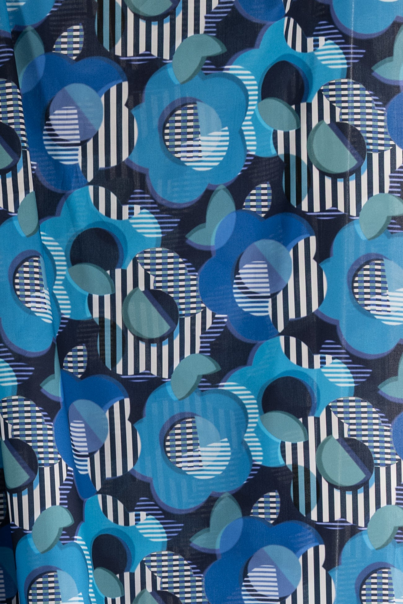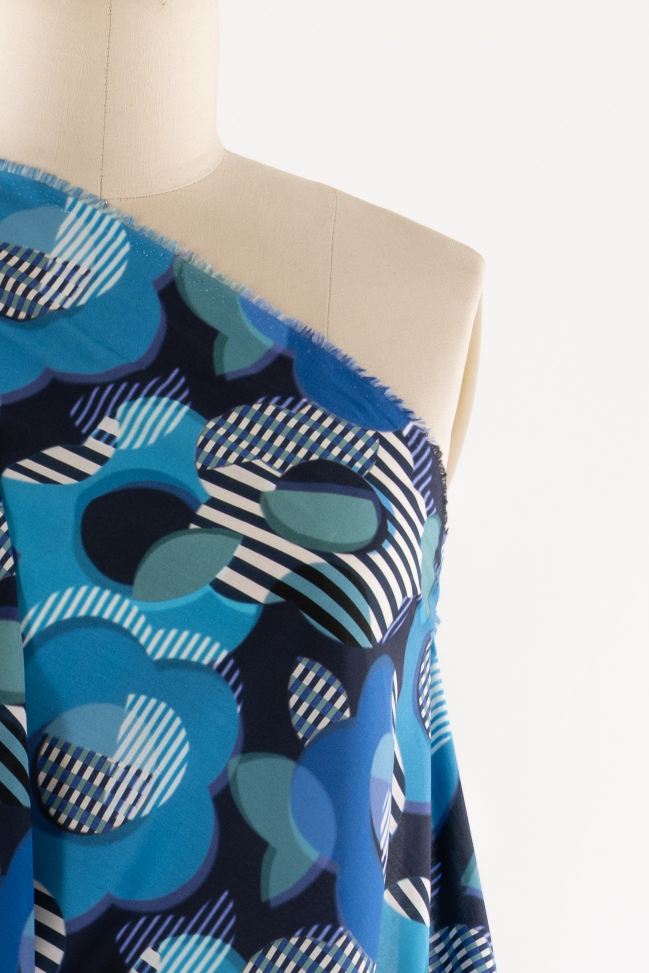 Modern stripey floral inspired by vintage Liberty designs, in shades of blue from turquoise to navy on white. Produced in Northern Italy for Liberty of London, printed on the renowned and exceptional Tana Lawn, the cotton that behaves and feels like silk. Fine-grained, with a cool, smooth, soft hand, fluid drape, and depth of color. Perfect for a shirt, dress, skirt, tunic, soft pant, caftan, loungewear, children's or men's clothes, accessories, or home decor. Right to wear everyday or for statement pieces. One-way design 12¼" repeat. OEKO-TEX® certified.