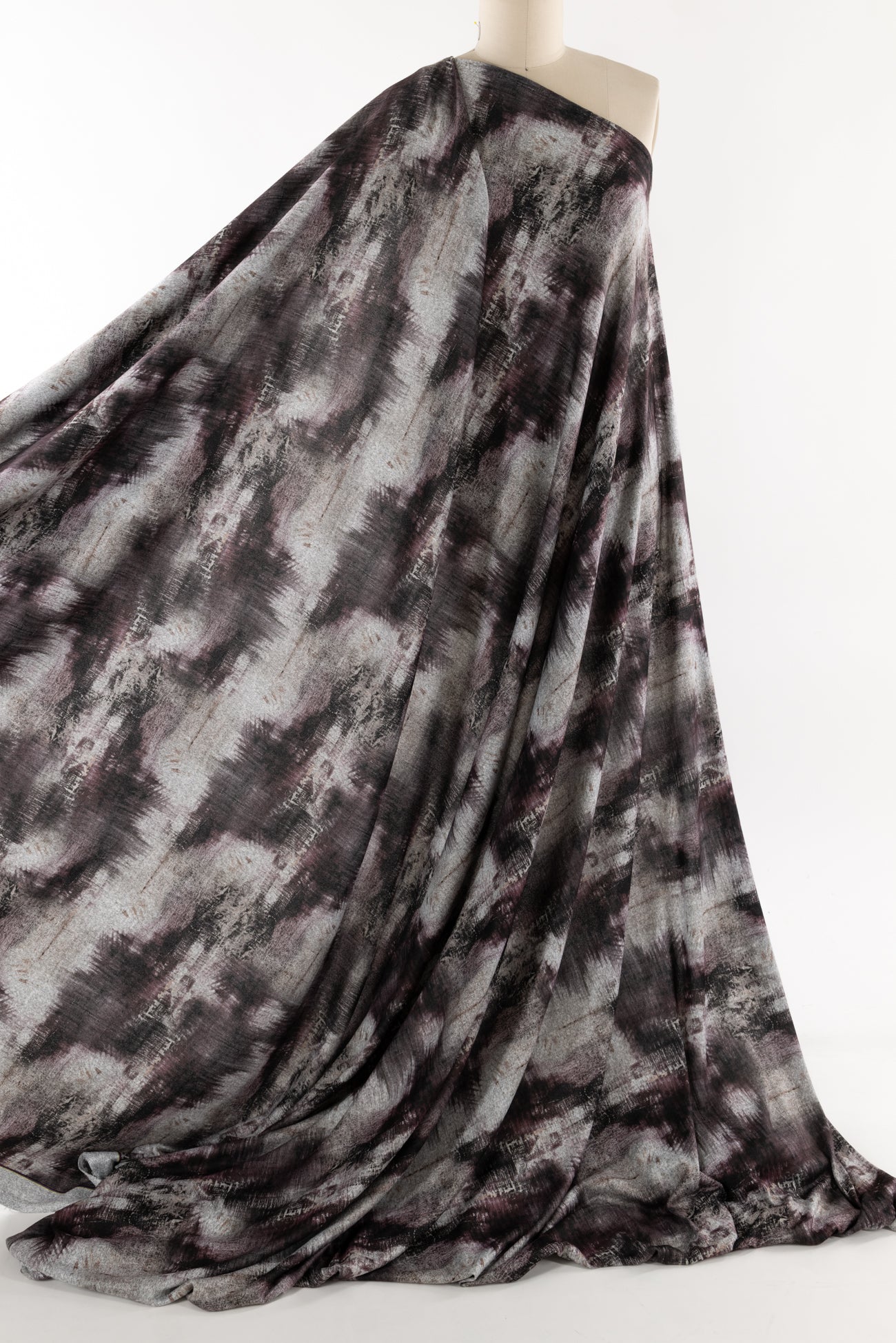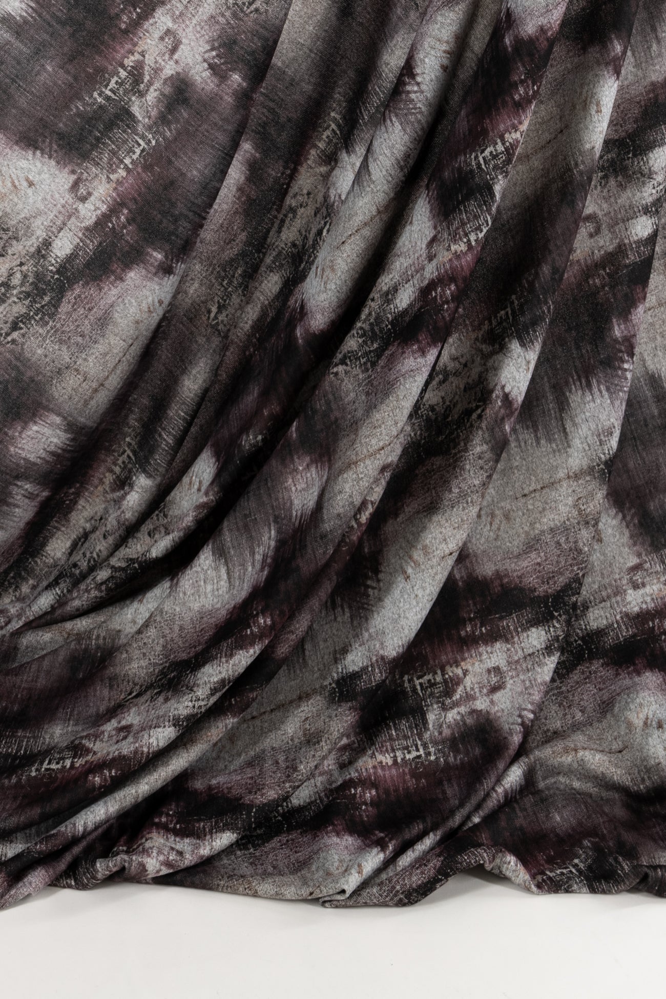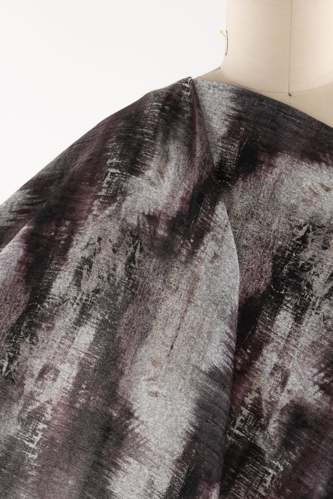 Soft sweater knit with an elegant abstract in painterly shades of gray, deep purple, and black. Cozy, not scratchy, with a supple hand and drape, perfect for those who can't wear wool. Opaque, with crosswise stretch, a soft drape with a touch of rolling at the cut edge, and a 23" repeat. The mid-weight is perfect for a cardigan, top, tunic, hoodie, or t-shirt. This is one of the new polyesters, really lovely, do not be put off by the fact that it is a synthetic; a good alternative to wool with the feeling of cashmere or cotton cashmere. Ideal too, for a soft sweater-y vest to wear over tops and t-shirts for a cozy layer of warmth.