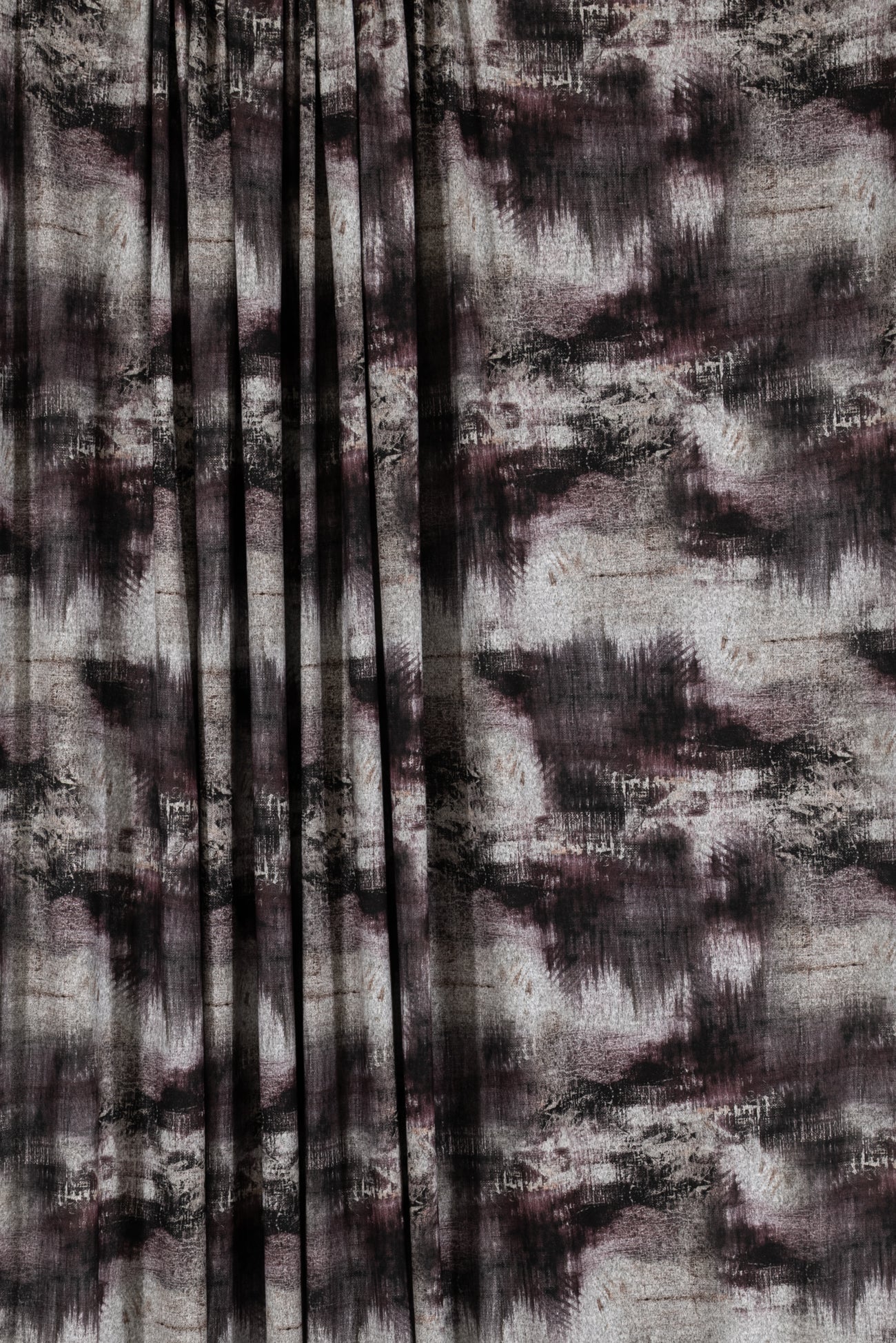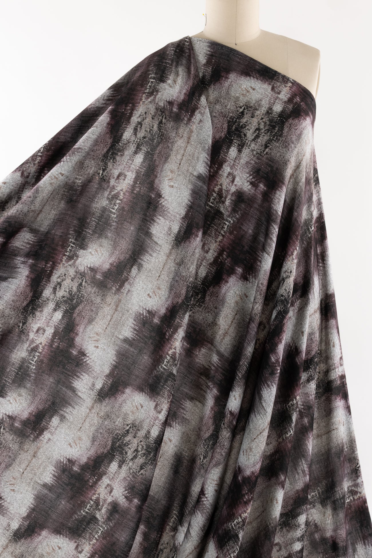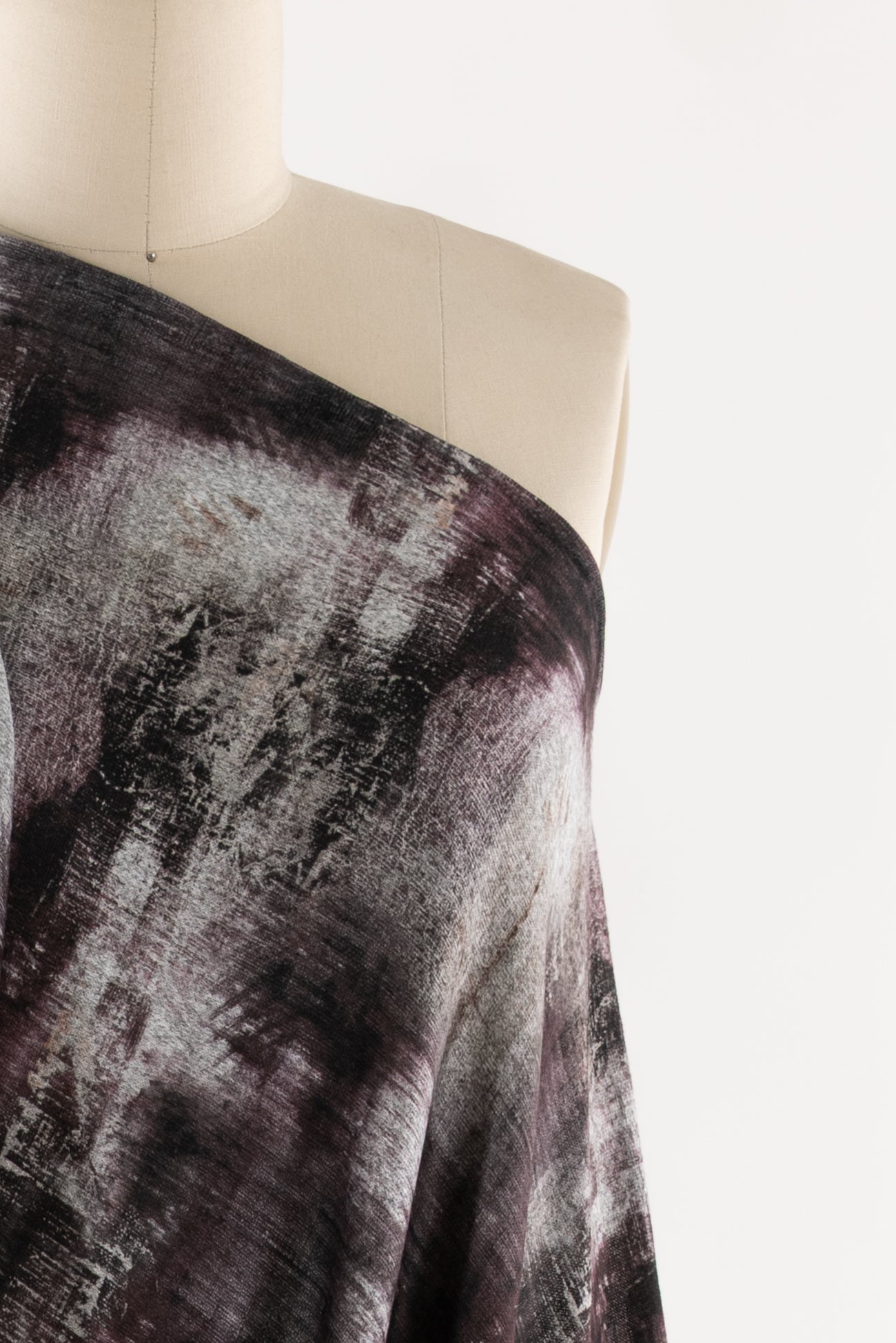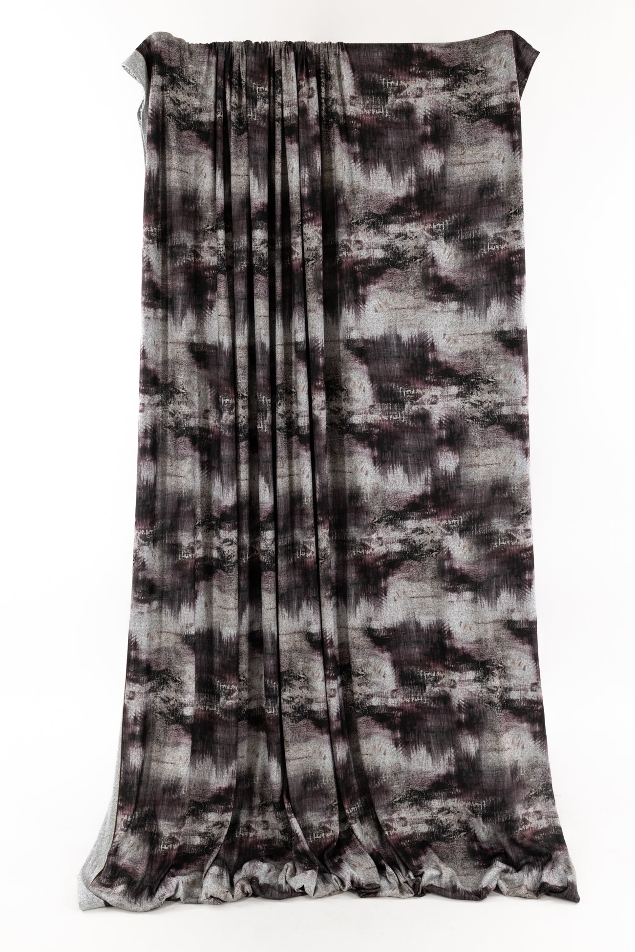 Soft sweater knit with an elegant abstract in painterly shades of gray, deep purple, and black. Cozy, not scratchy, with a supple hand and drape, perfect for those who can't wear wool. Opaque, with crosswise stretch, a soft drape with a touch of rolling at the cut edge, and a 23" repeat. The mid-weight is perfect for a cardigan, top, tunic, hoodie, or t-shirt. This is one of the new polyesters, really lovely, do not be put off by the fact that it is a synthetic; a good alternative to wool with the feeling of cashmere or cotton cashmere. Ideal too, for a soft sweater-y vest to wear over tops and t-shirts for a cozy layer of warmth.