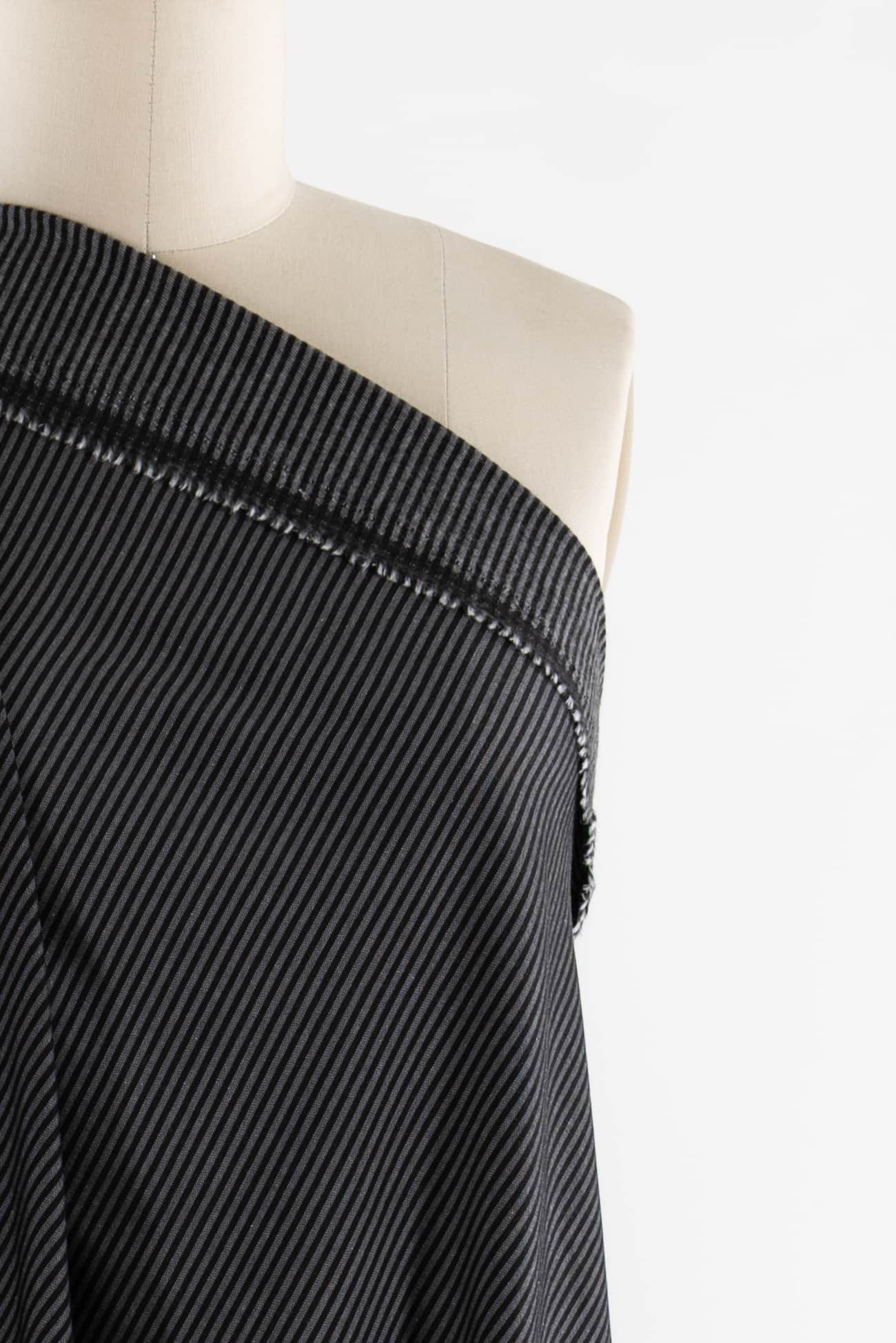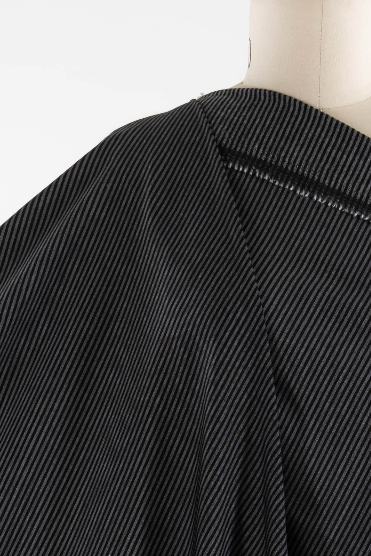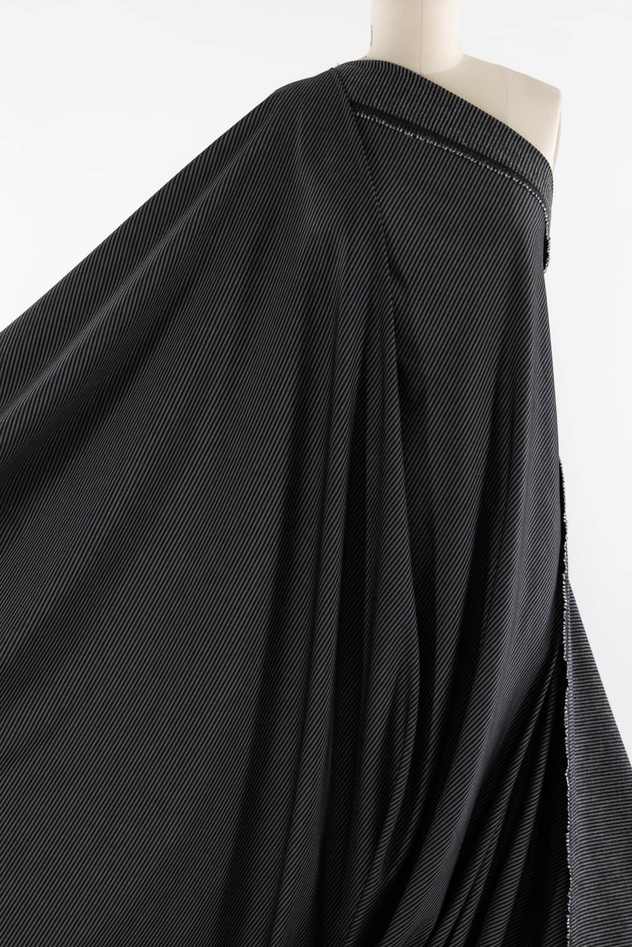 Polished black and gray stripes in a fine quality yarn-dyed rayon blend, deadstock from LA designer Katrin Noon for Spirithouse. Light/mid-weight, opaque, with a soft smooth hand and soft supple drape. Right for a dress, skirt, blouse, tunic, kimono, caftan, soft pants, men's or sophisticated children's.