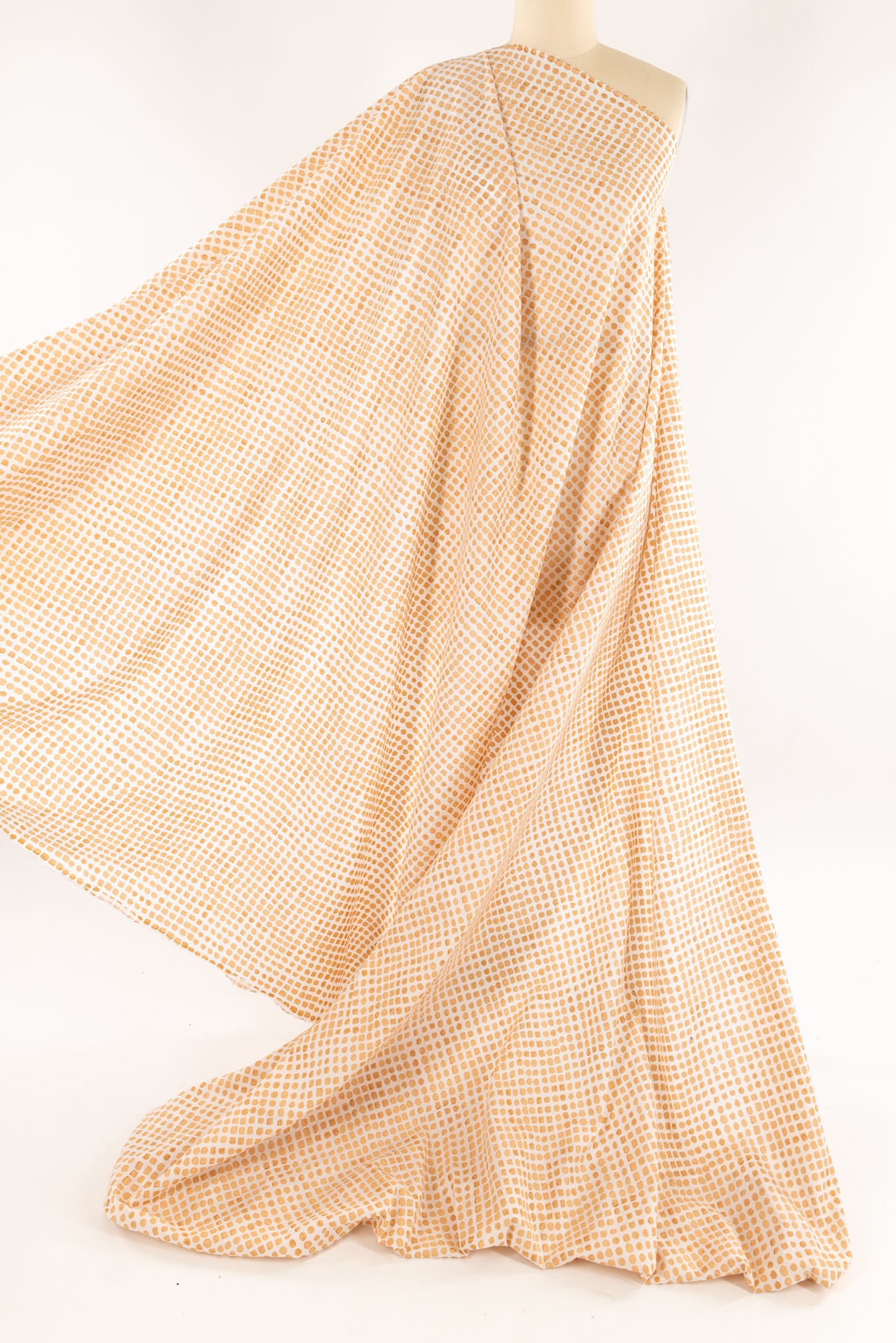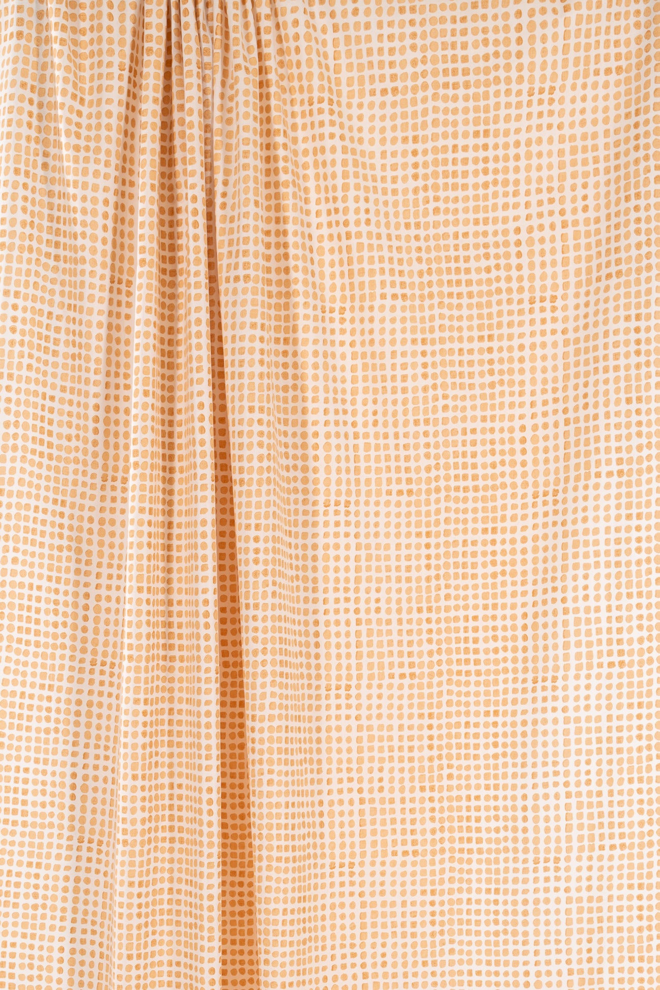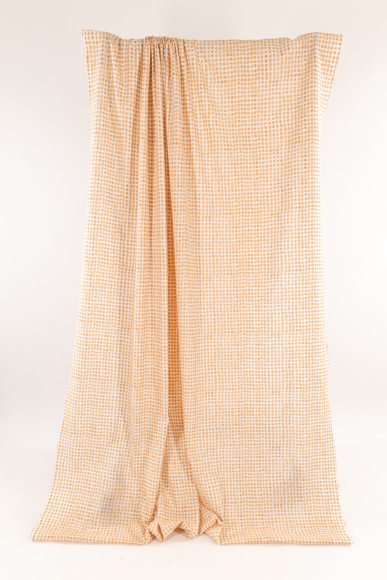 A sassy grid of squares and dots in tangerine printed on warm white cotton. A beautiful quality woven, deadstock from an LA designer. Lightweight, opaque, with a smooth soft hand, 4¾" repeat and supple drape. Right for a dress, shirt, skirt, tunic, top, soft pant, kimono, caftan, men's or children's.