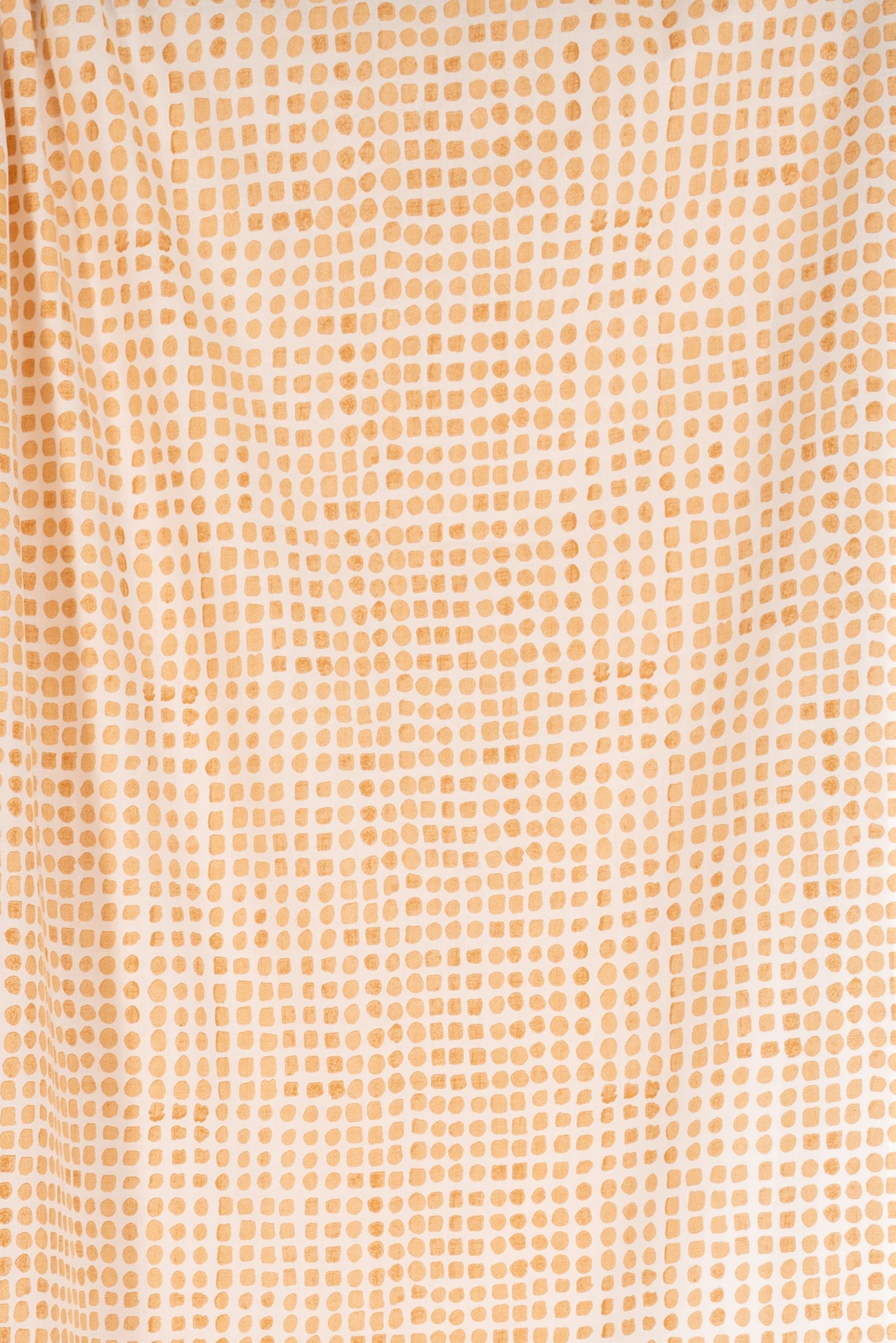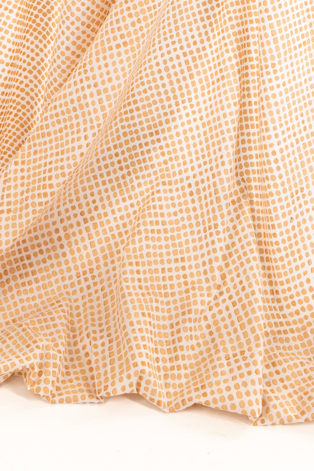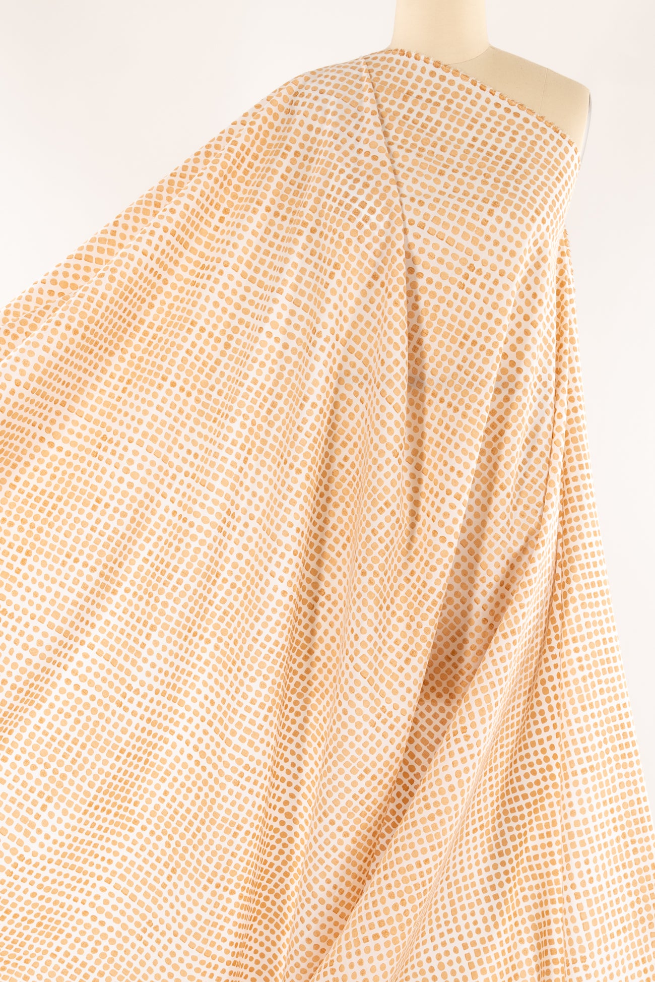 A sassy grid of squares and dots in tangerine printed on warm white cotton. A beautiful quality woven, deadstock from an LA designer. Lightweight, opaque, with a smooth soft hand, 4¾" repeat and supple drape. Right for a dress, shirt, skirt, tunic, top, soft pant, kimono, caftan, men's or children's.