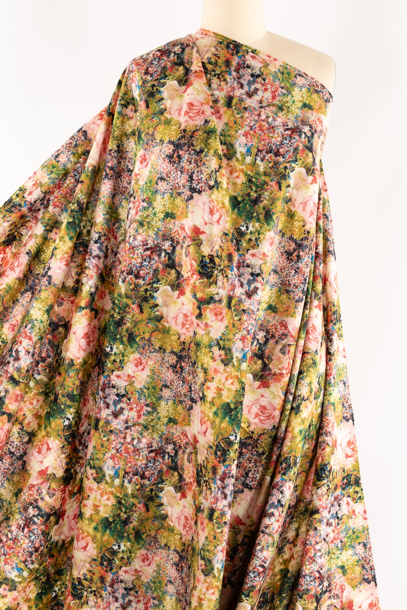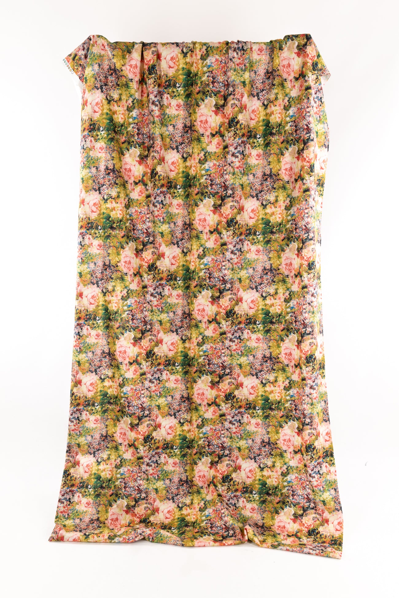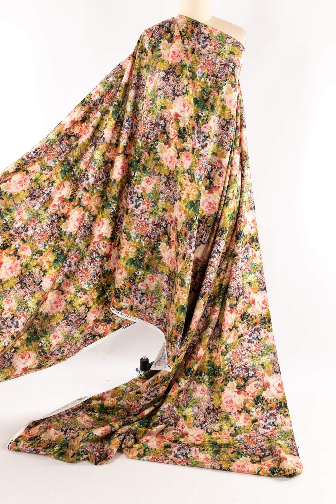 A glorious rose garden in a soft kaleidoscope of artfully faded colors on a fine-grained cotton woven. Lightweight, opaque with a smooth matte hand, a 12¼" repeat and light drape. Right for a dress, shirt, skirt, tunic, top, soft pant, caftan, kimono, loungewear or children's.