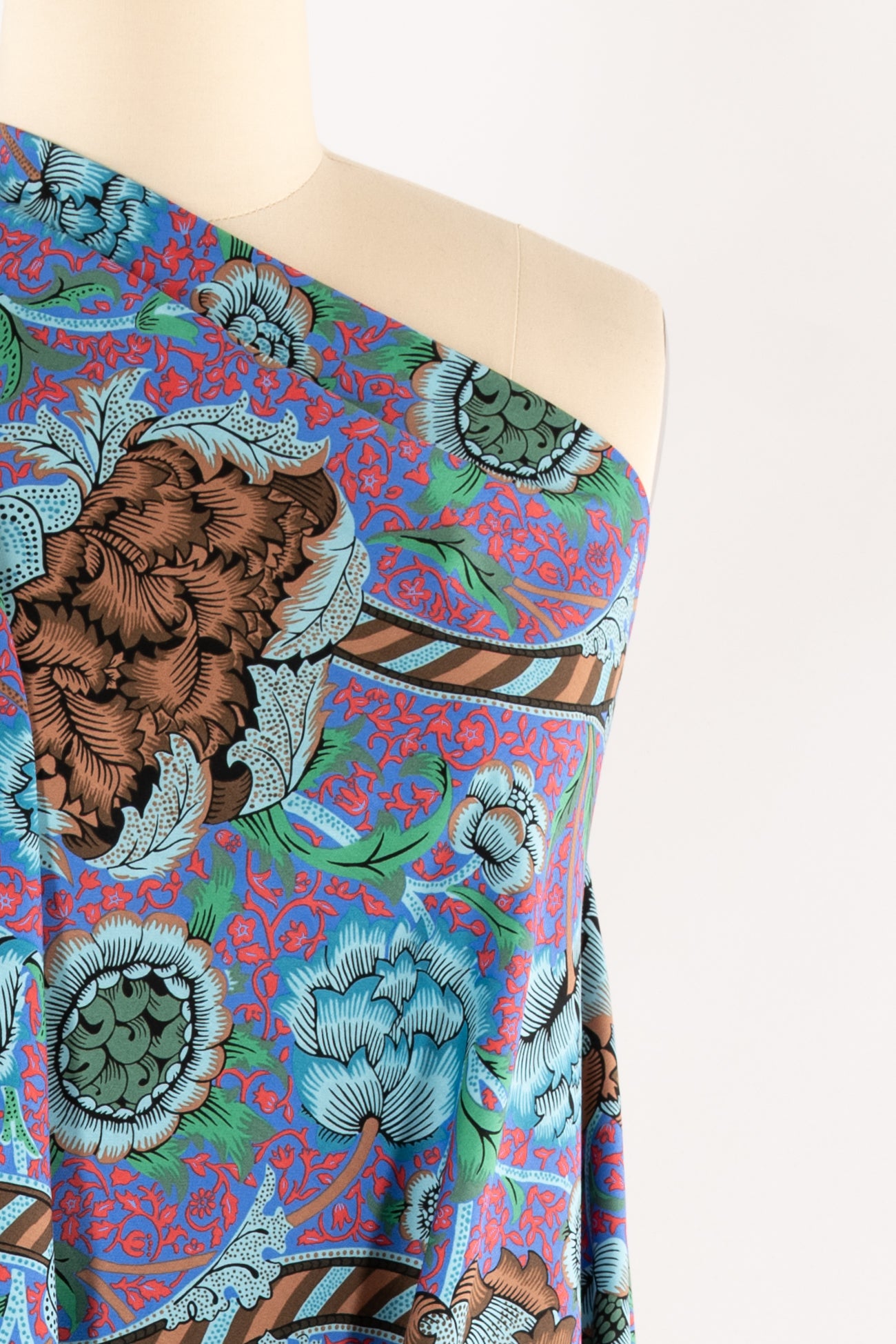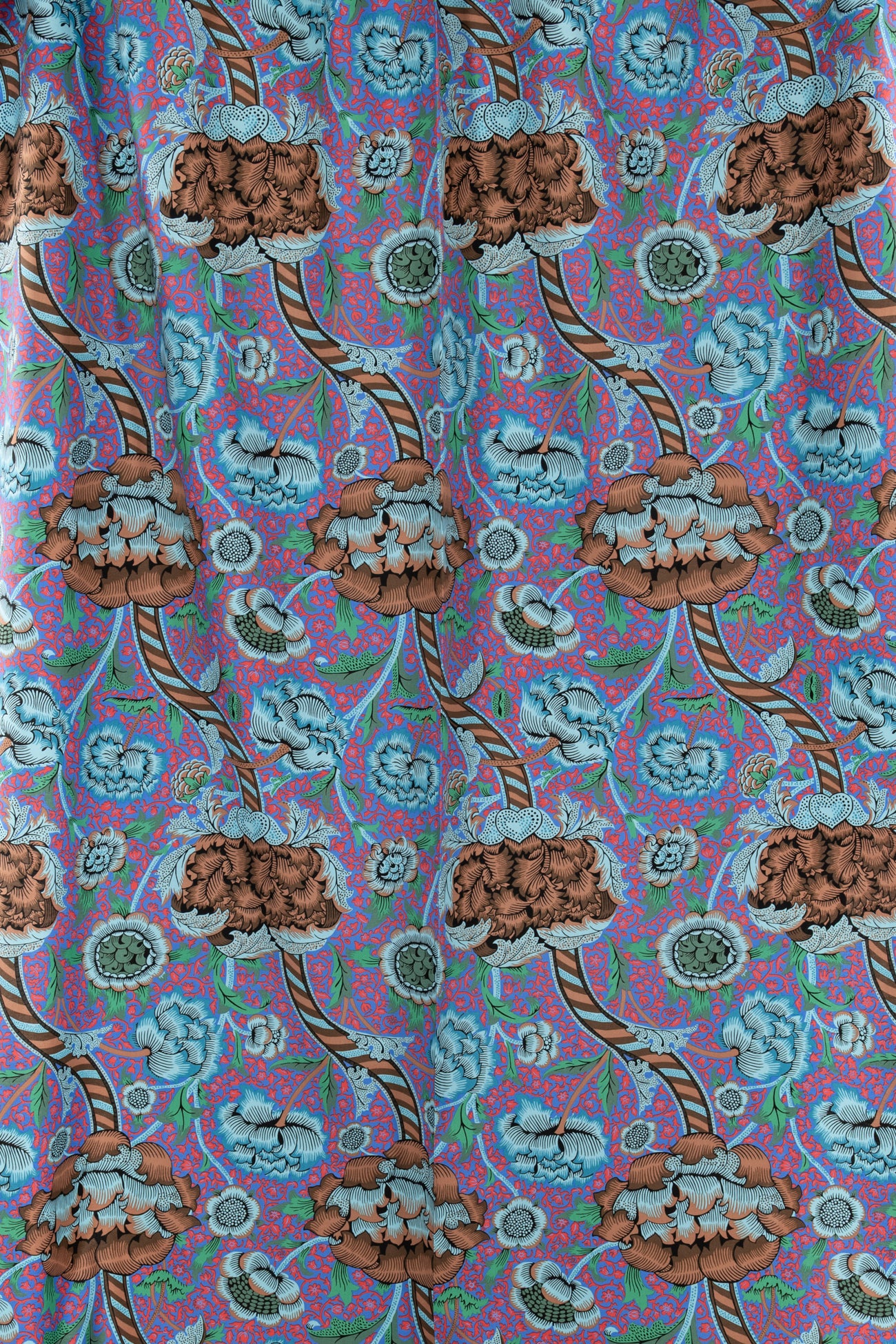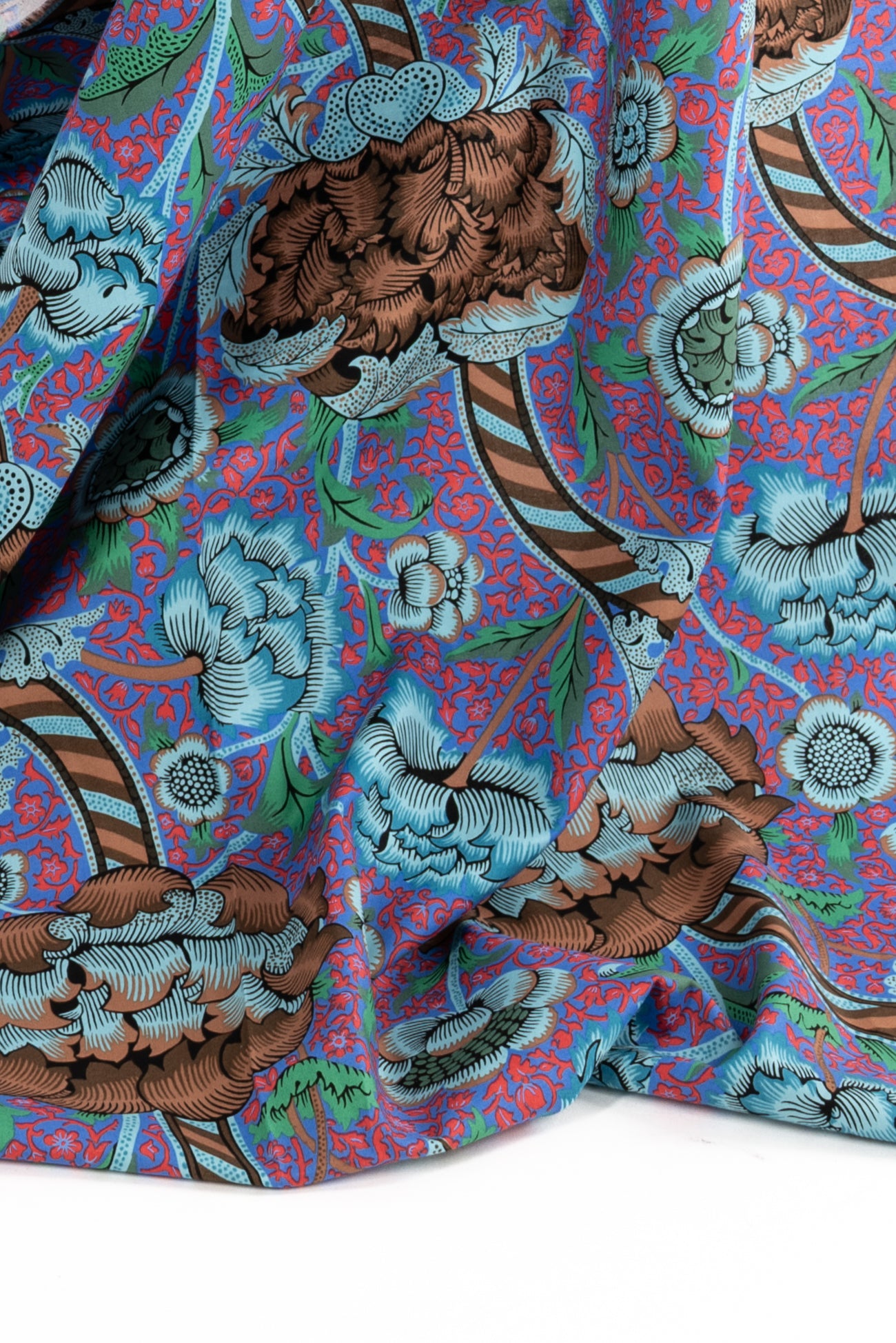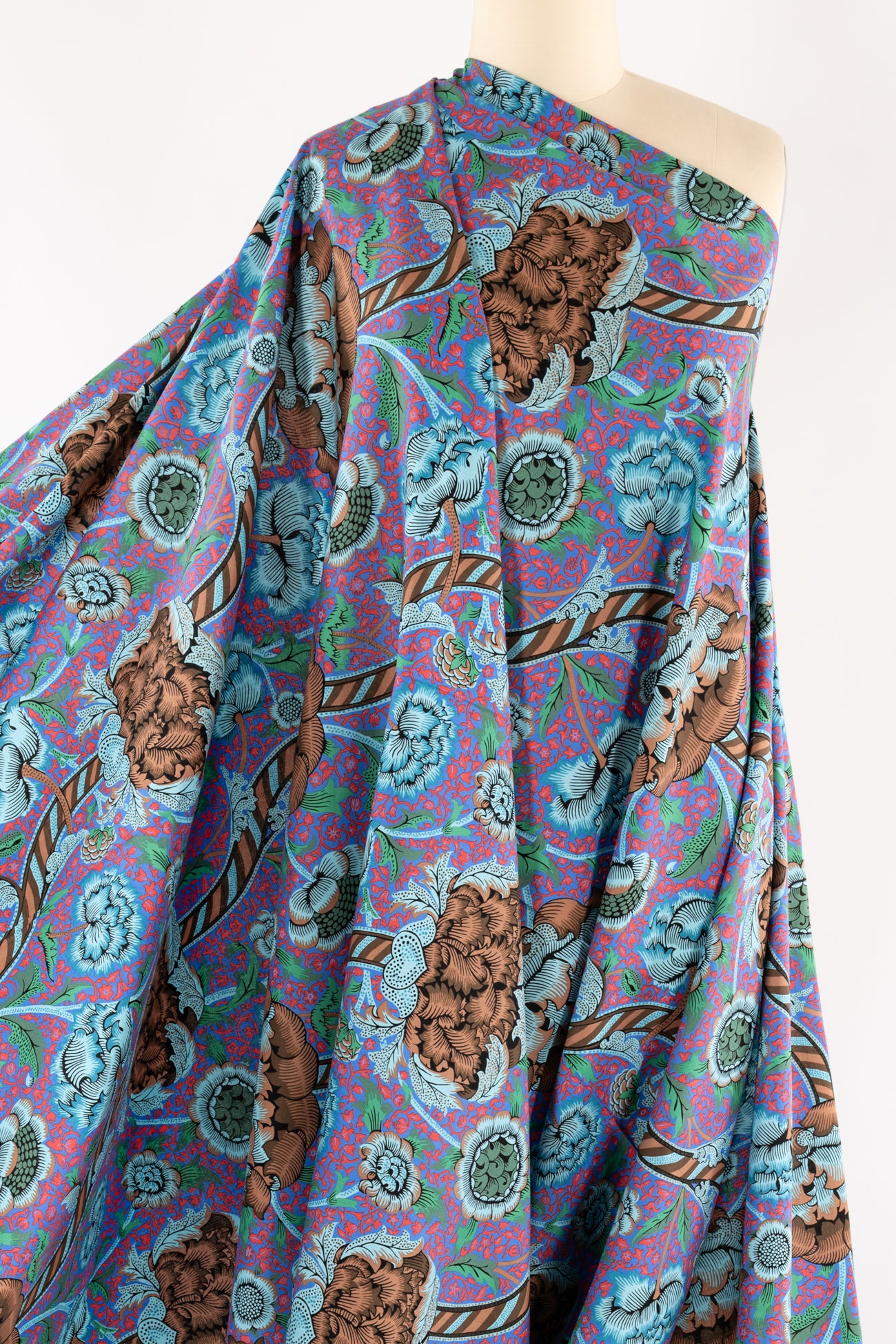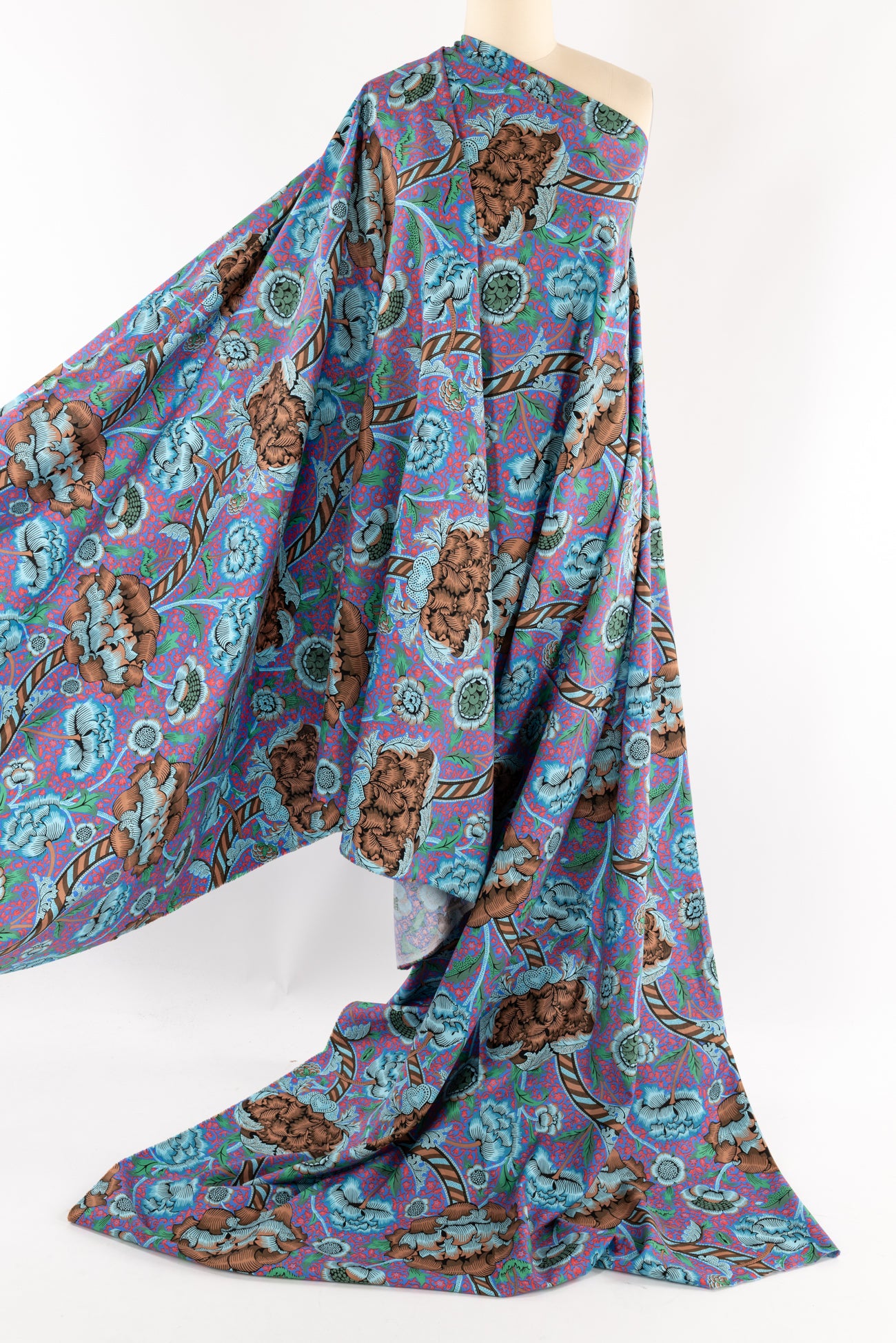 Rich lush floral in vibrant shades of blue and cocoa with green, pink and black accents in a fine-grained cotton woven, from the studio of renowned colorist Kaffe Fassett. Lightweight, opaque with a smooth matte hand, a 23¾" repeat and light drape. Right for a dress, shirt, skirt, tunic, top, soft pant, caftan, kimono, loungewear, men's or children's.