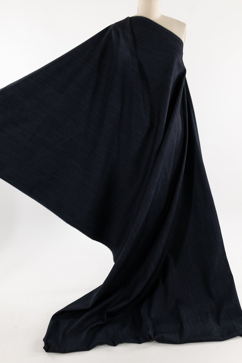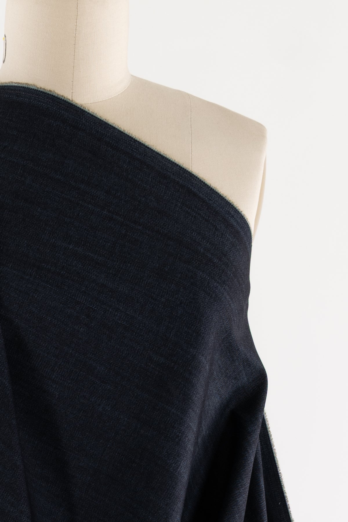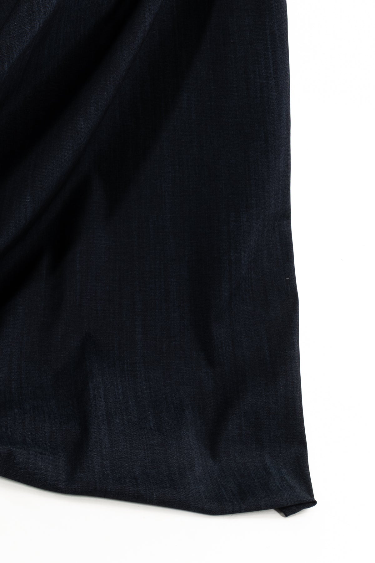 Classic blue stretch denim, fine quality deadstock from an LA designer. Mid-weight with a lightly textured twill hand, good crosswise stretch and recovery and a structured drape. Right for a pant, jeans, light jacket or coat, structured dress or top, tunic, skirt or men's.