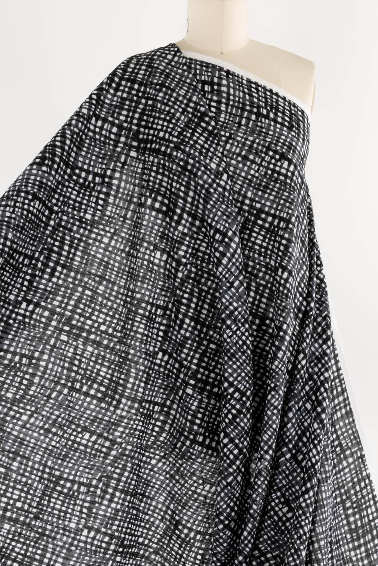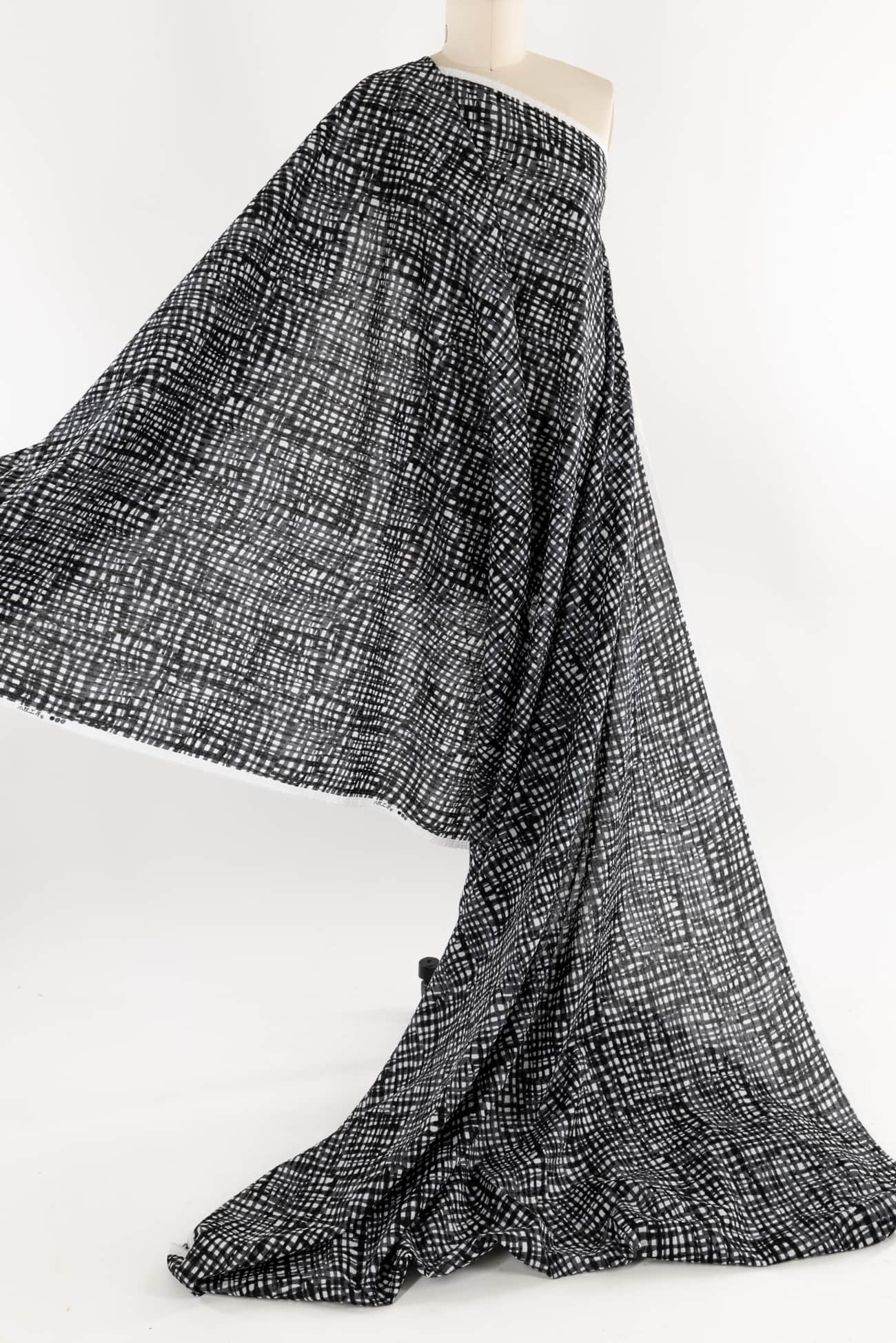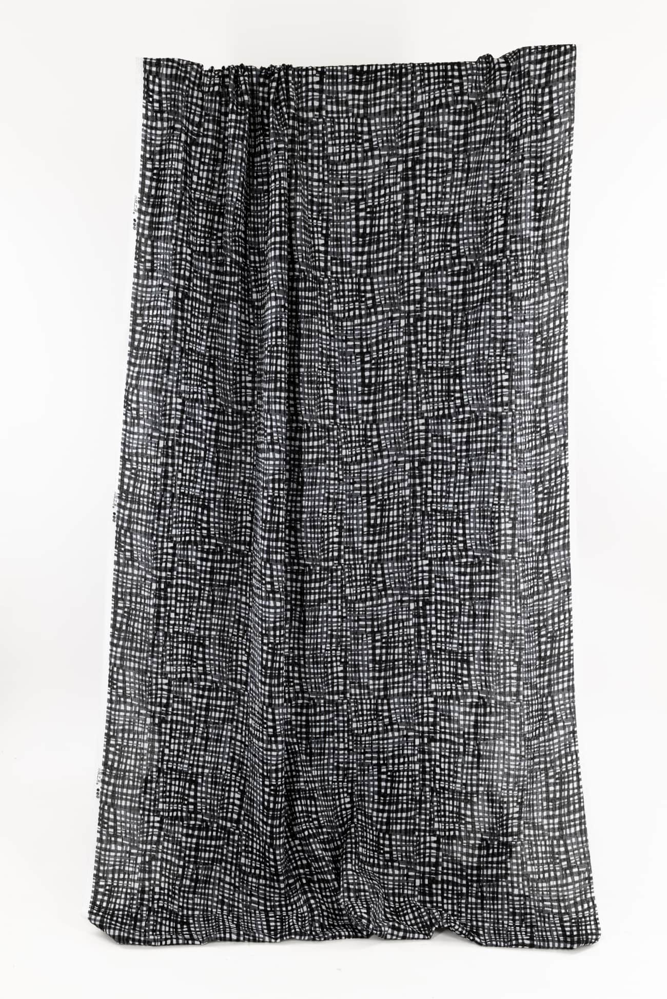 Exceptional seersucker in a beautiful hand-painted black on white check from a Japanese mill. The softly crimped texture of seersucker ensures it does not cling, delivering cool comfort even in the hottest climates. Perfect for the heat of summer whether you are in city or country. Lovely shirting/dress weight with an appealing soft cool lightly textured hand, supple drape and 11" repeat. Perfect for a shirt, blouse, dress, tunic, soft pants, caftan, kimono, men's or children's.
