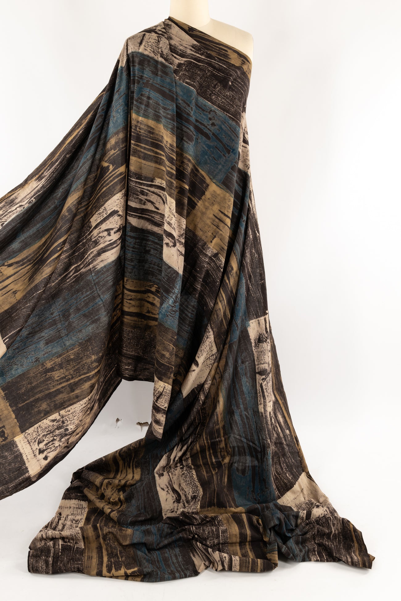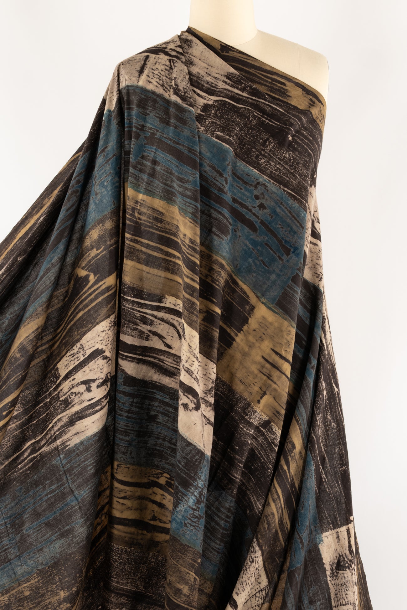 Hand blocked modern abstract print in warm earthy browns punched with muted blues in a quietly beautiful cotton produced in India where centuries of textile traditions continue. Produced in small 6 meter lengths by skilled craftsmen and women. Shirting weight, opaque, with a soft hand and drape. Right for a dress, skirt, shirt, tunic, caftan, kimono, jumpsuit, soft pants, accessories, home decor and men's and children's clothes. One way design, 24" repeat.