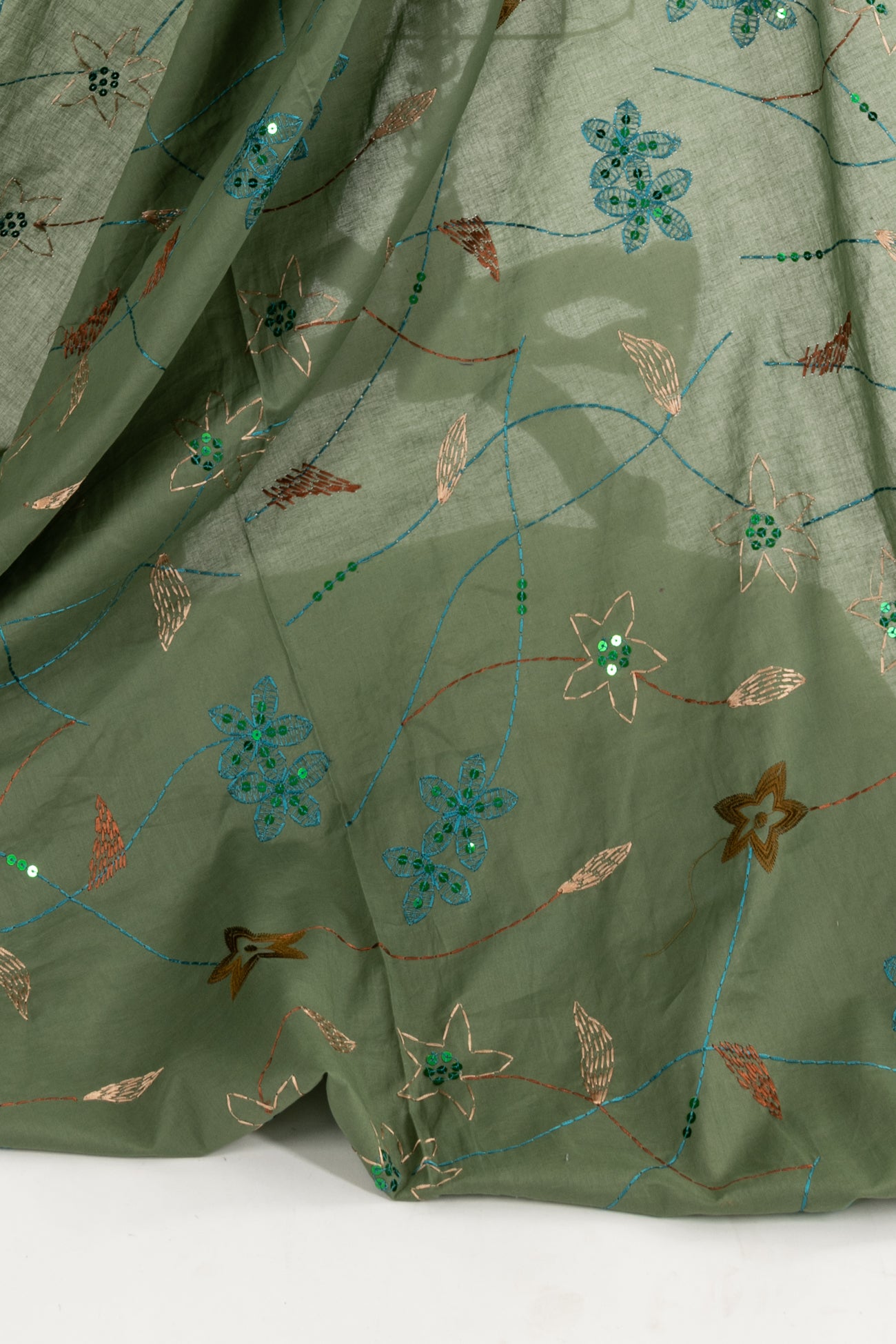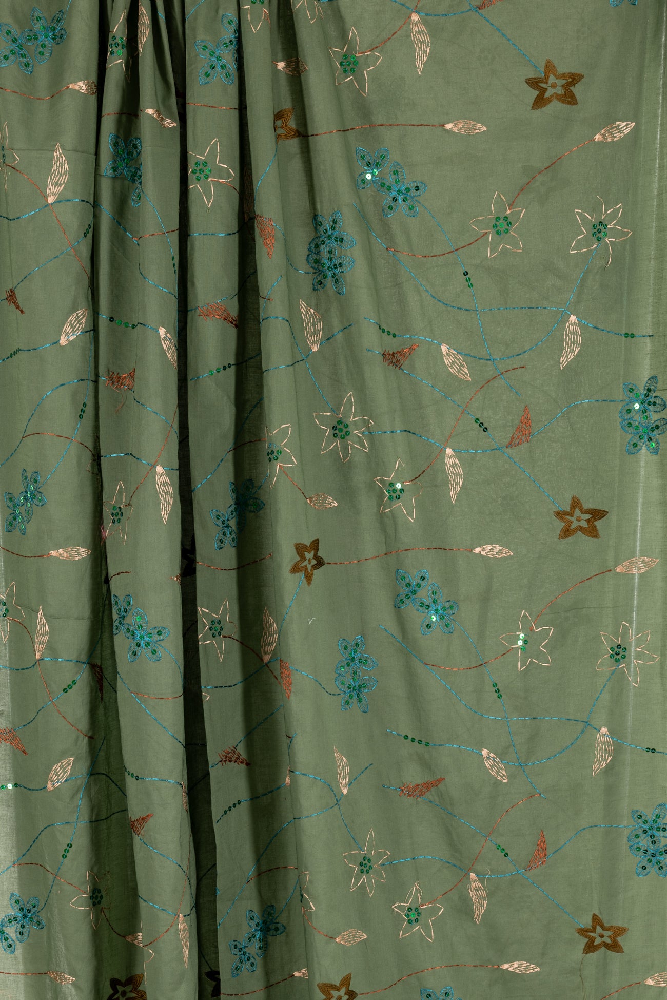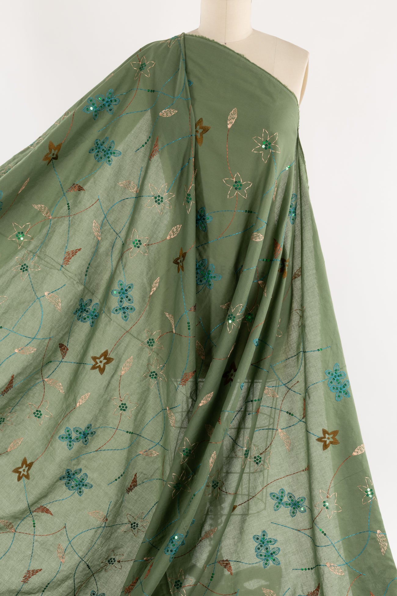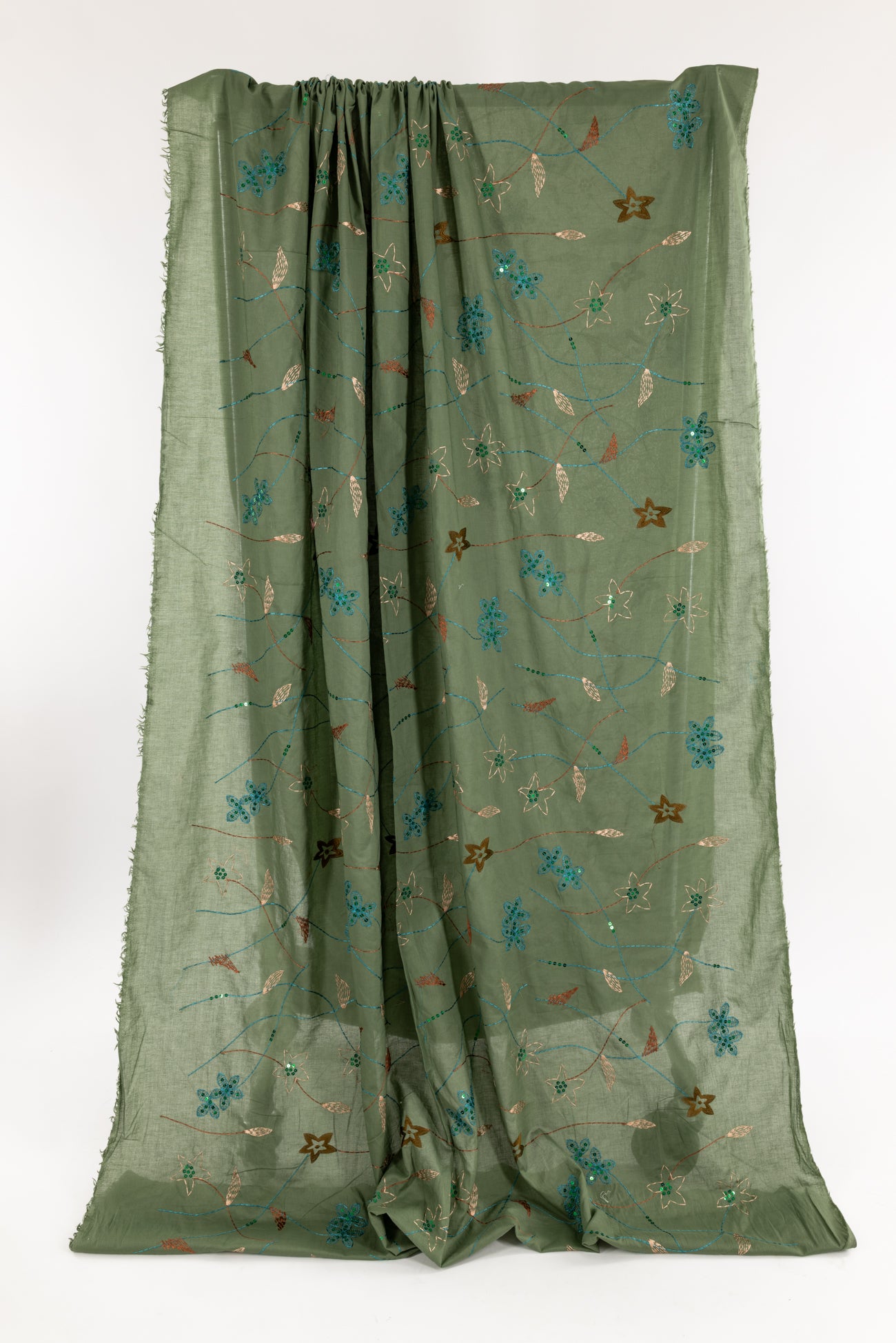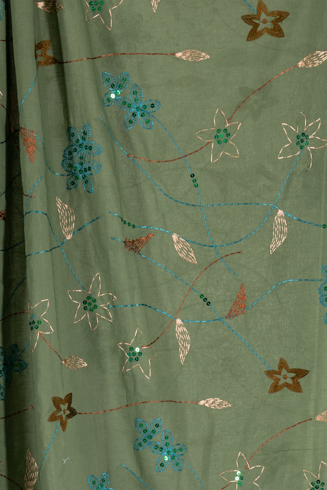 Soft olive green cotton lawn, embroidered with multicolored leaves, stars and flowers with a subtle scattering of sequins. Southern California designer deadstock is lightweight with a smooth cool matte hand, softly textured flowers embroidered in aqua, deep olive green, gold and copper, a soft airy drape and a 17½" repeat. Right for a dress, skirt, shirt, top, tunic , skirt, caftan, kimono, soft pants.