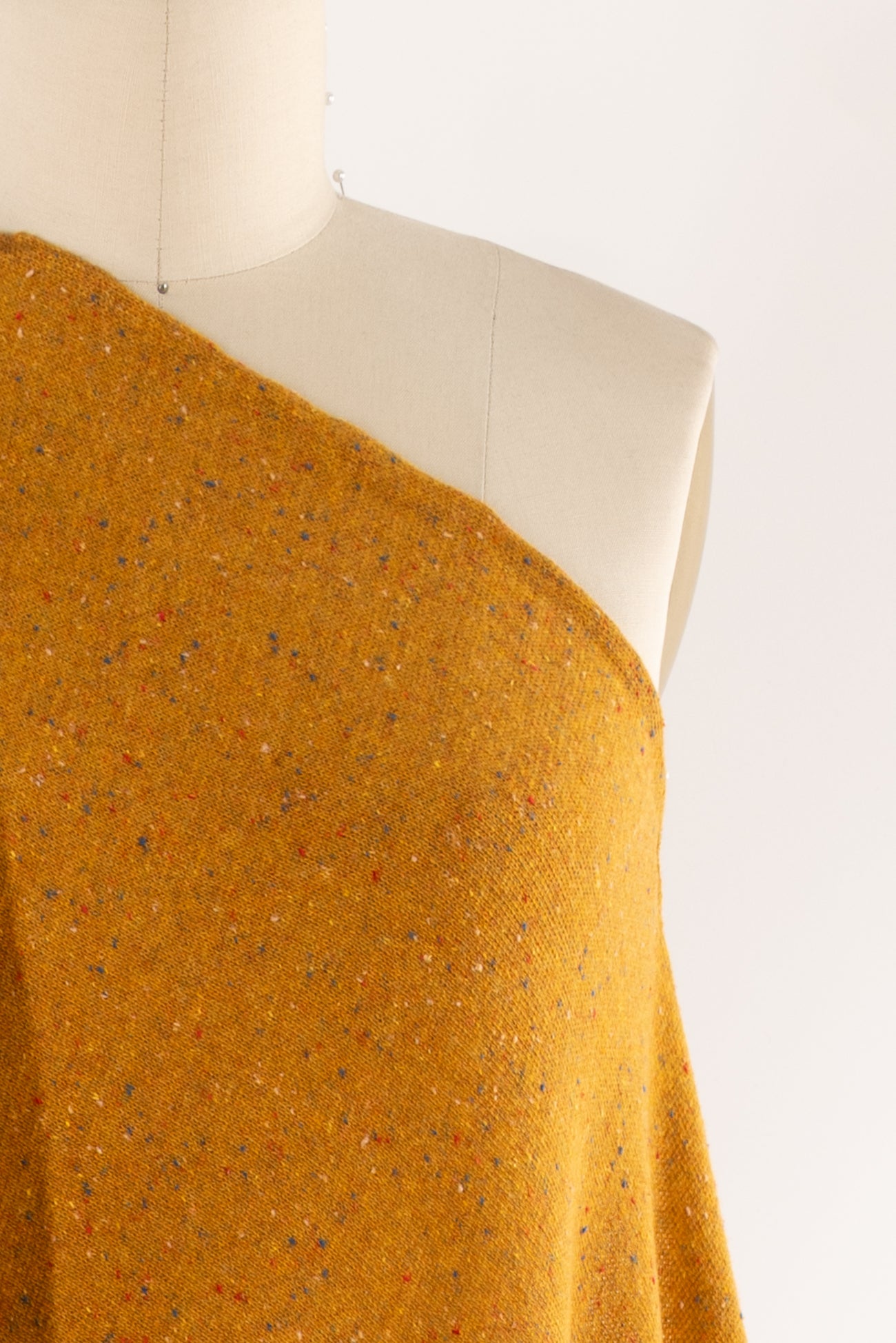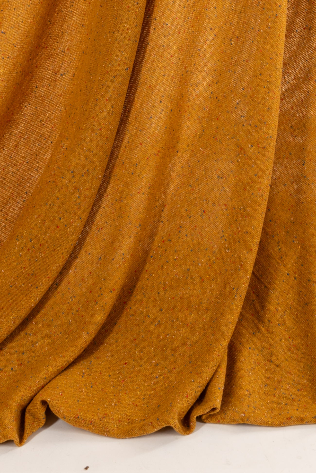 Classic sweater knit in golden mustard with tweedy bits of blue and magenta, fine quality deadstock from an Italian mill. Light/mid-weight with a lightly textured knit face, some crosswise stretch with little recovery, some rolling at the cut edge and a soft drape. Right for a sweater, cardigan, t-shirt, tunic, light jacket, or vest.