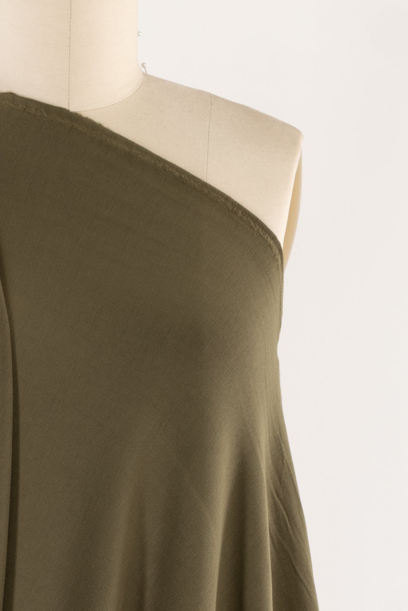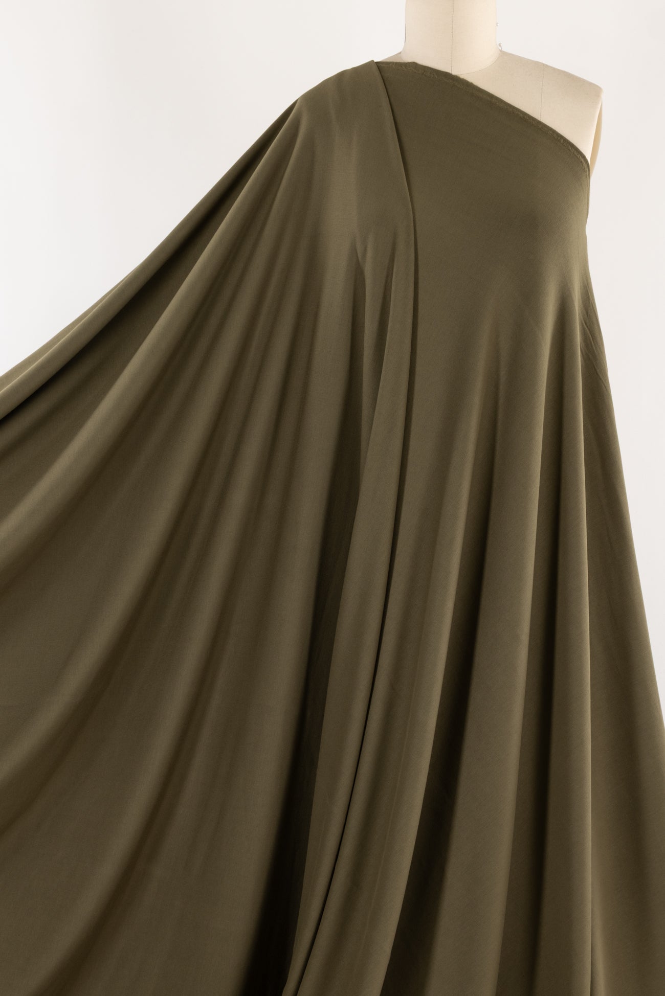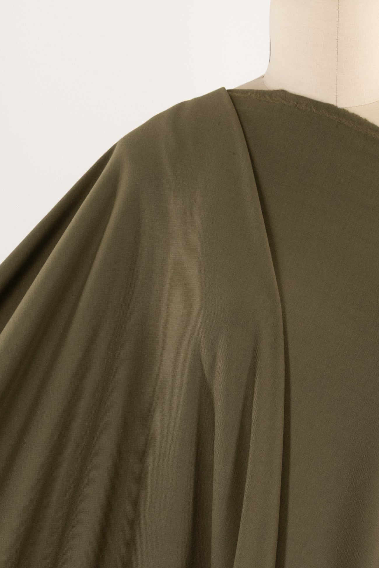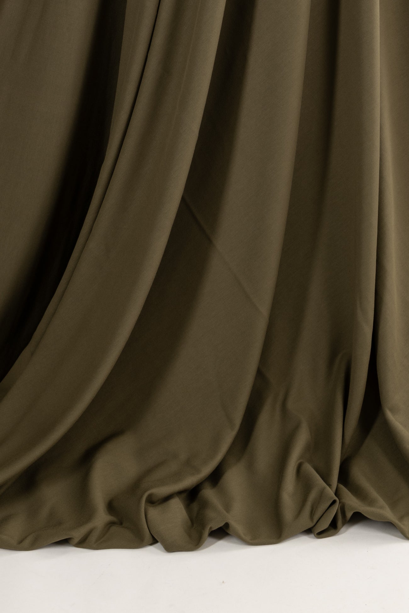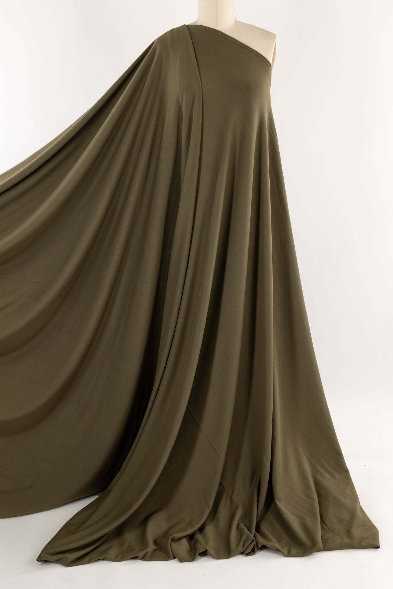 Classic soft warm olive green in a super soft, cozy and drapey fleece in an ideal modal rayon/lycra blend. Fine deadstock from an LA designer. Think of a just right sweatshirt type fabric without any stiffness and with a lovely drape and a super appealing soft hand on both sides of the fabric. The back side is softly brushed fleece, the face is smooth yet soft. Four-way stretch with some rolling at the cut edge, but no raveling and I'd consider using parts of the back side as a design element. The mid-weight is right for a simple top, tunic or t-shirt, a hoodie, yoga, loungewear, a light jacket, men's or children's.