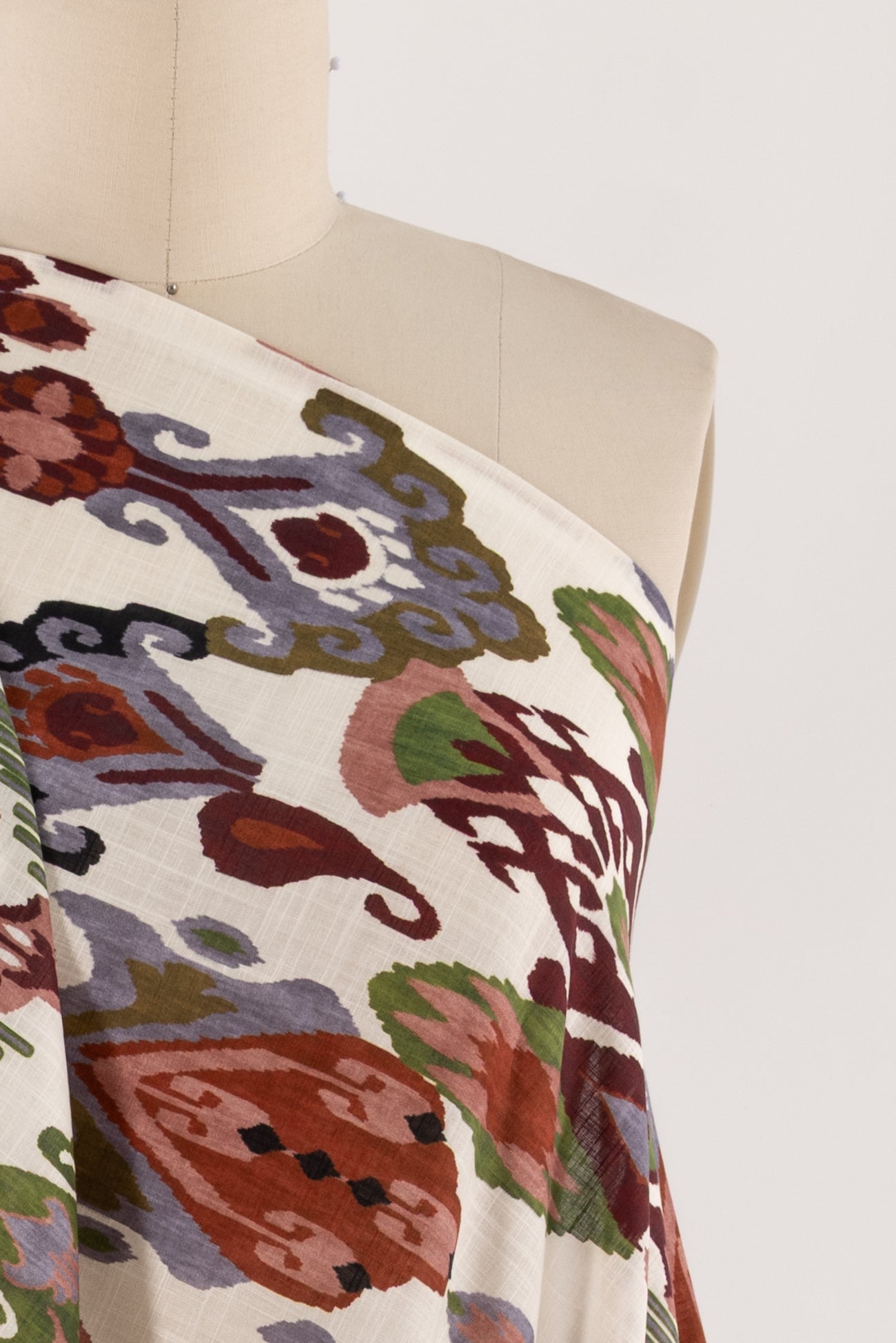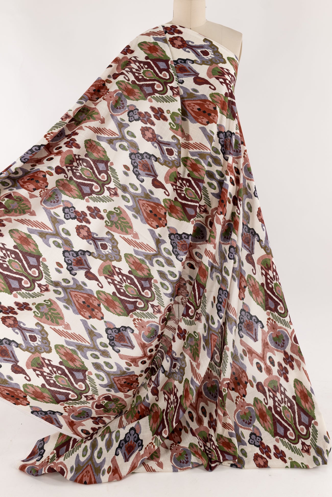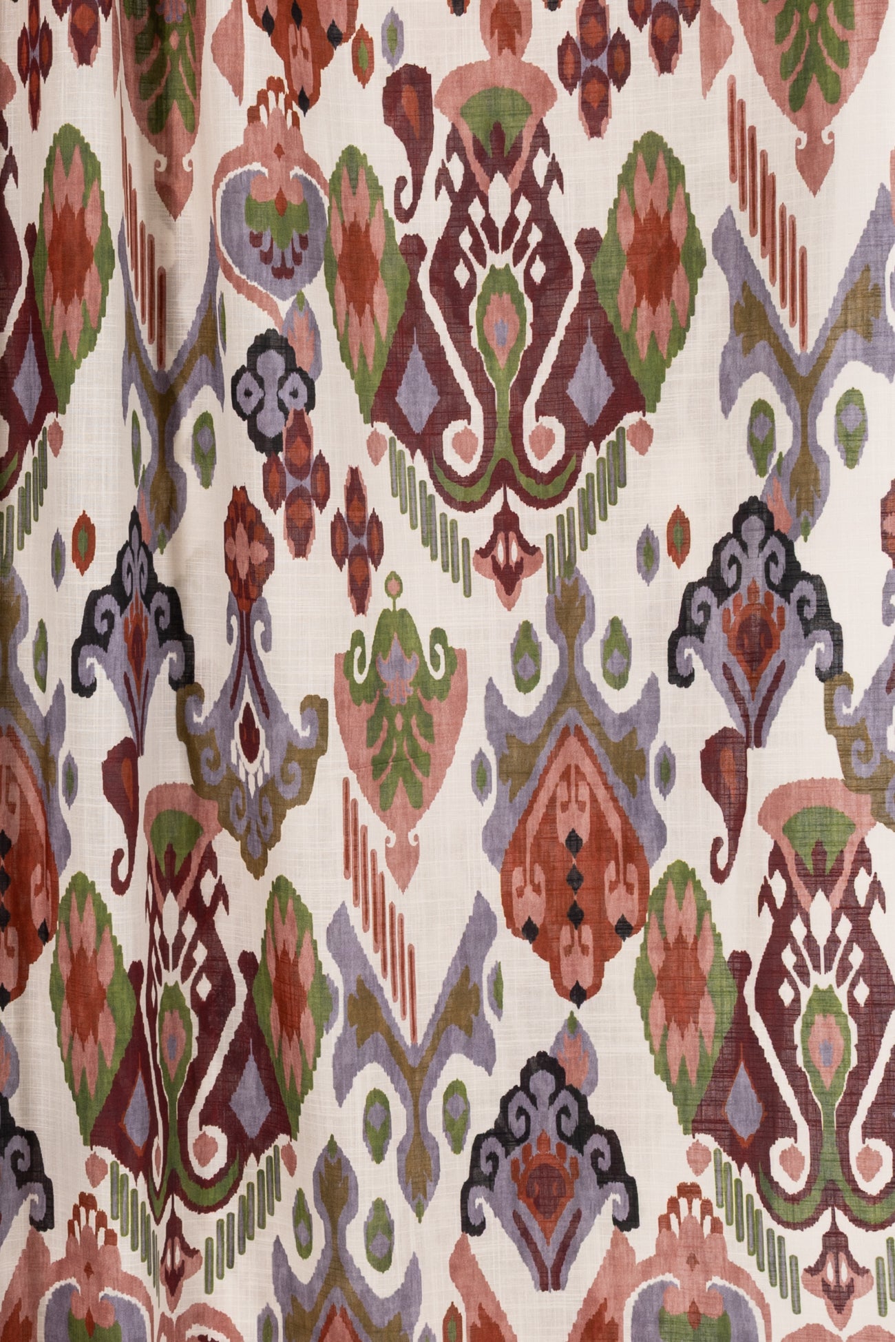 Warm tones of aubergine, lavender, rust, green, and black enhance an appealing array of stylized design elements. Designer deadstock produced in an Italian mill on fine-grained cotton. Lightweight with a cool, dry hand, 30½" repeat, and airy drape. Right for a dress, shirt, tunic, skirt, soft pants, caftan, kimono, or loungewear.