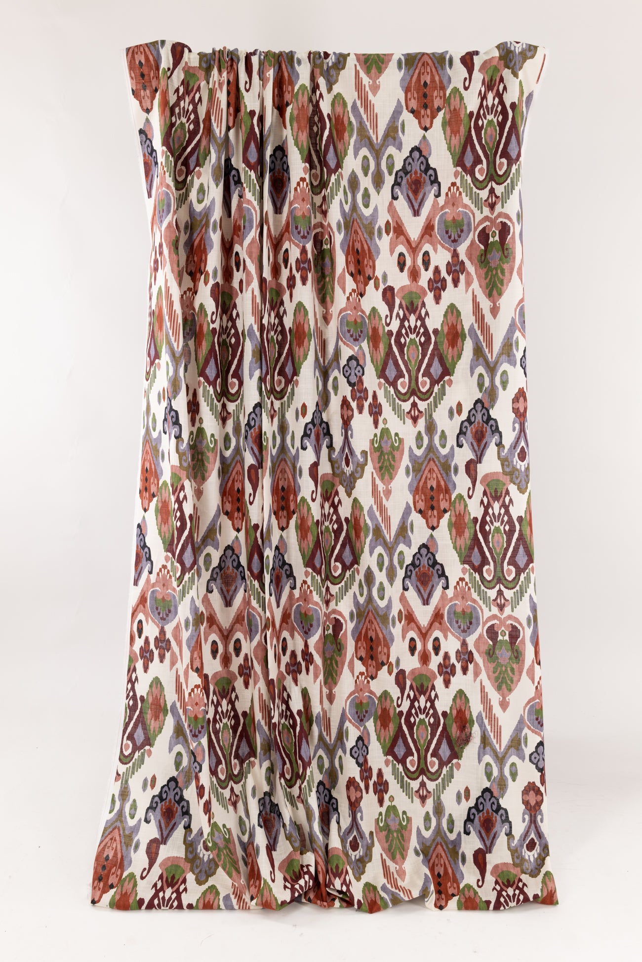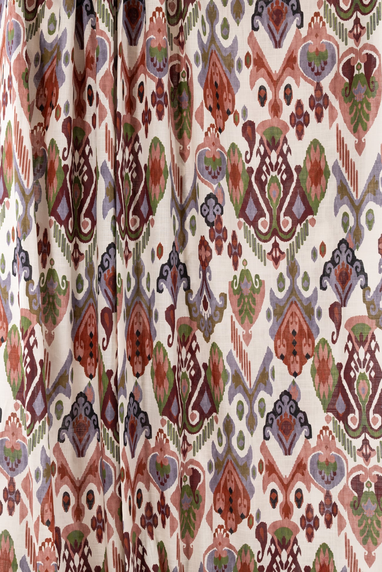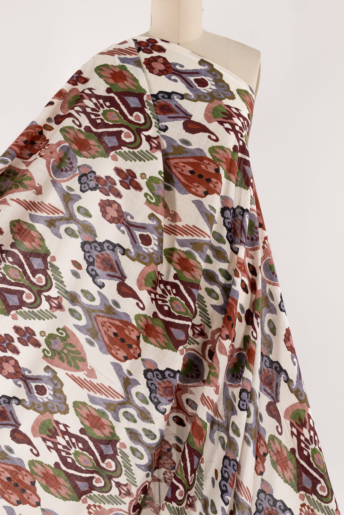 Warm tones of aubergine, lavender, rust, green, and black enhance an appealing array of stylized design elements. Designer deadstock produced in an Italian mill on fine-grained cotton. Lightweight with a cool, dry hand, 30½" repeat, and airy drape. Right for a dress, shirt, tunic, skirt, soft pants, caftan, kimono, or loungewear.