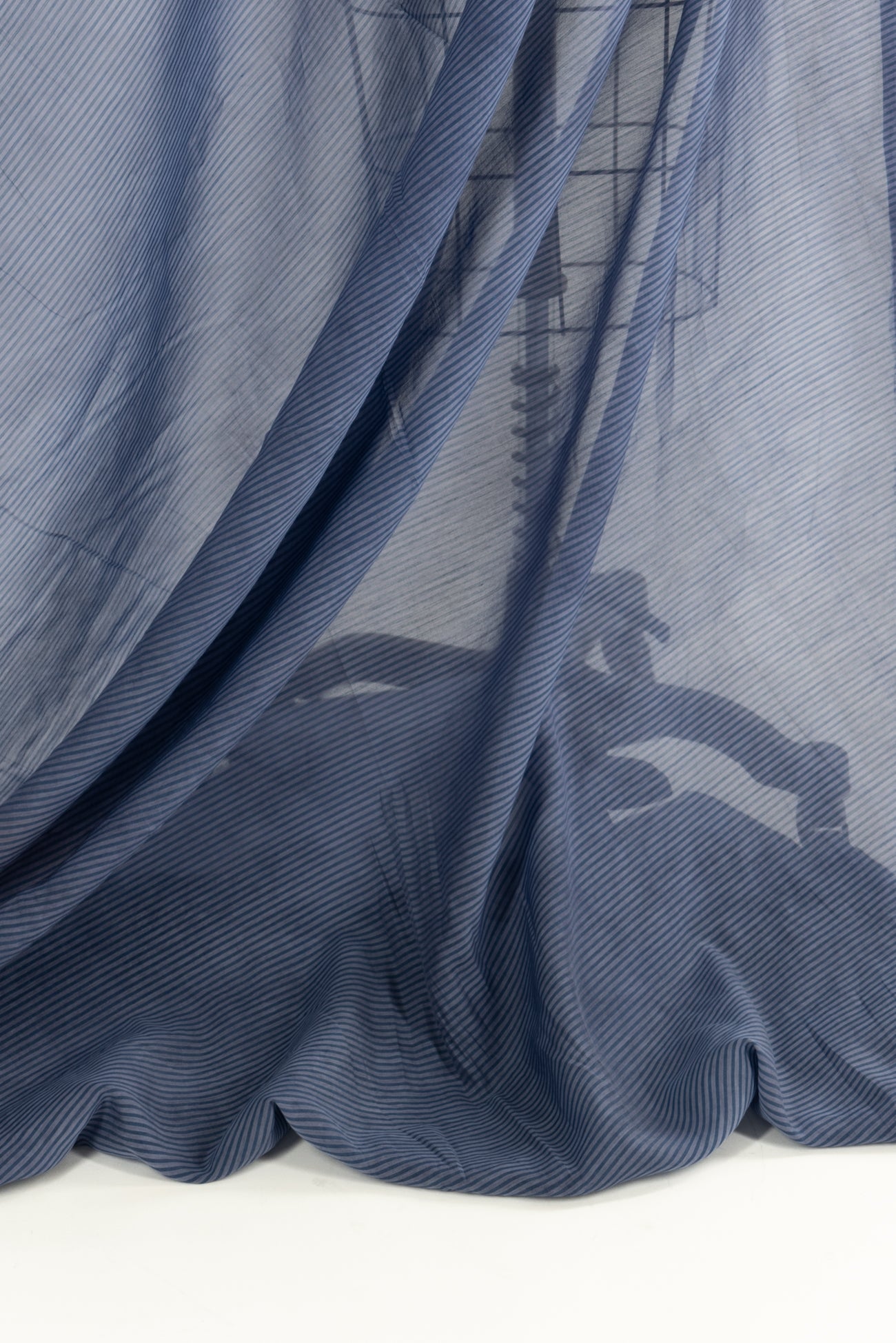 Tiny blue on blue yarn dyed stripes on a fine grained silk/cotton blend, deadstock from an Italian mill. Light/shirting-weight, semi-opaque with a soft smooth hand and soft drape. Right for a dress, skirt, tunic, blouse, shirt, soft pants, kimono, caftan, men's, or children's.