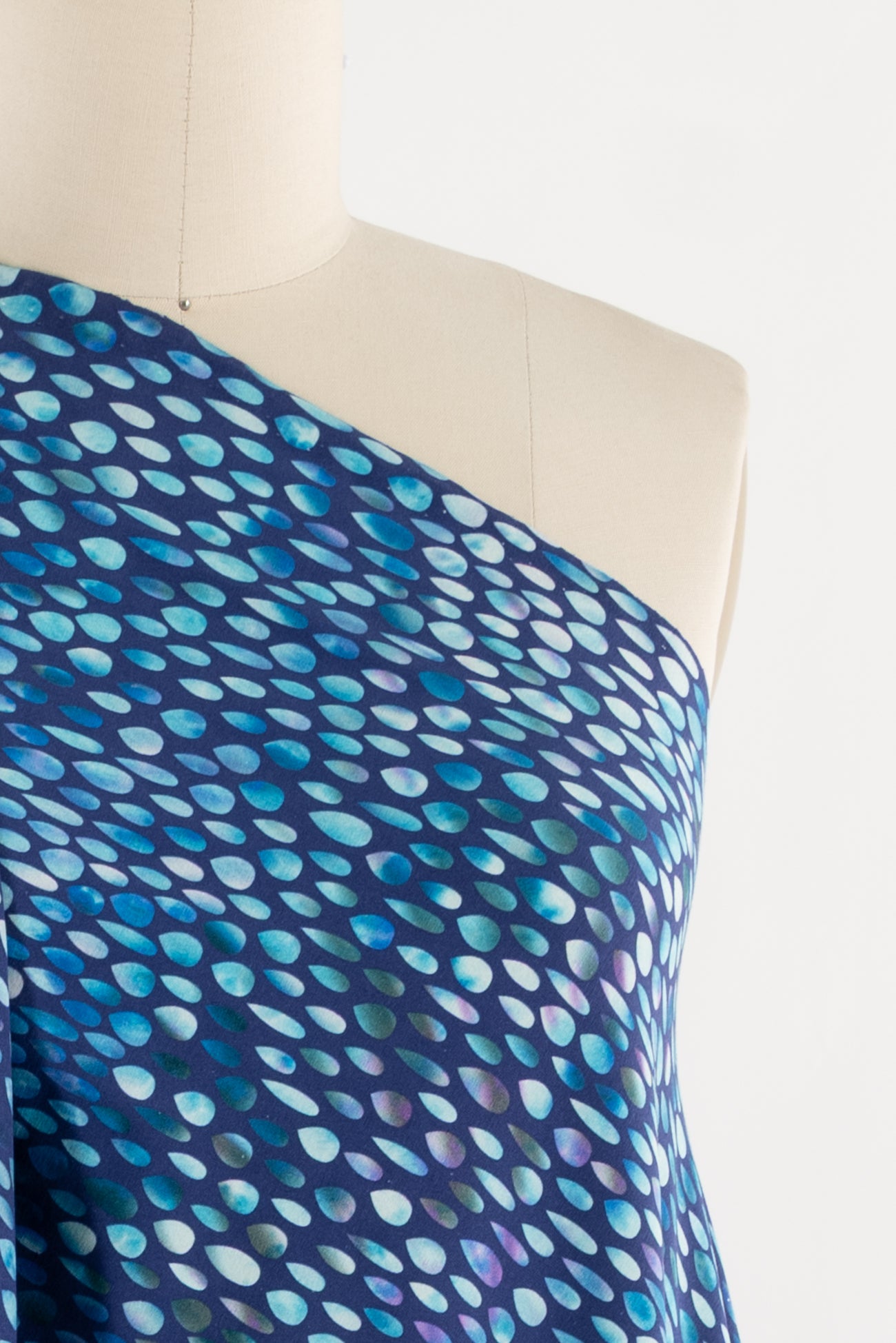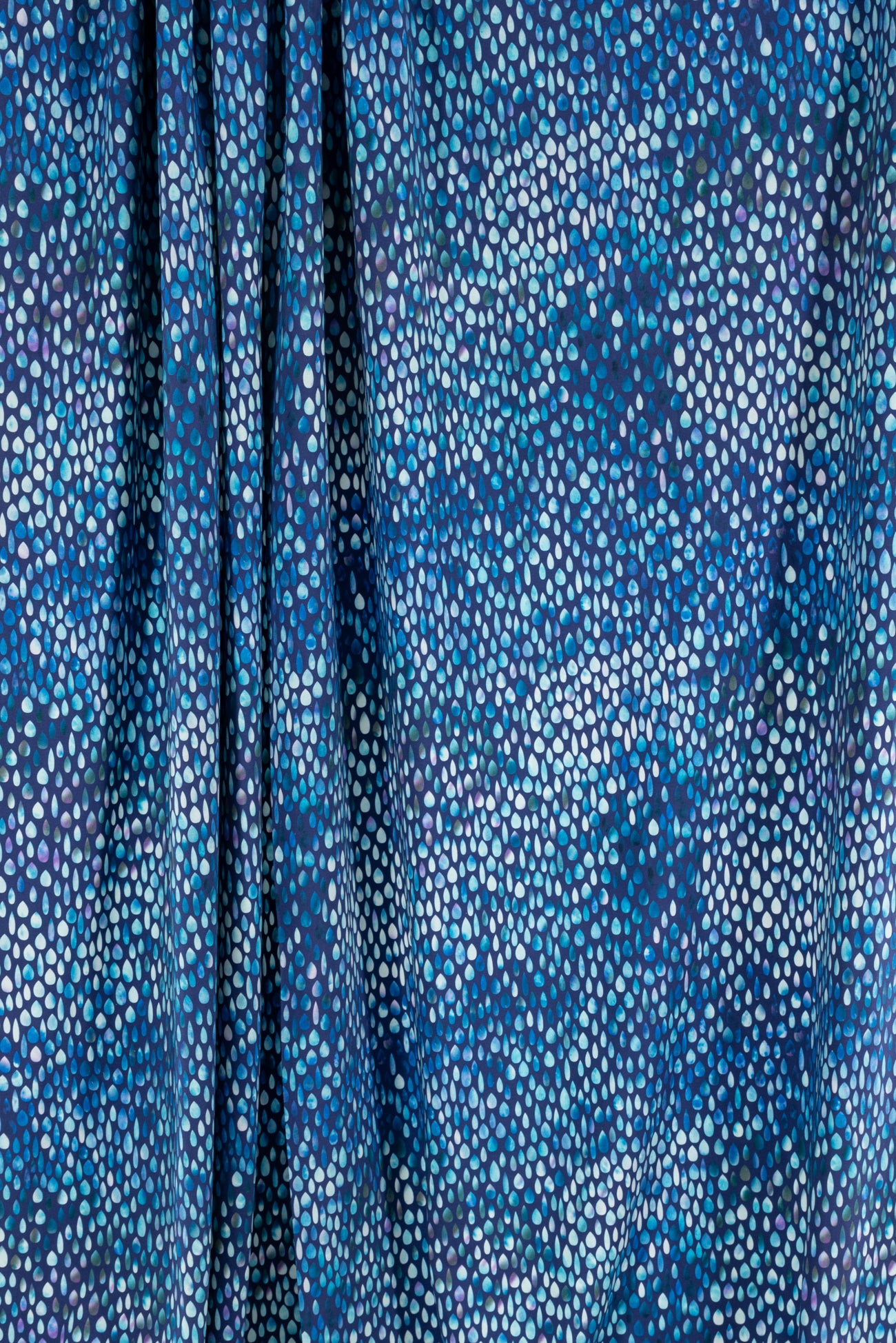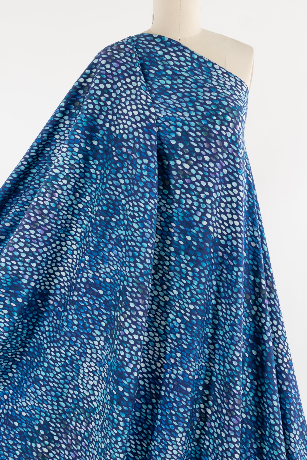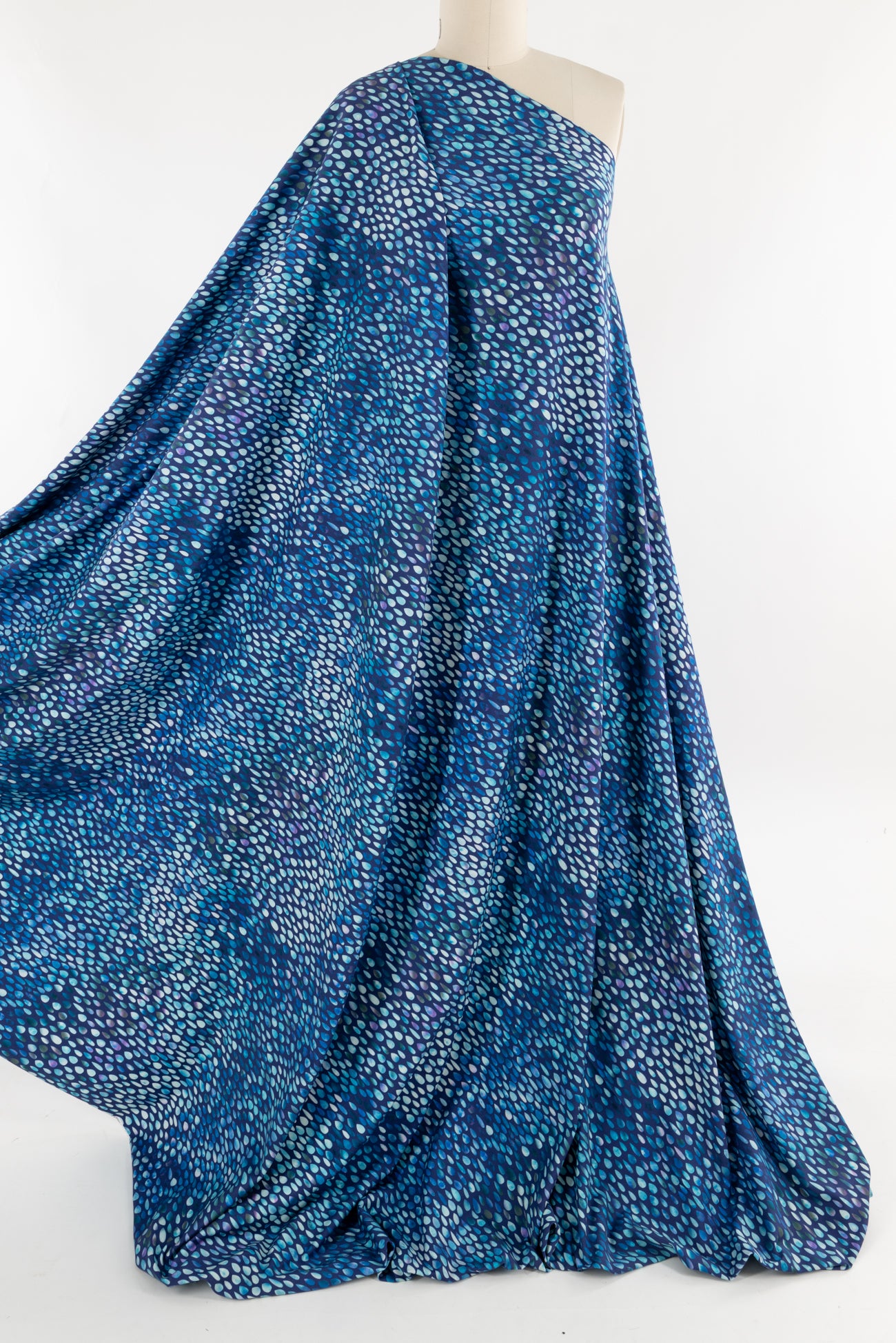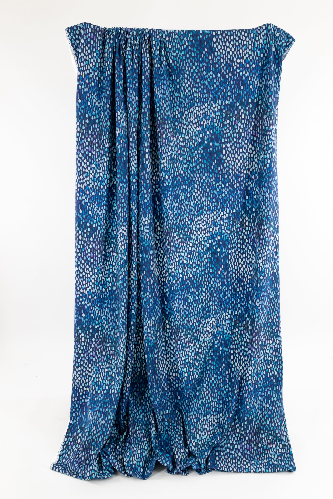 A splendid shower of elongated dots in shades of blue with violet accents in a digital print on an impeccable European quality cotton/spandex jersey knit, produced in Denmark. Light/mid-weight, opaque, and will skim the body in a flattering way. It has a soft, smooth texture, fluid drape, 4-way stretch, and some rolling at the cut edge. Right for a variety of garments: t-shirt, tunic, dress, soft pants, leggings, cardigan, skirt, or loungewear, as well as children's or men's clothing. Oeko-Tex® certified.