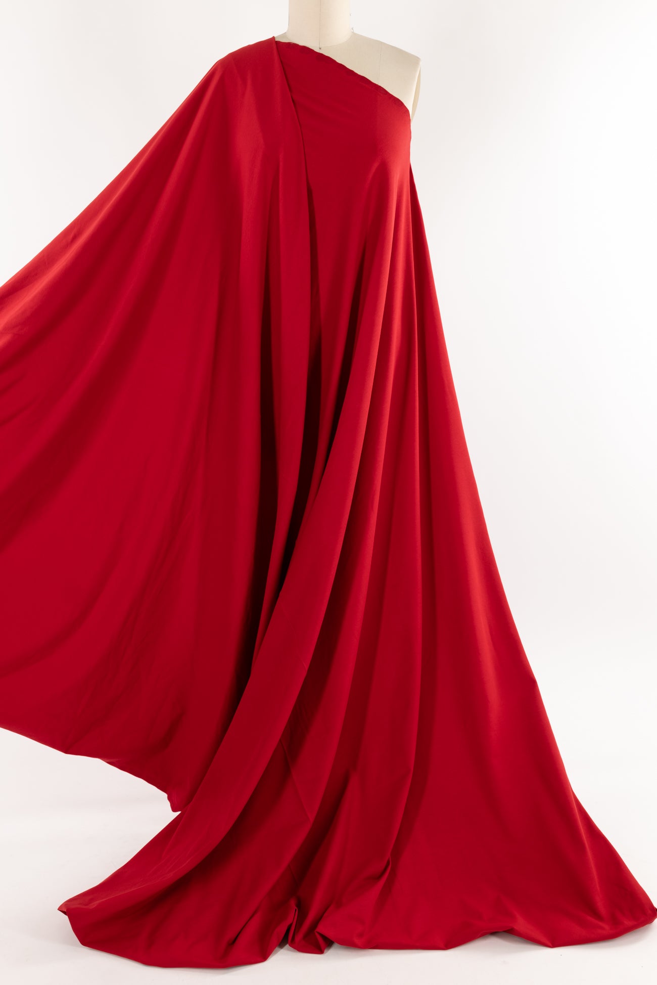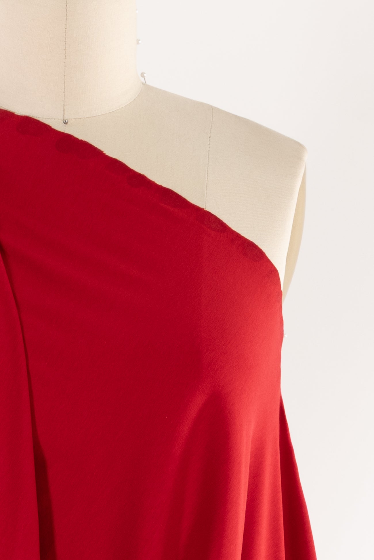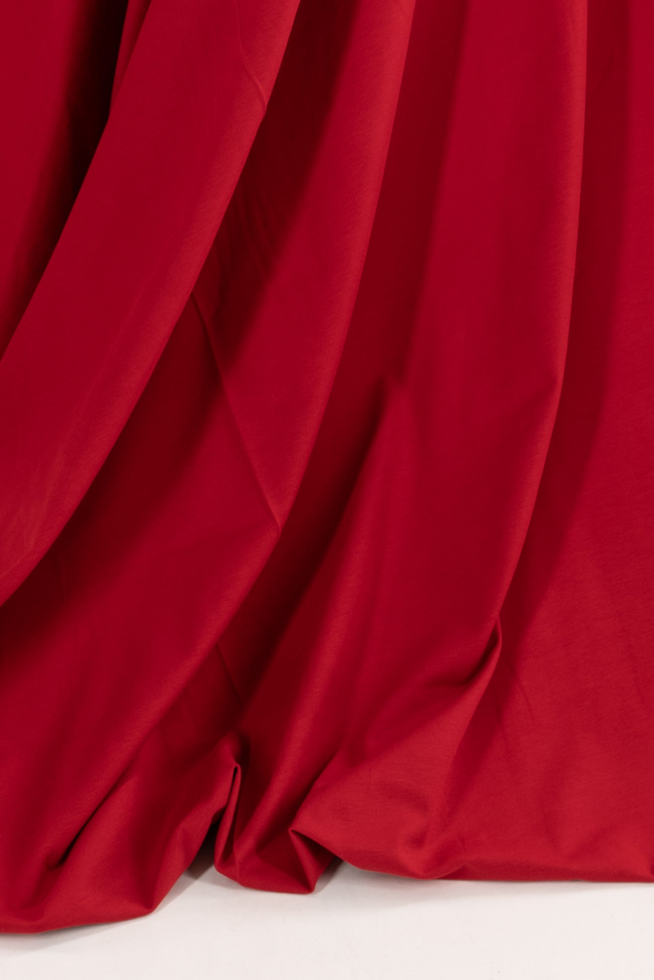 Rich clear red cotton/spandex jersey knit. Impeccable quality, light/mid-weight, opaque, with a flattering body-skimming flow, a soft hand, fluid drape, four-way stretch and some rolling at the cut edge. Right for a variety of garments; T-shirt, tunic, dress, skirt, soft pant, loungewear, caftan, kimono, or children's clothing.
