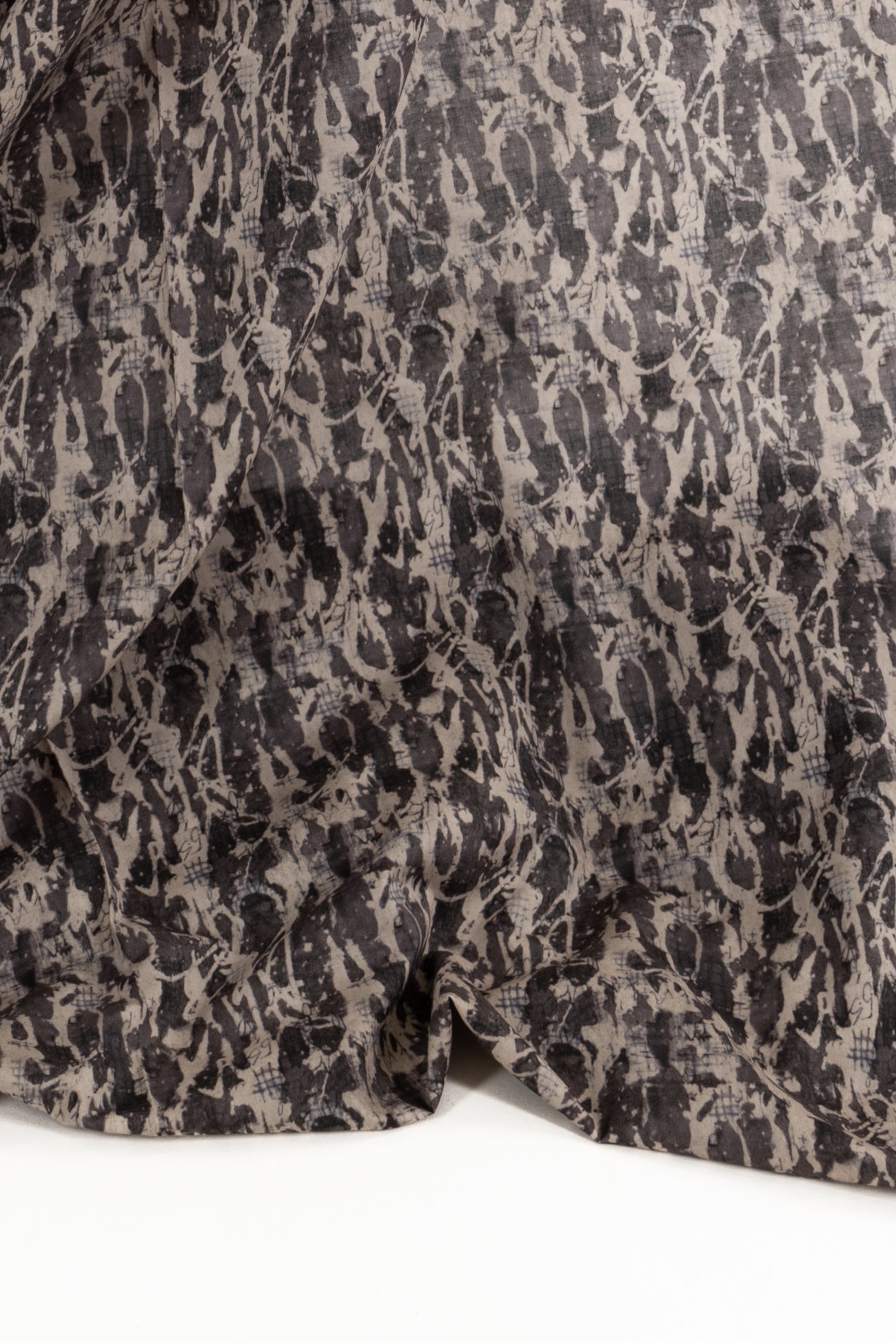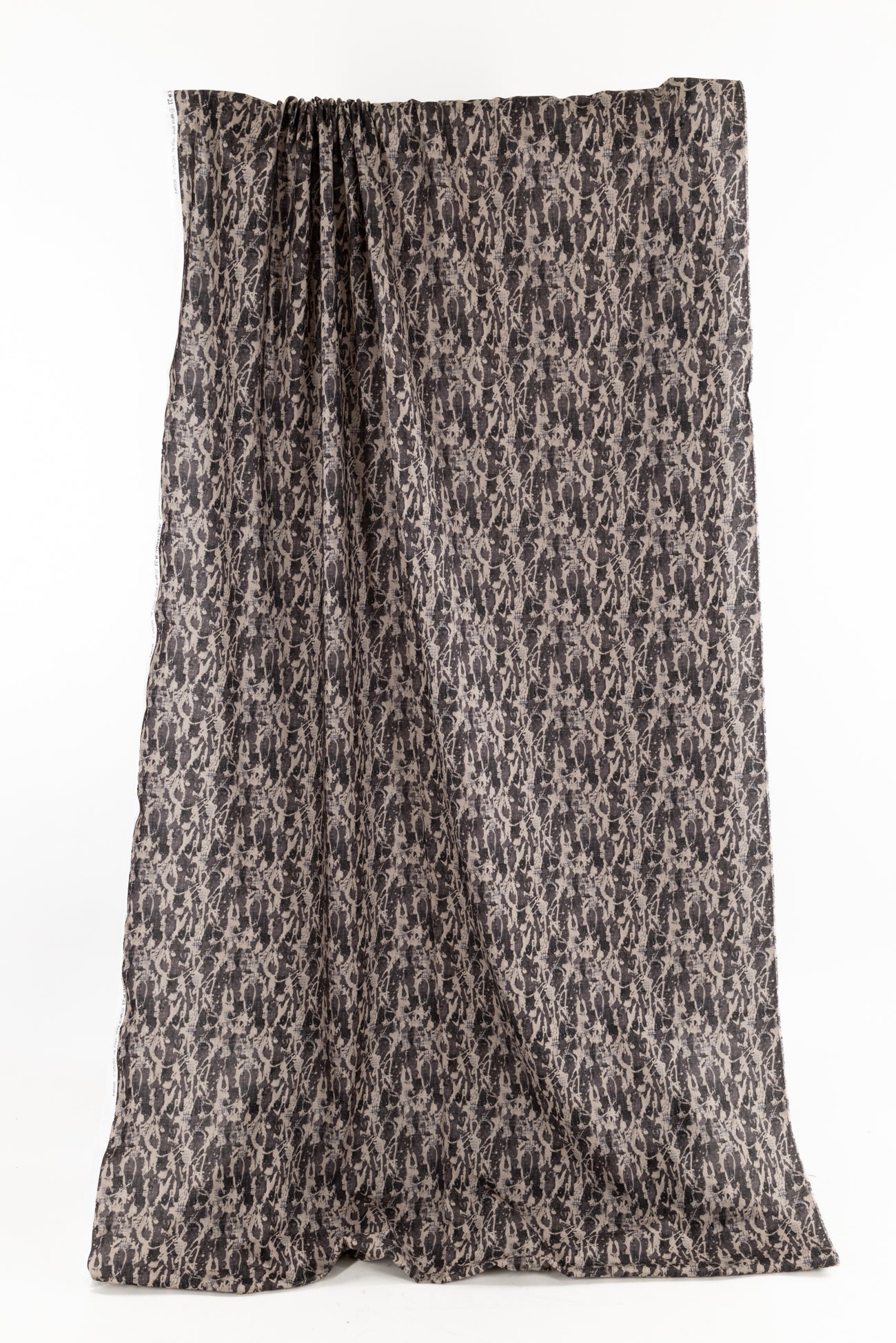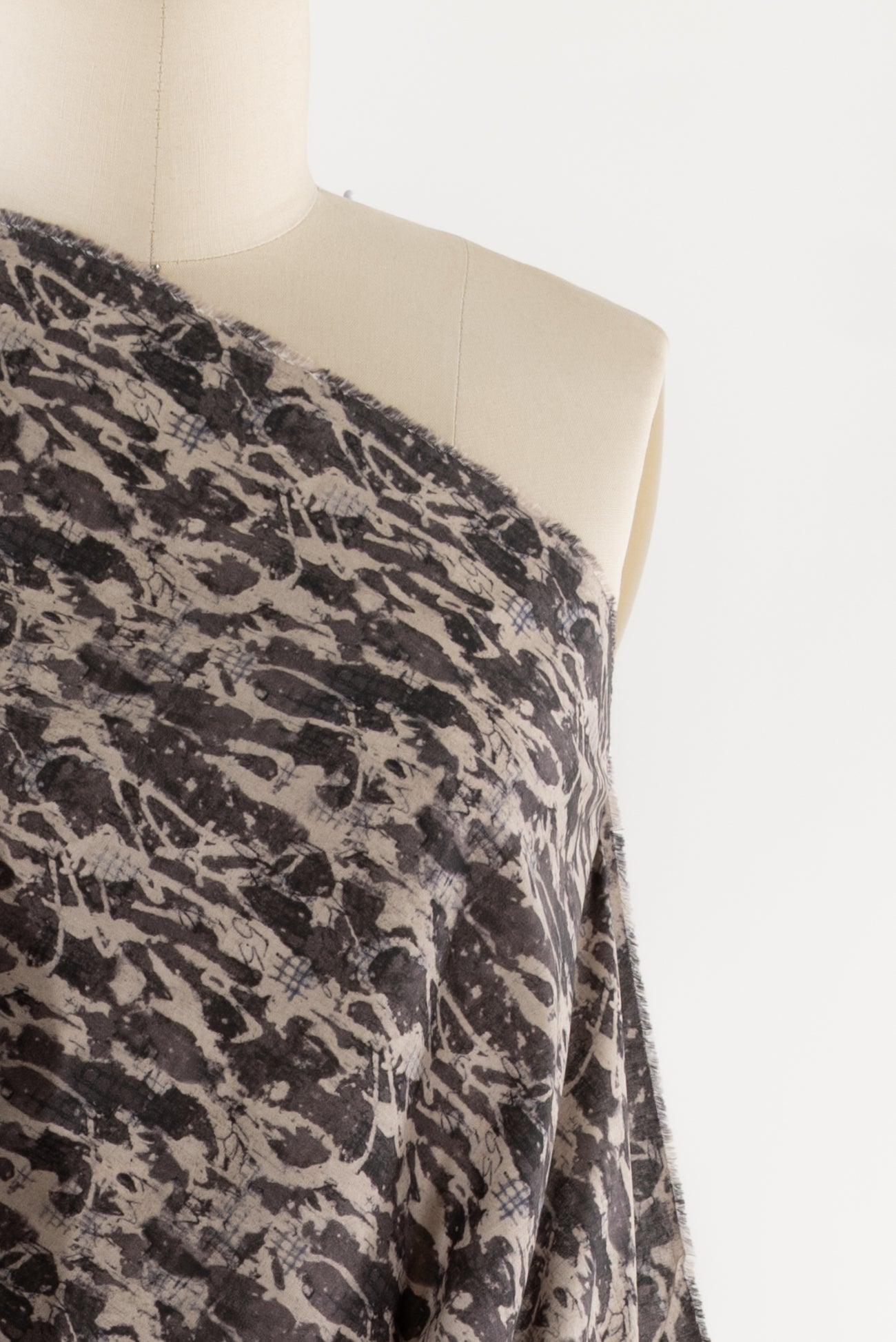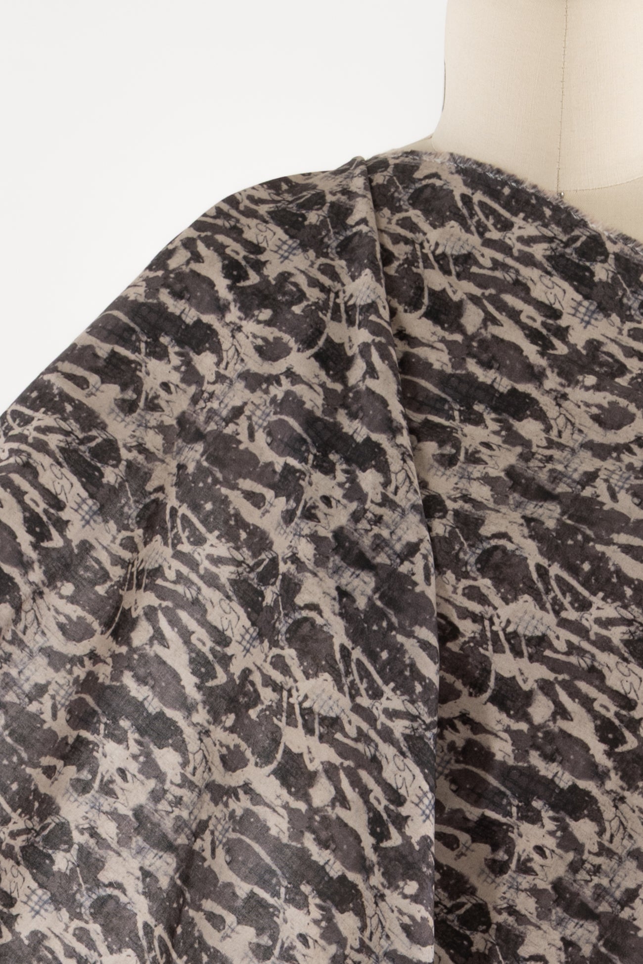 Graceful dappled gray abstract artfully overlays a hatched and texted taupe ground. Lightweight, opaque, with a smooth cool hand, a 5" repeat, and soft drape. Right for a dress, skirt, shirt, tunic, caftan, kimono, soft pant, men's, or children's wear.