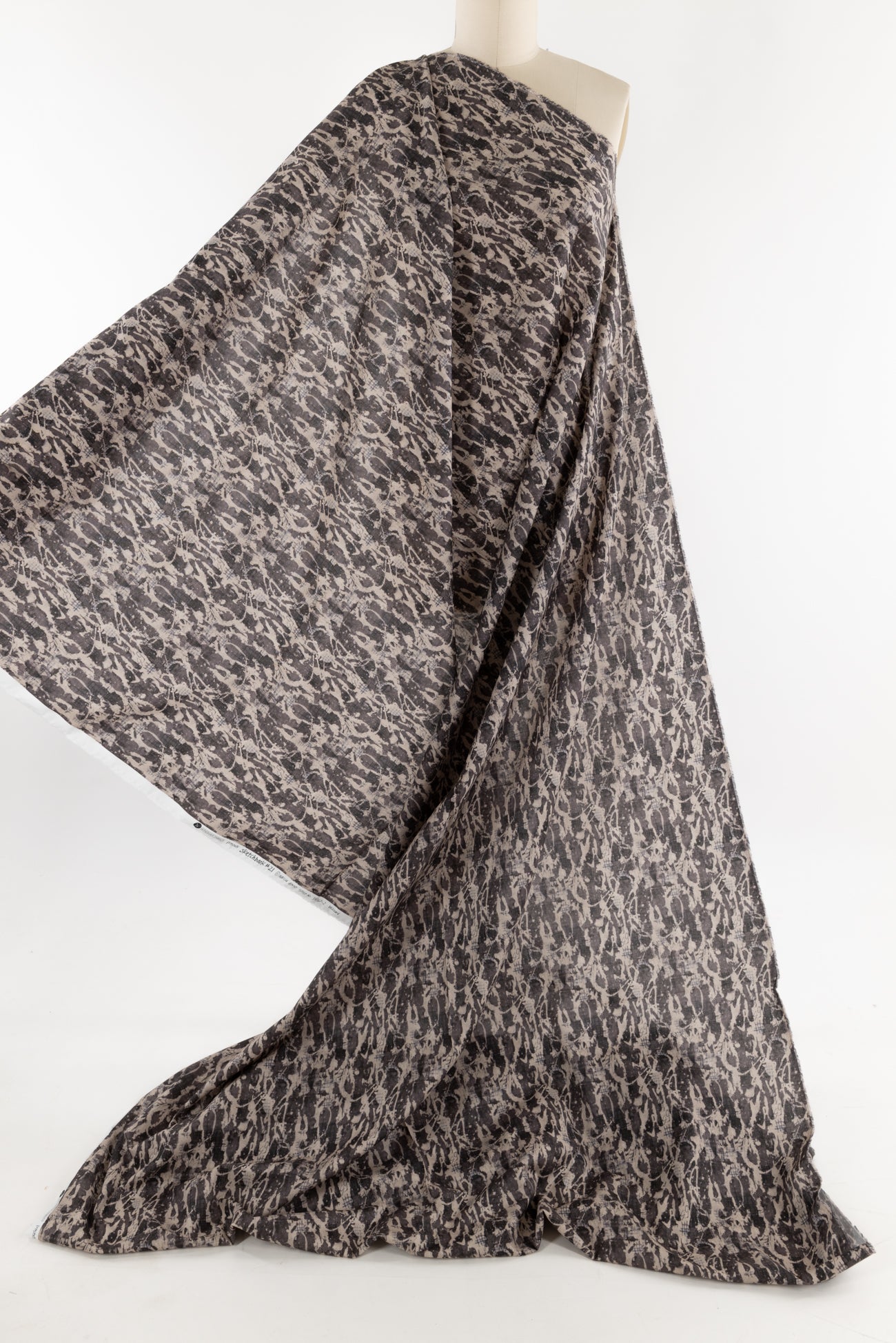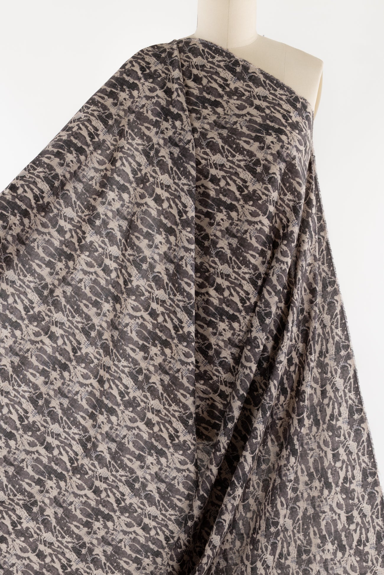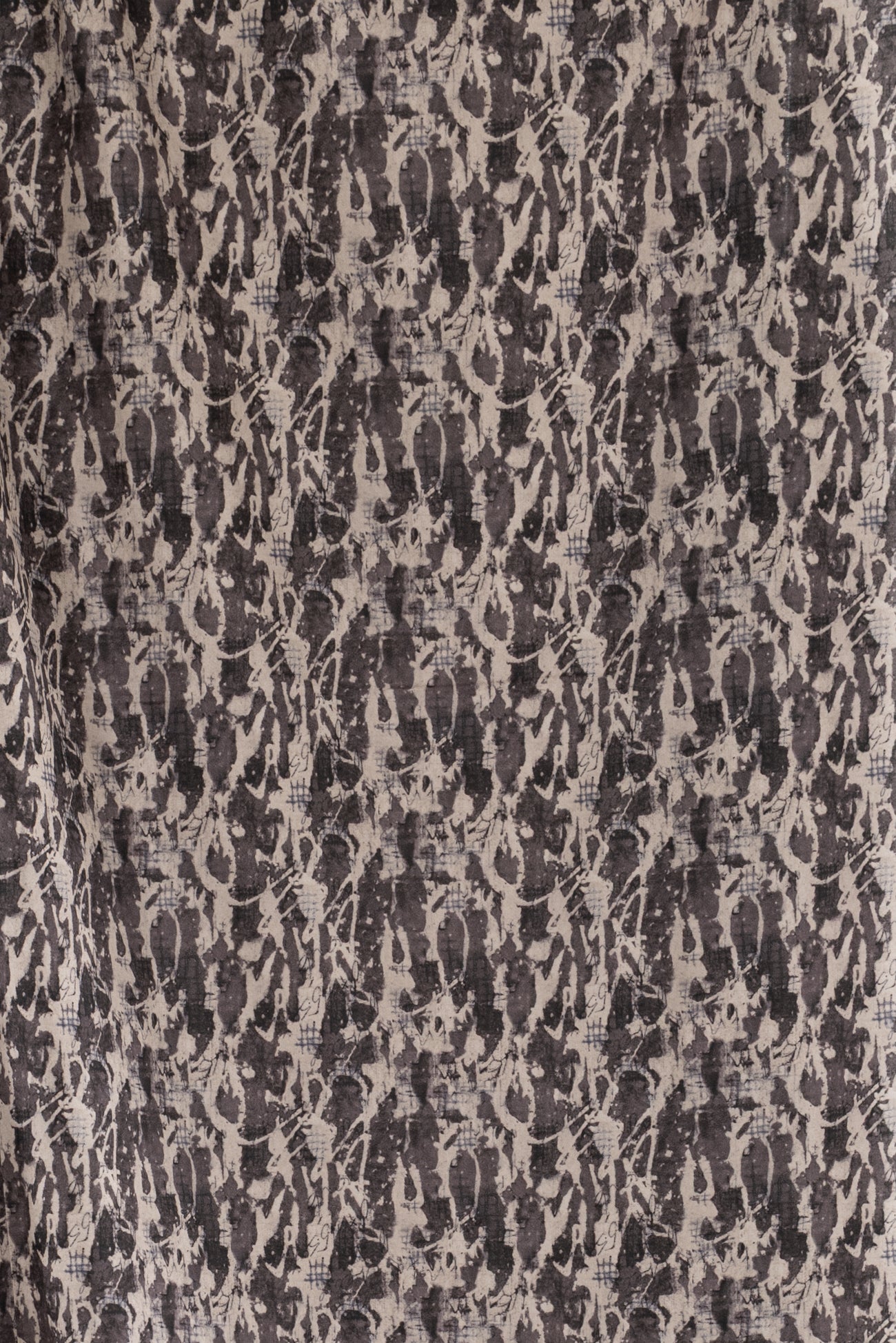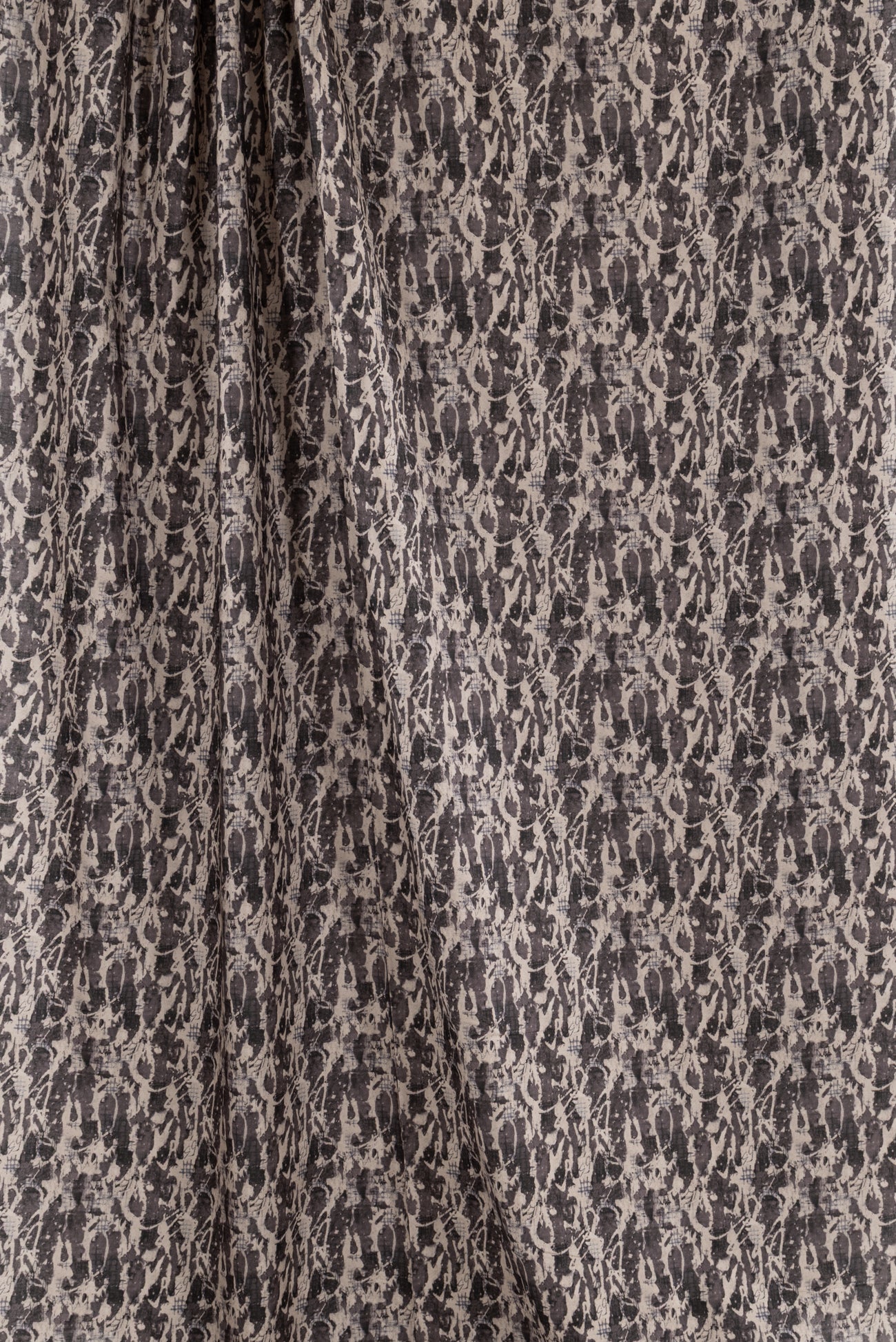 Graceful dappled gray abstract artfully overlays a hatched and texted taupe ground. Lightweight, opaque, with a smooth cool hand, a 5" repeat, and soft drape. Right for a dress, skirt, shirt, tunic, caftan, kimono, soft pant, men's, or children's wear.