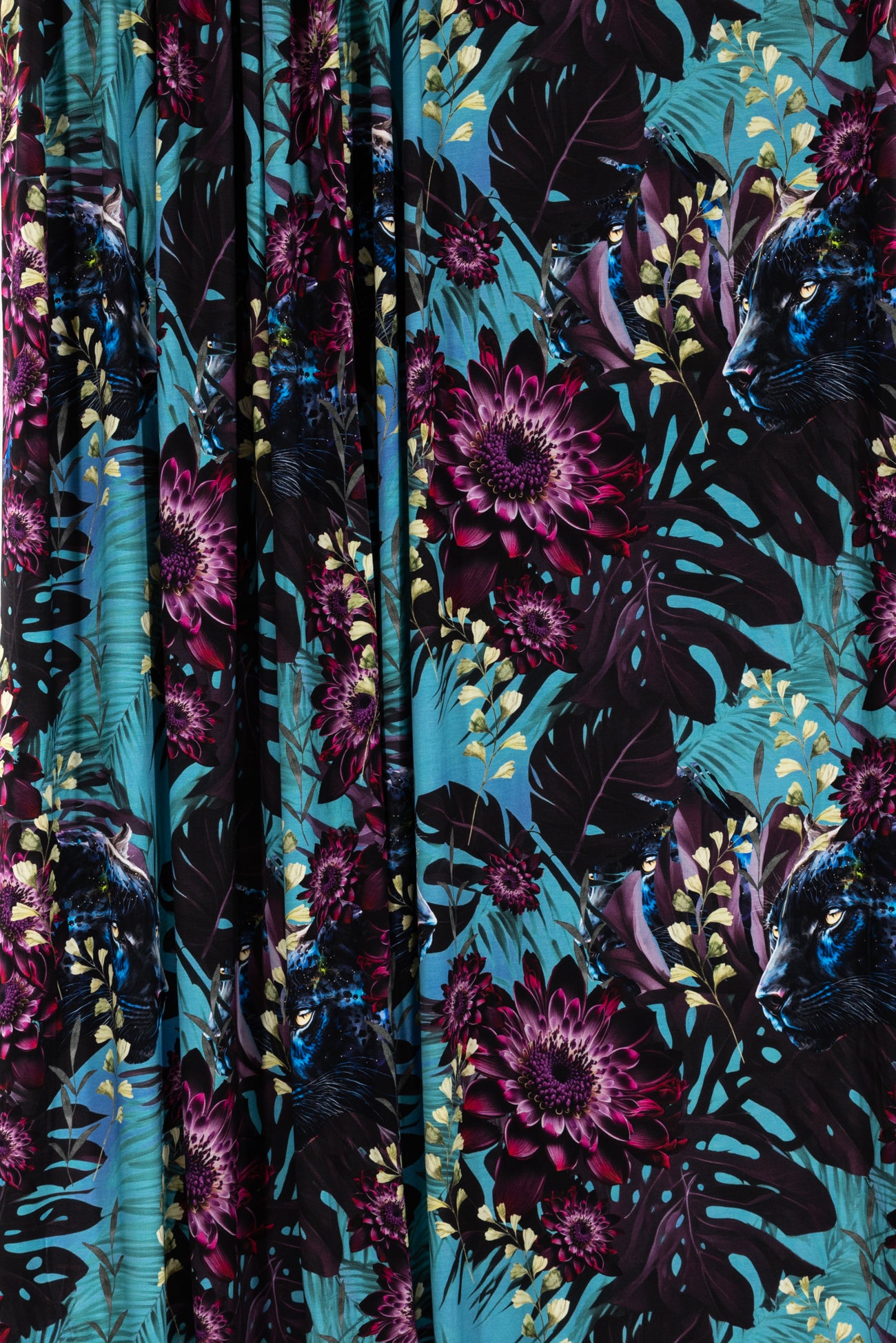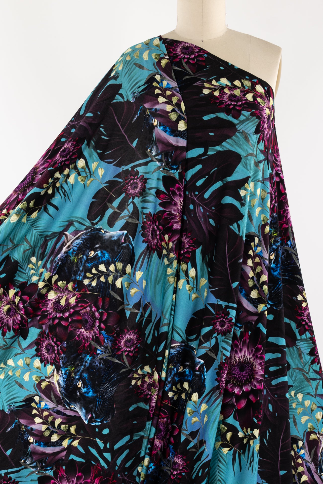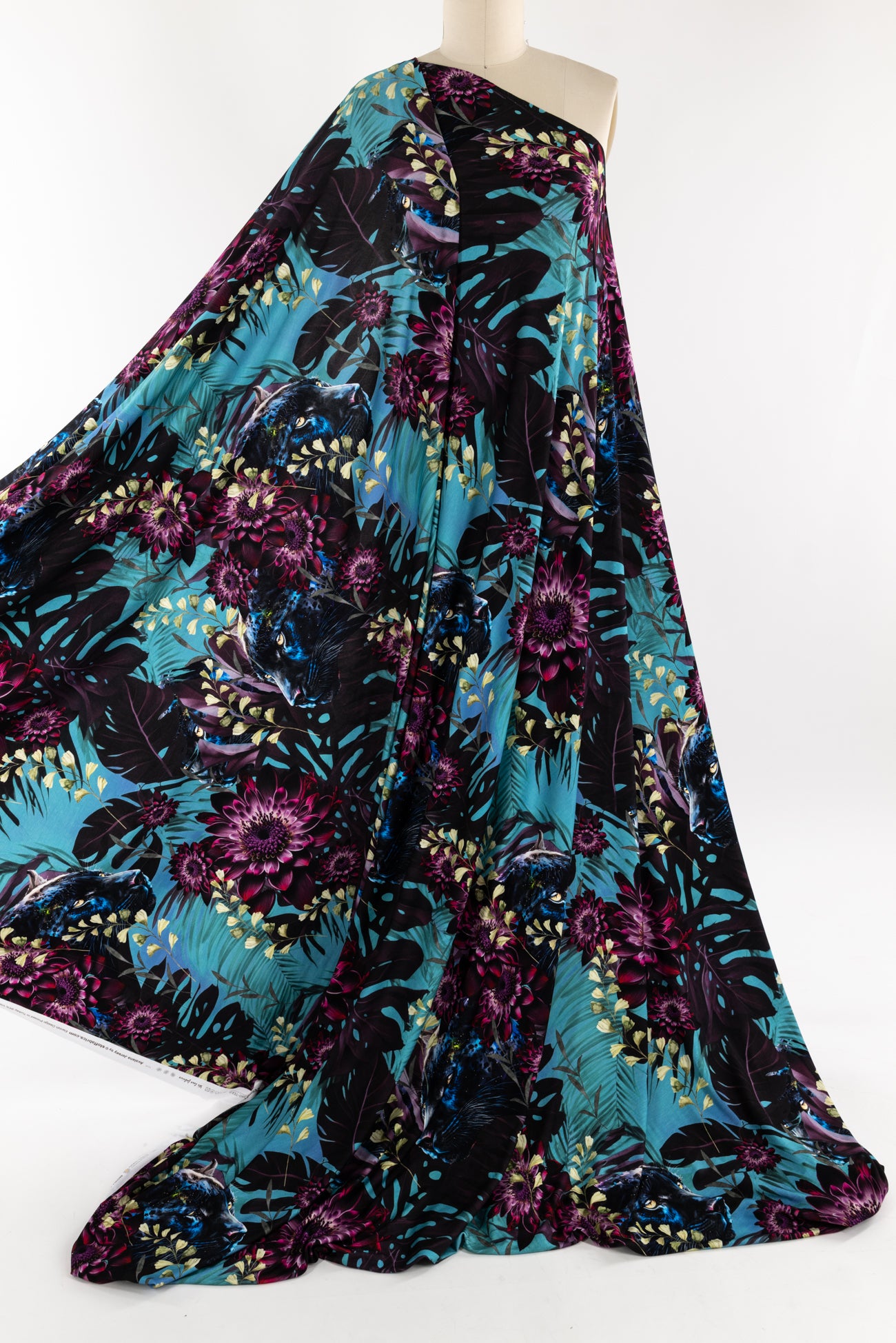 Stunning floral with hidden panthers in shades of purple, cerulean, blue and black, in a gorgeous digital print on an impeccable European quality viscose/spandex knit, produced in Denmark. Light/mid-weight, opaque, with 4-way stretch, some rolling at the cut edge and will skim the body in a flattering way. It has a soft smooth hand, 20" repeat and fluid drape. Right for a dress, t-shirt, soft pants, tunic, skirt, cardi, loungewear or children's. Oeko-Tex® and ECOVERO™ certified.