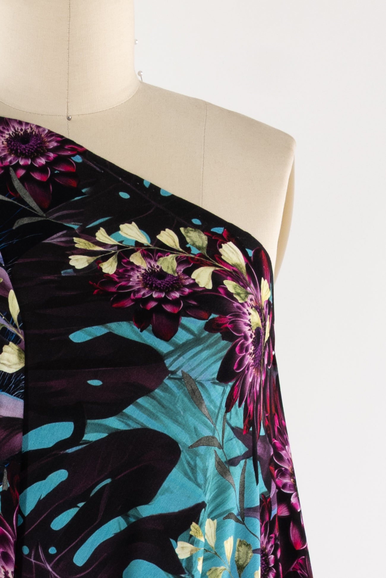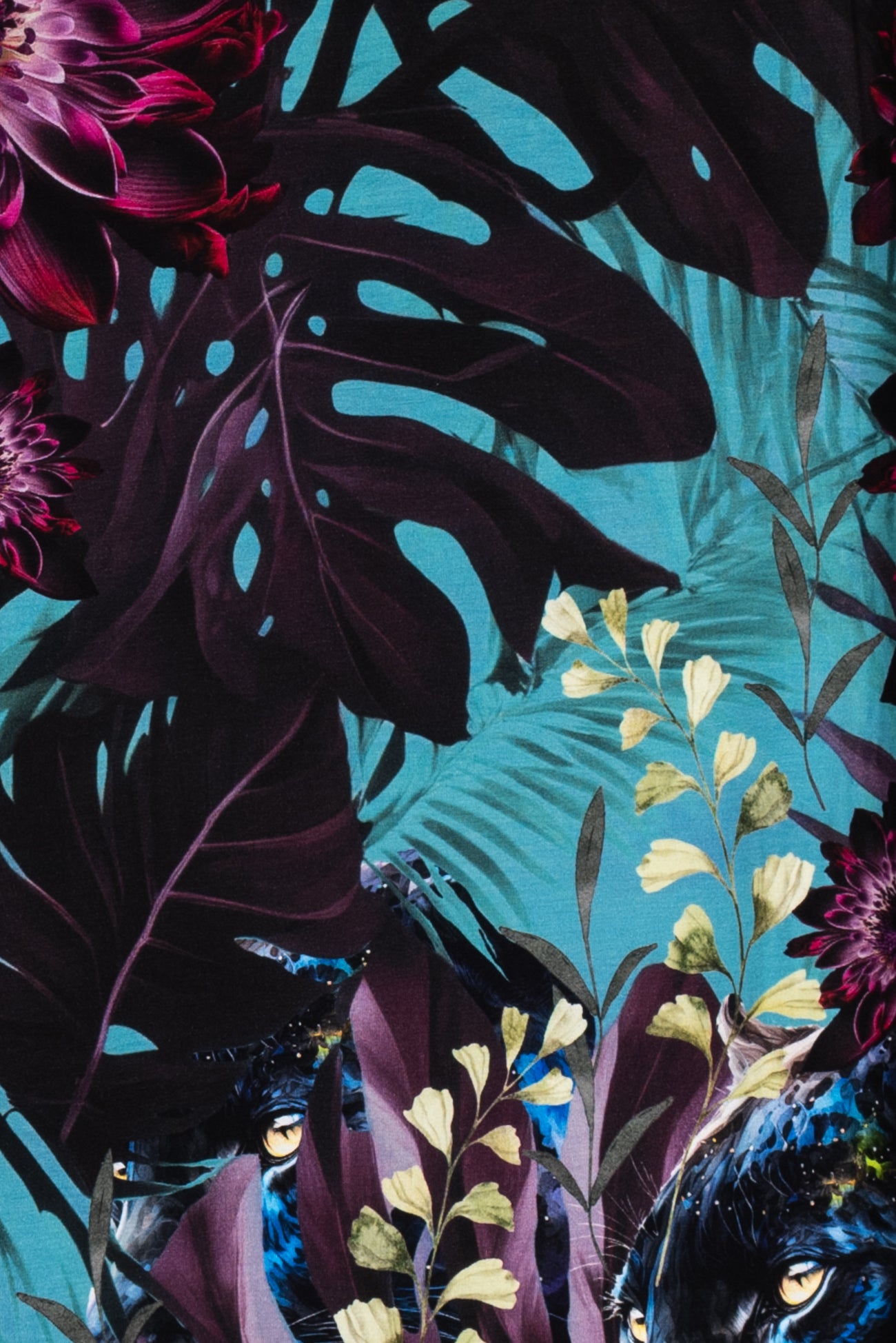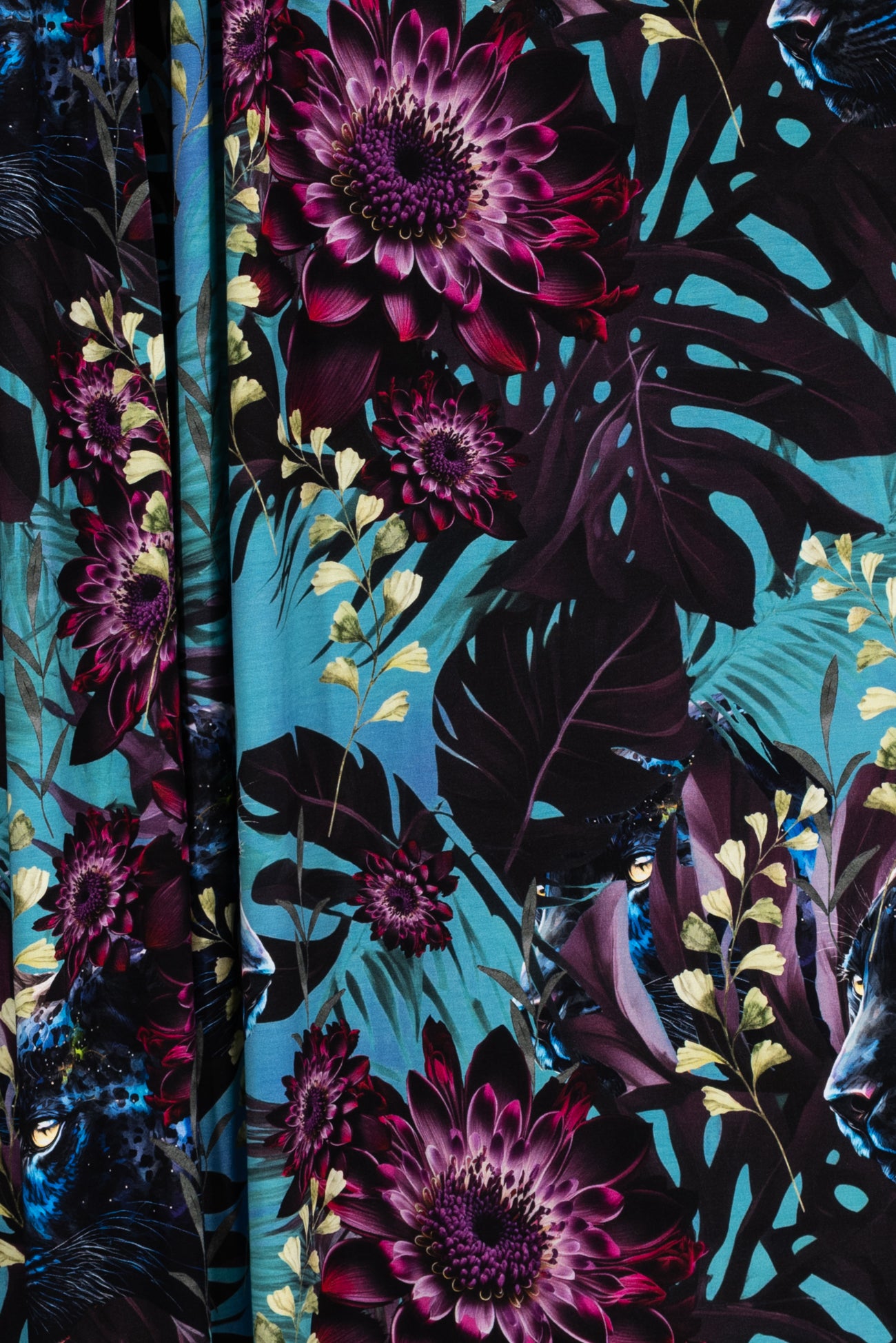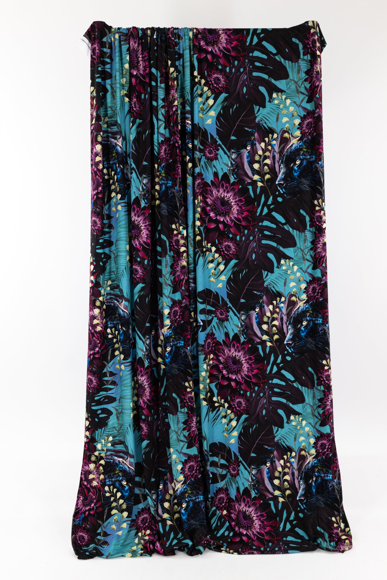 Stunning floral with hidden panthers in shades of purple, cerulean, blue and black, in a gorgeous digital print on an impeccable European quality viscose/spandex knit, produced in Denmark. Light/mid-weight, opaque, with 4-way stretch, some rolling at the cut edge and will skim the body in a flattering way. It has a soft smooth hand, 20" repeat and fluid drape. Right for a dress, t-shirt, soft pants, tunic, skirt, cardi, loungewear or children's. Oeko-Tex® and ECOVERO™ certified.