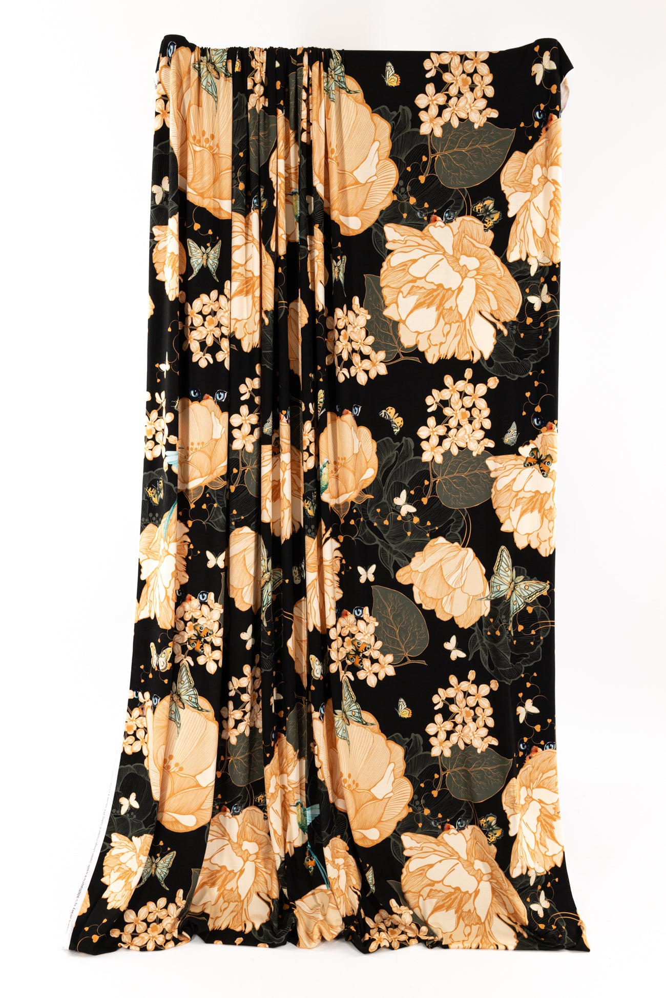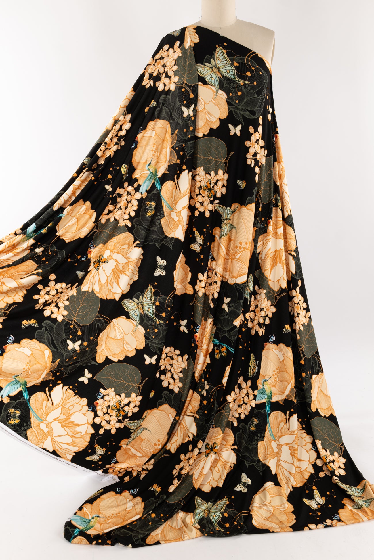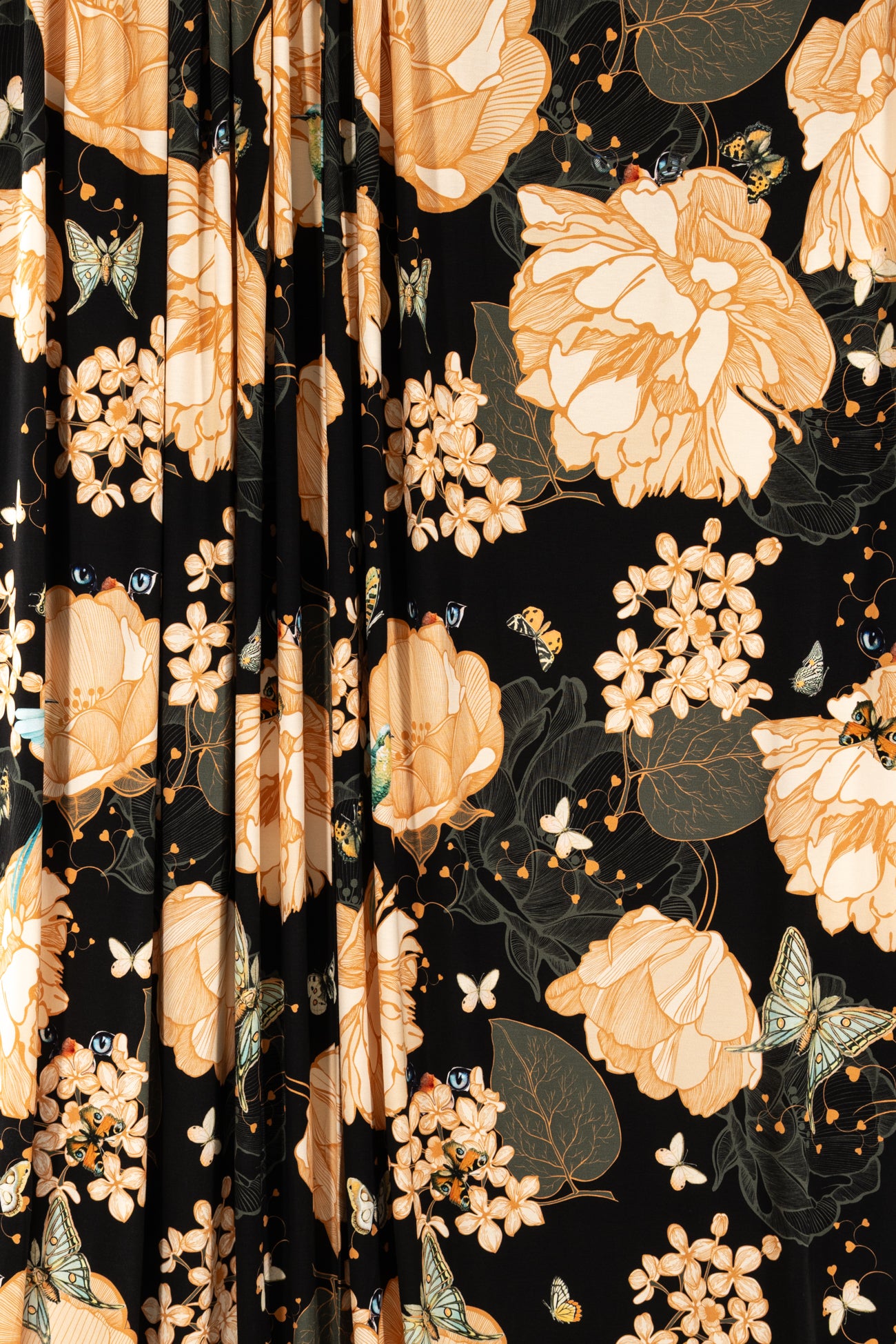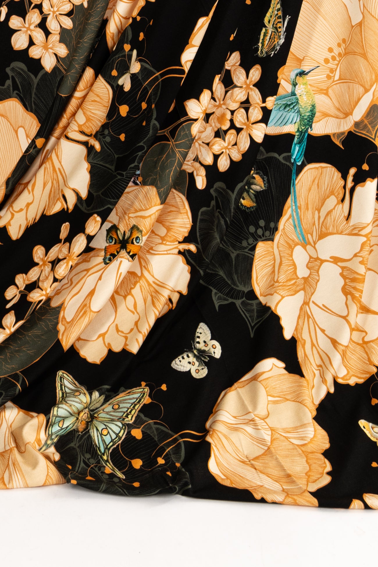 Stunning floral with hummingbirds and butterflies in gold and shades of blue/green on black, in a gorgeous digital print on an impeccable European quality viscose/spandex knit, produced in Denmark. Light/mid-weight, opaque, with 4-way stretch, some rolling at the cut edge and will skim the body in a flattering way. It has a soft smooth hand, 30" repeat and fluid drape. Right for a dress, t-shirt, soft pants, tunic, skirt, cardi, loungewear or children's. Oeko-Tex® and ECOVERO™ certified.