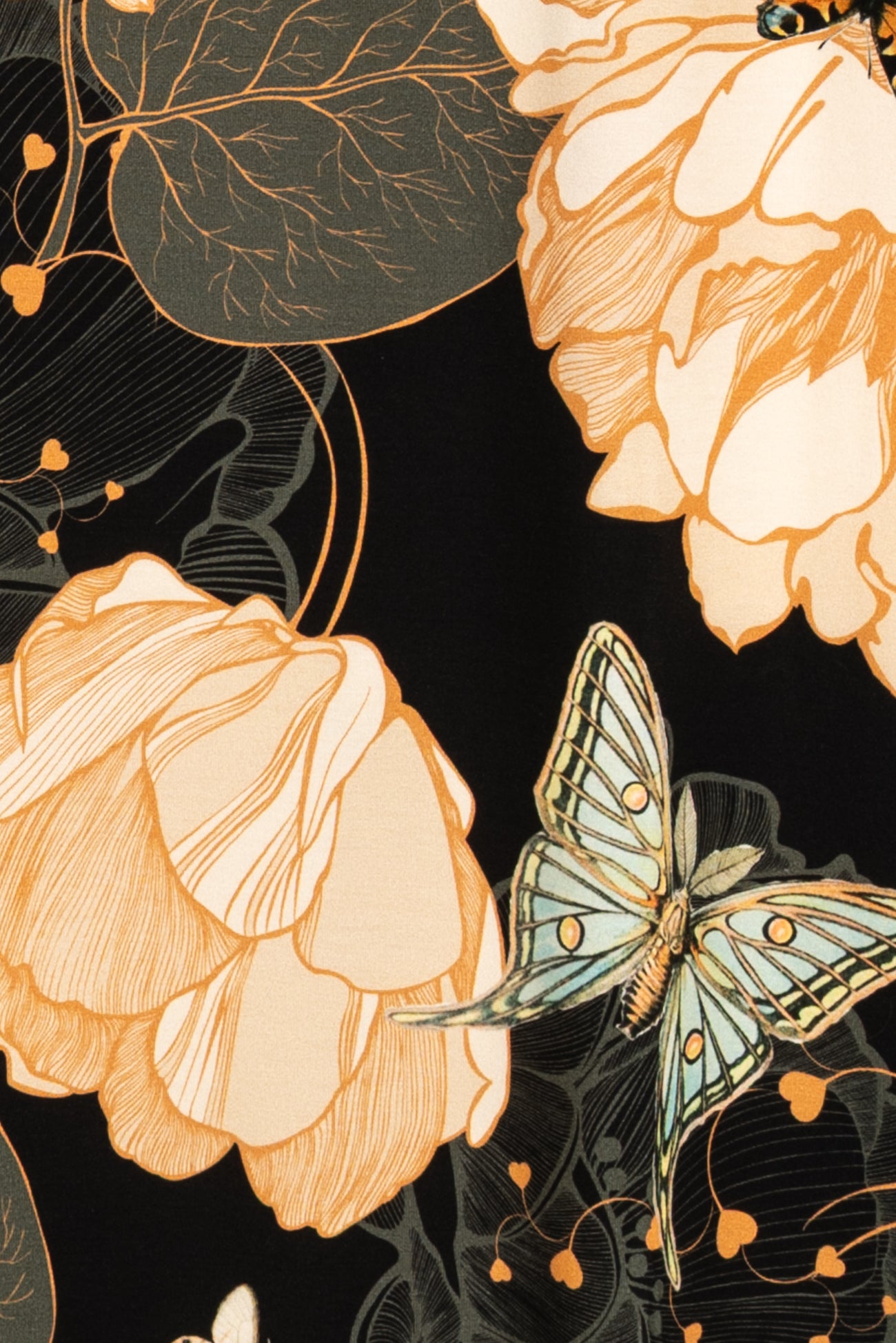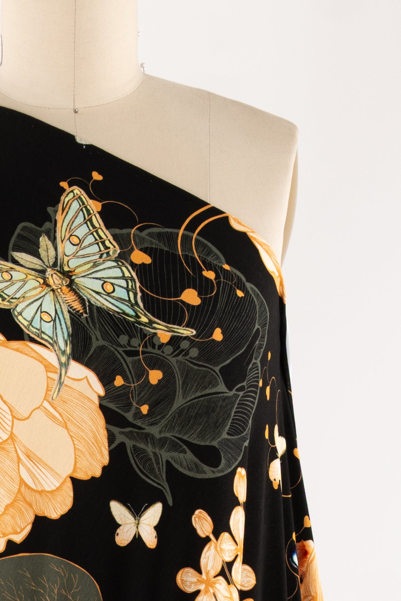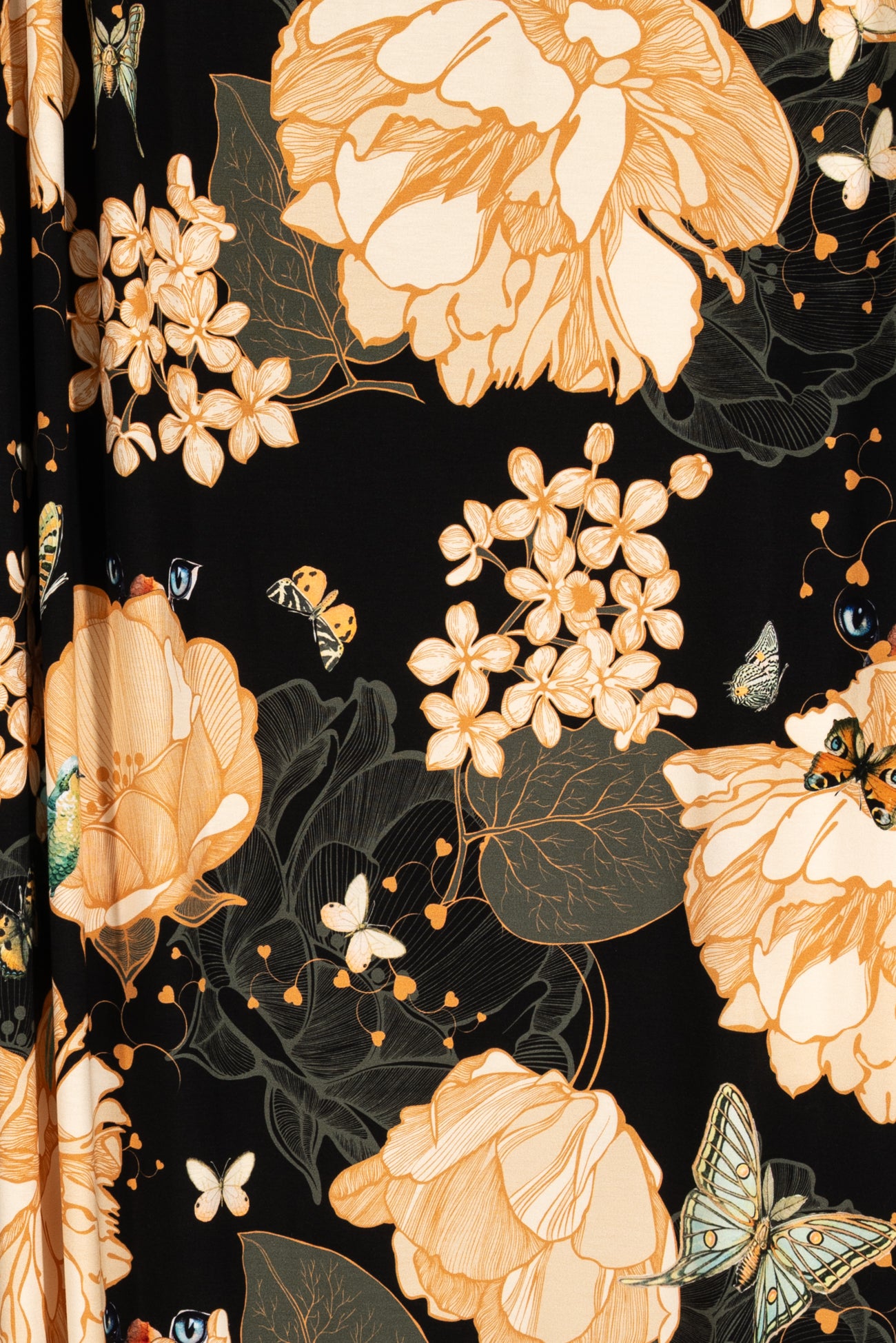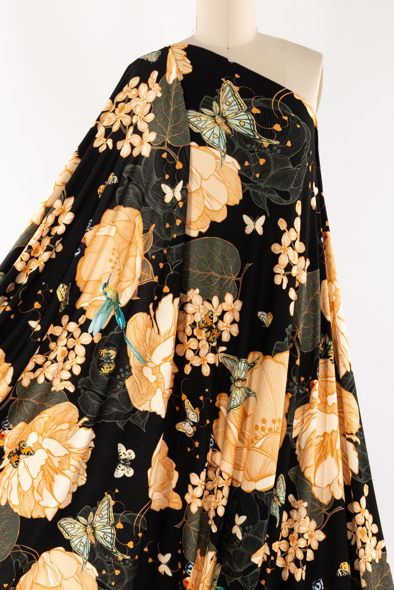 Stunning floral with hummingbirds and butterflies in gold and shades of blue/green on black, in a gorgeous digital print on an impeccable European quality viscose/spandex knit, produced in Denmark. Light/mid-weight, opaque, with 4-way stretch, some rolling at the cut edge and will skim the body in a flattering way. It has a soft smooth hand, 30" repeat and fluid drape. Right for a dress, t-shirt, soft pants, tunic, skirt, cardi, loungewear or children's. Oeko-Tex® and ECOVERO™ certified.