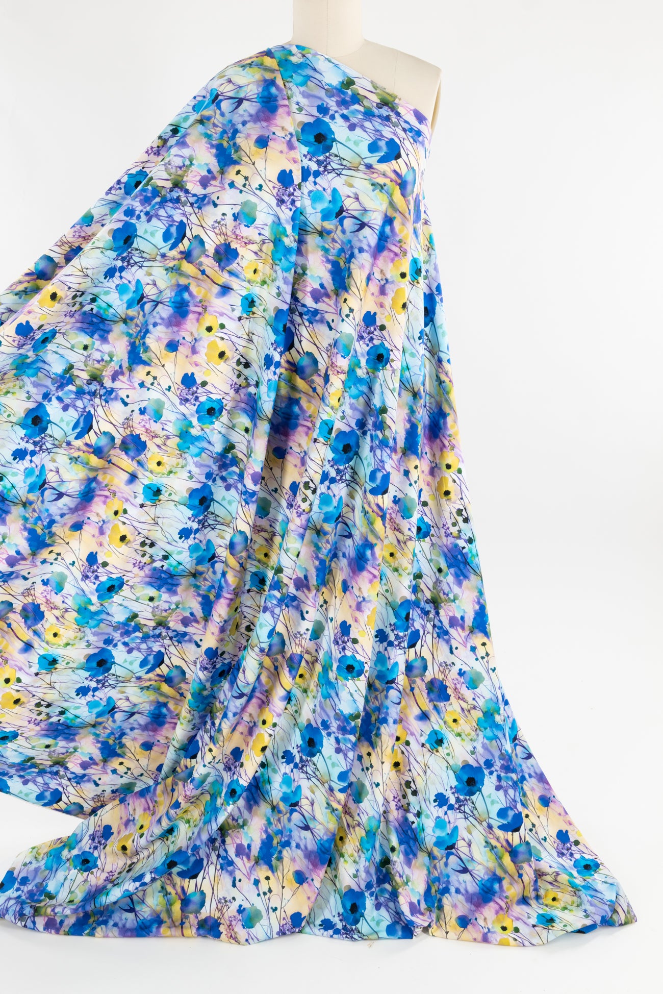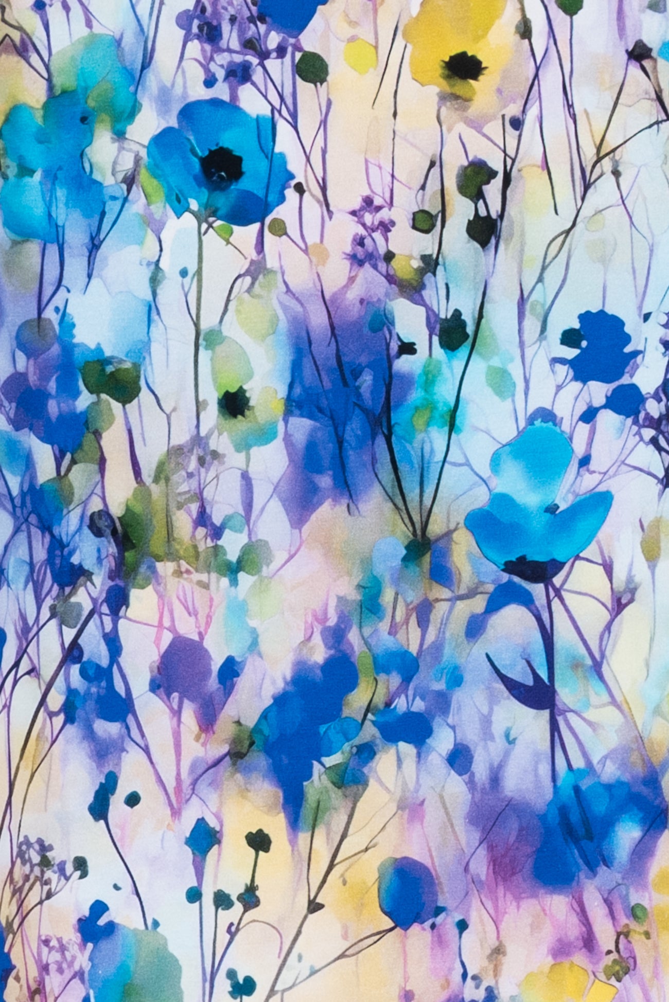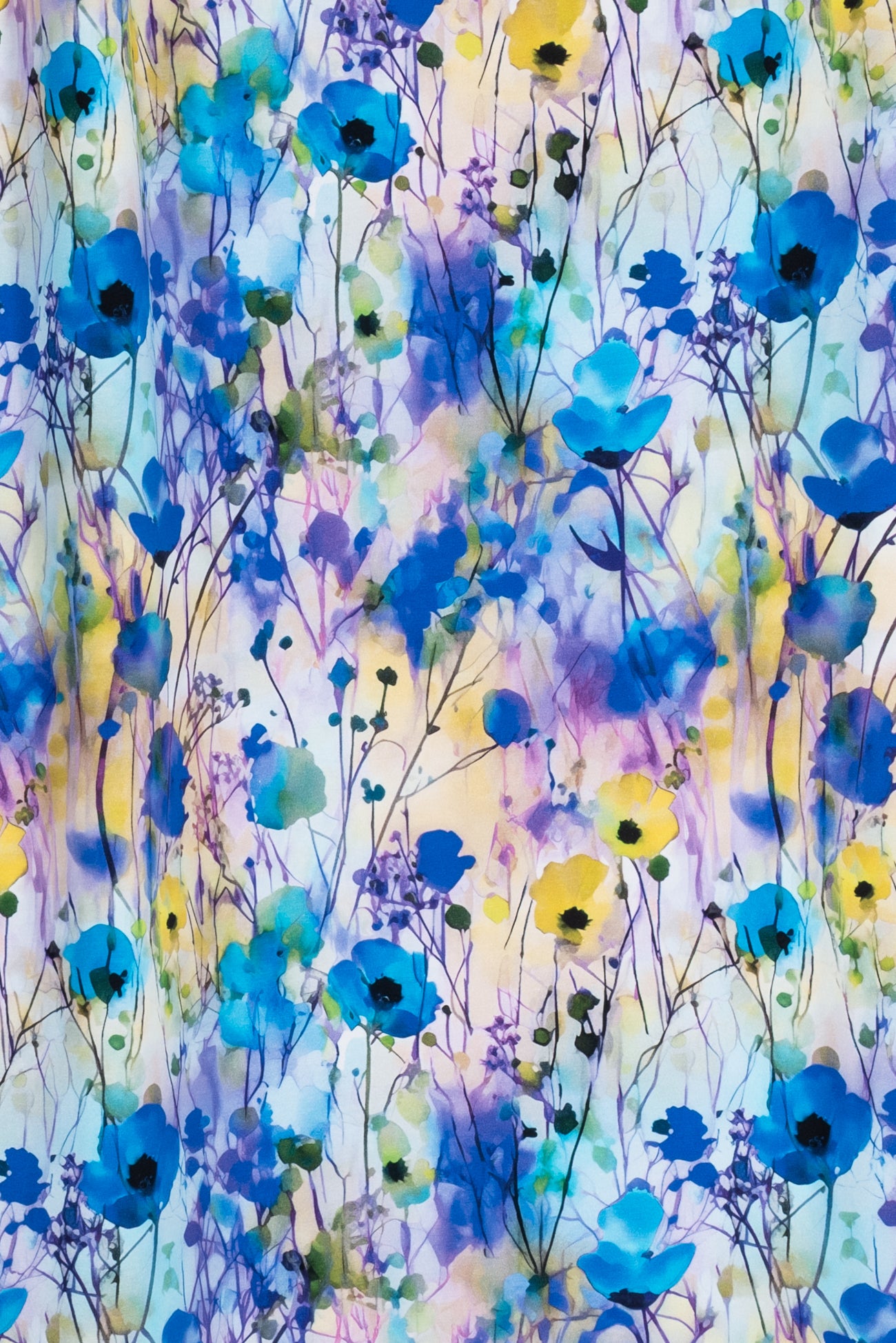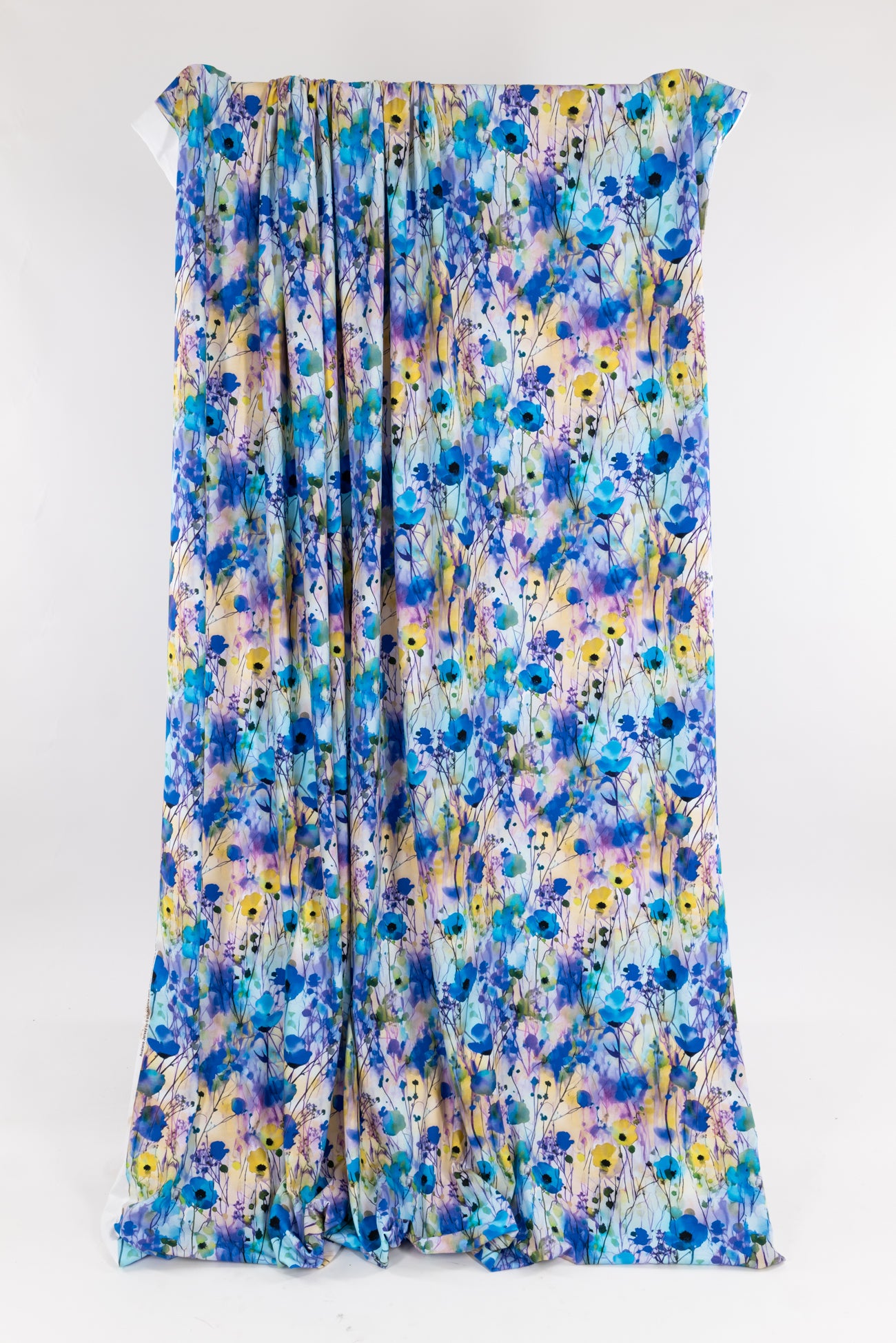 Lively floral in rich shades of turquoise, purple, yellow, and green, in a digital print on an impeccable European quality cotton/spandex jersey knit, produced in Denmark. Light/mid-weight, opaque, and will skim the body in a flattering way. It has a soft, smooth texture, fluid drape, 4-way stretch, and some rolling at the cut edge. Right for a variety of garments; t-shirt, tunic, dress, soft pants, leggings, cardigan, skirt or lounge-wear, as well as children's and men's clothing. Oeko-Tex® certified. One-way design, 14¾" repeat.