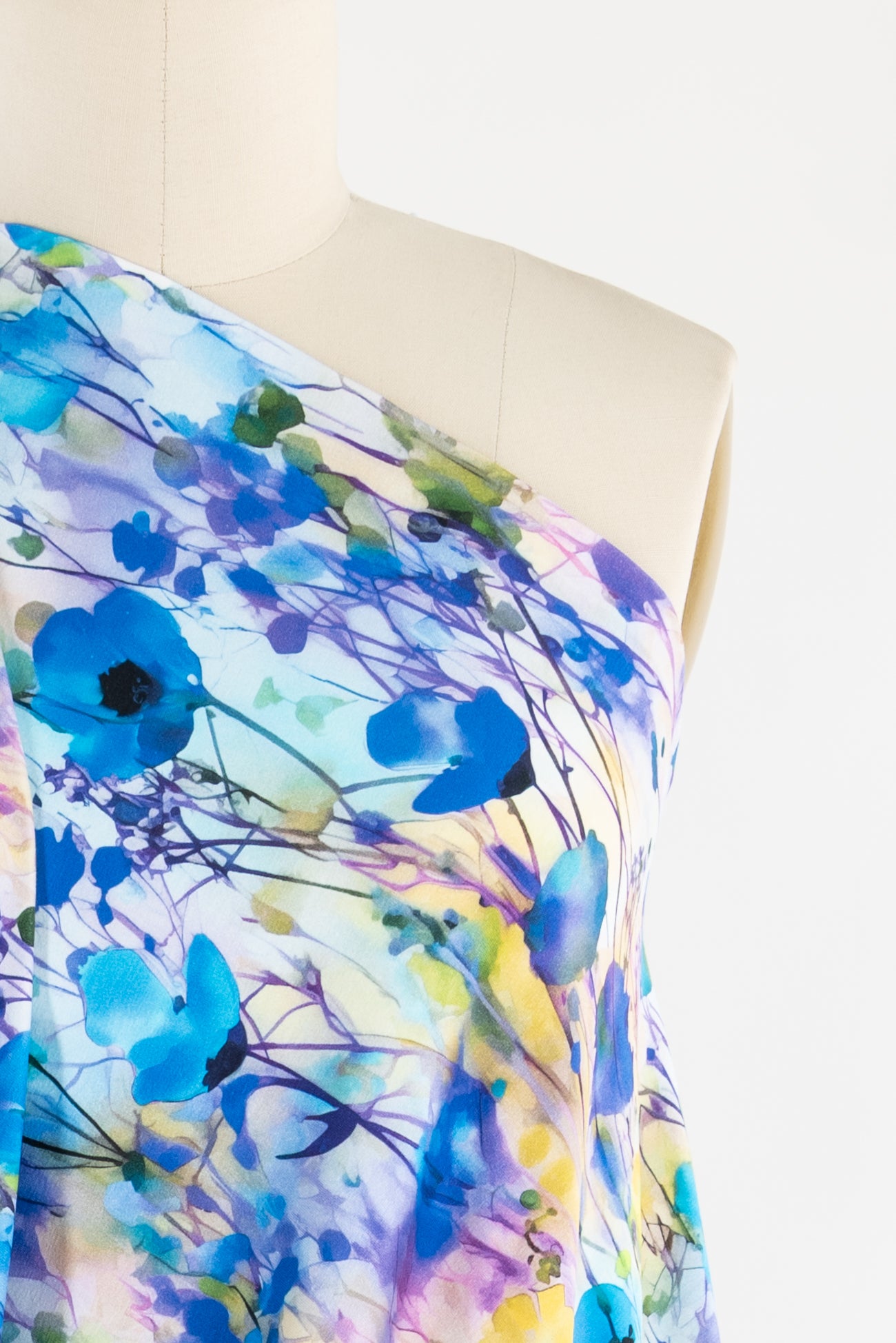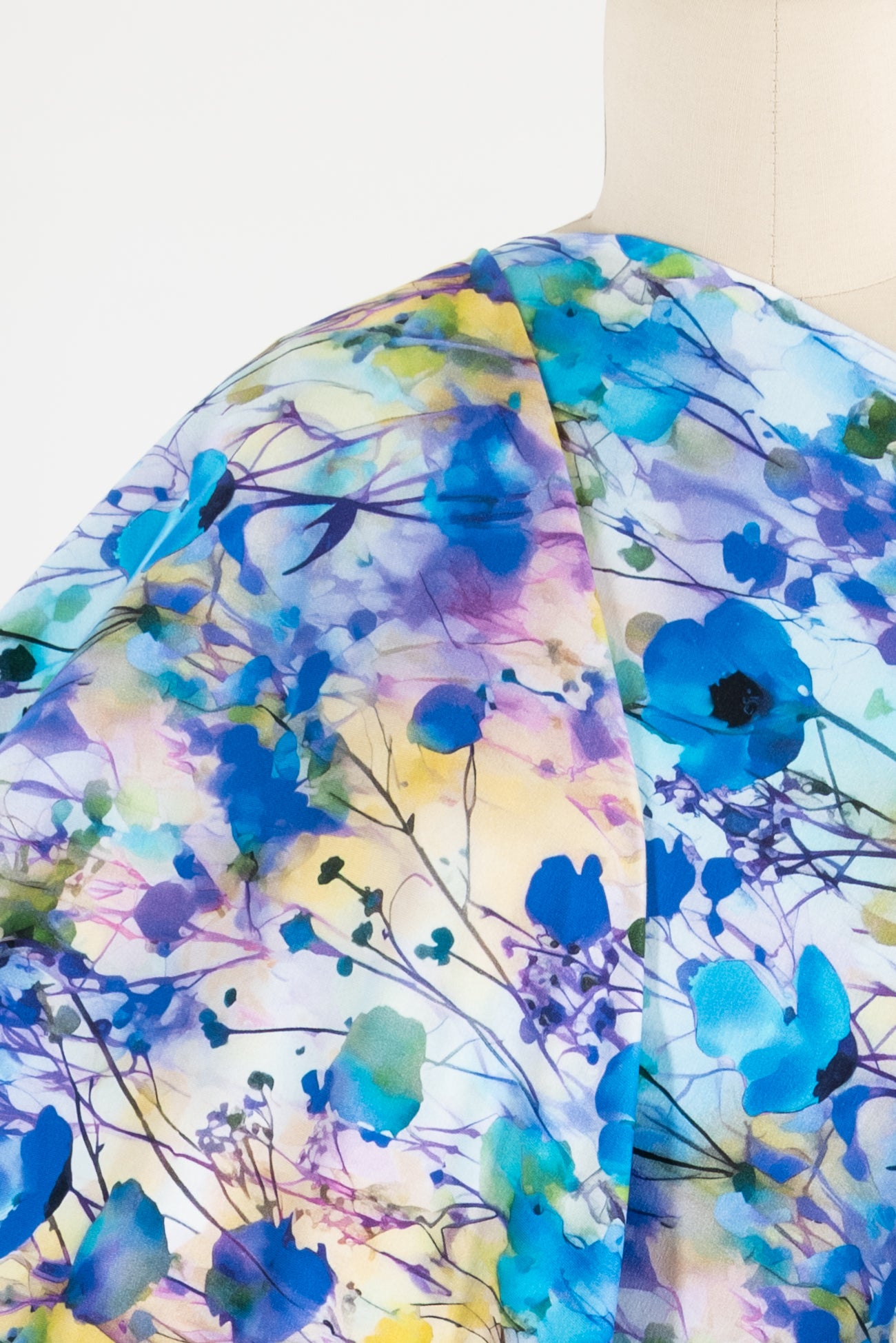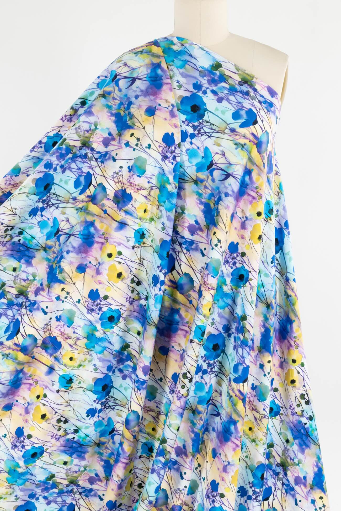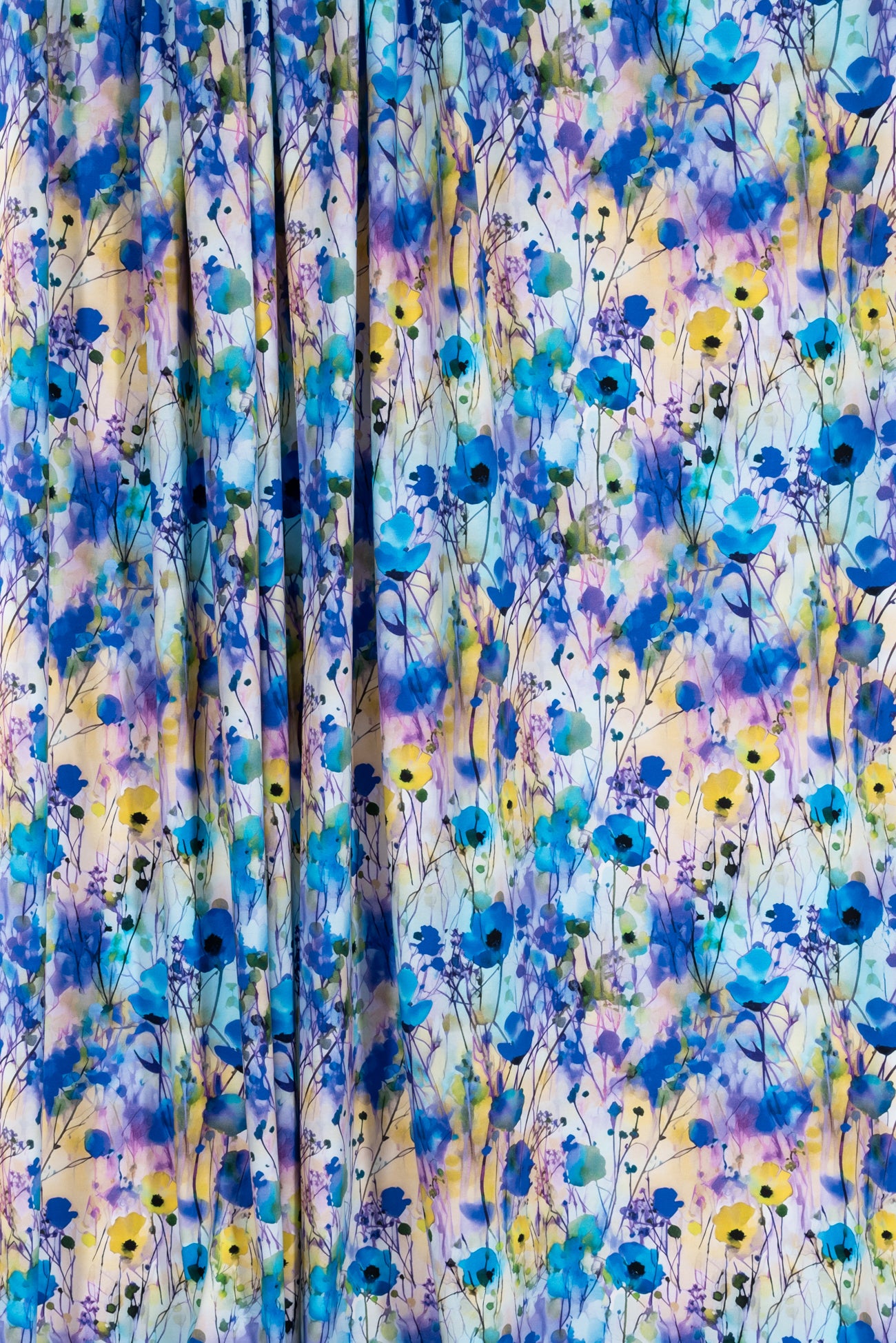Lively floral in rich shades of turquoise, purple, yellow, and green, in a digital print on an impeccable European quality cotton/spandex jersey knit, produced in Denmark. Light/mid-weight, opaque, and will skim the body in a flattering way. It has a soft, smooth texture, fluid drape, 4-way stretch, and some rolling at the cut edge. Right for a variety of garments; t-shirt, tunic, dress, soft pants, leggings, cardigan, skirt or lounge-wear, as well as children's and men's clothing. Oeko-Tex® certified. One-way design, 14¾" repeat.