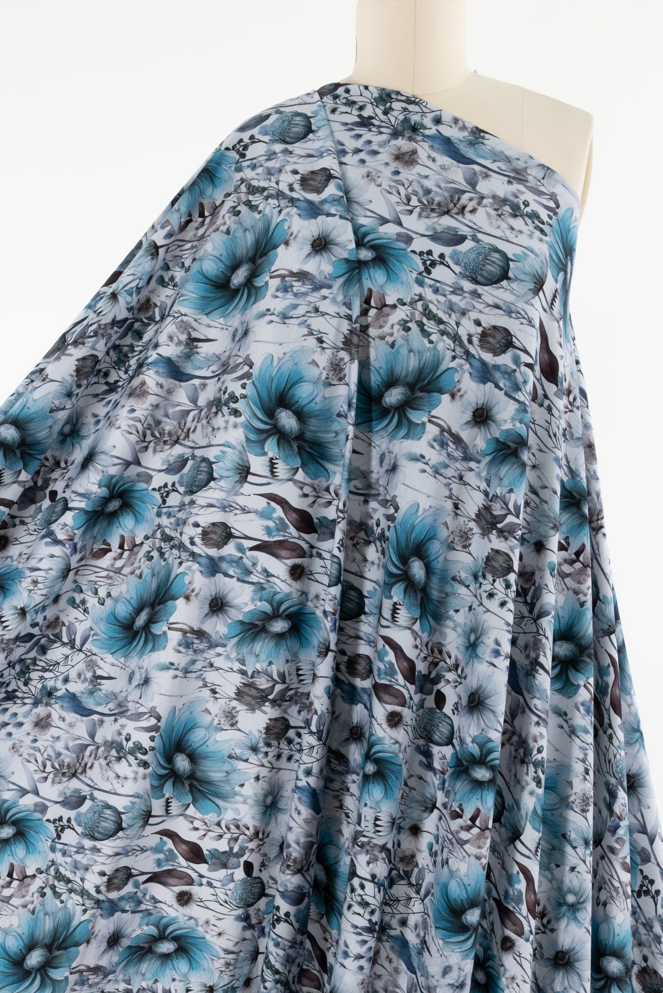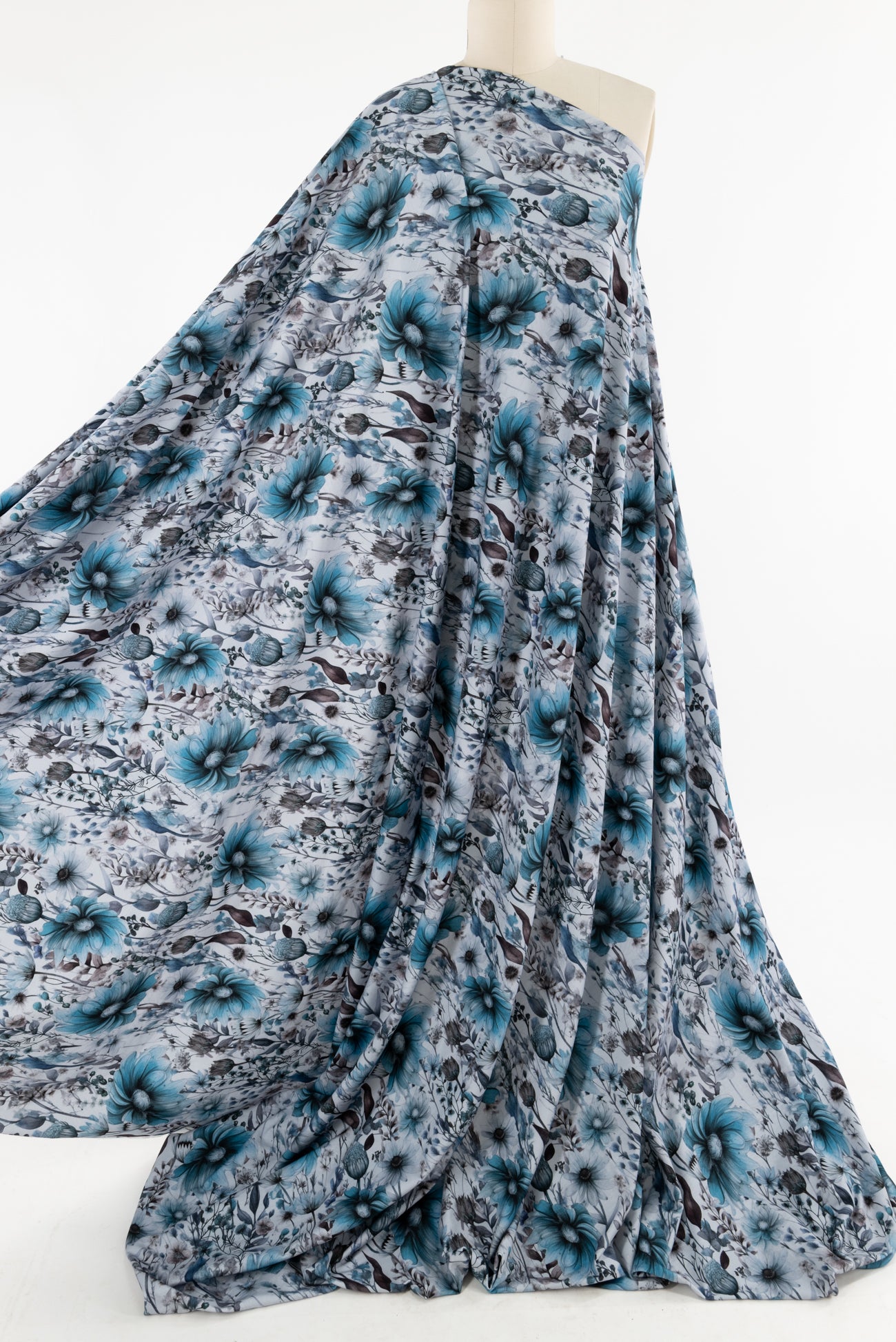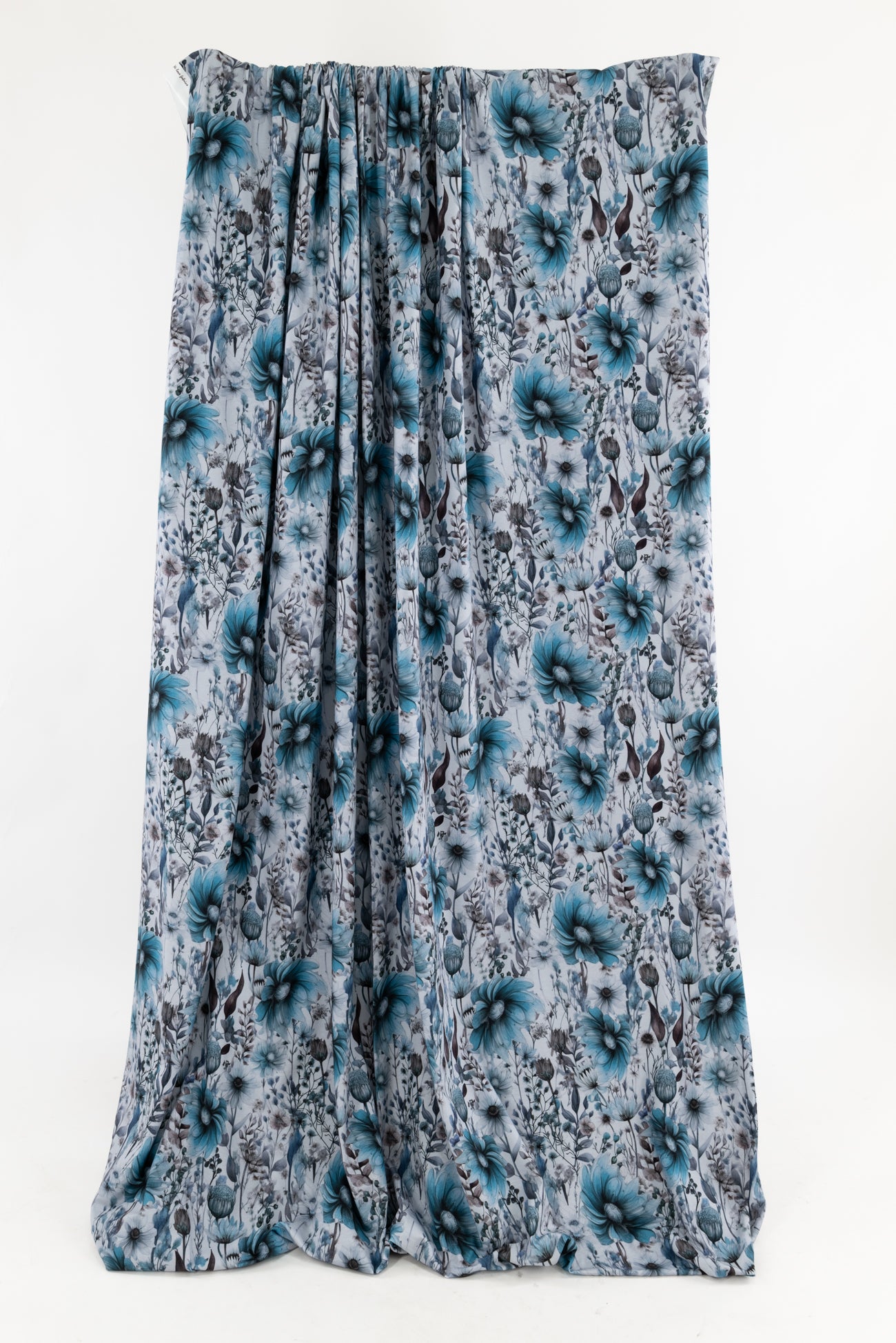 Richly colored floral in blues and grays with black accents, in a digital print on an impeccable European quality cotton/spandex jersey knit, produced in Denmark. Light/mid-weight, opaque, will skim the body in a flattering way. It has a soft, smooth hand, fluid drape, 4-way stretch, and some rolling at the cut edge. Right for a variety of garments; t-shirt, tunic, dress, soft pants, leggings, cardigan, skirt or loungewear, as well as children's and men's clothing. Oeko-Tex® certified. One-way design, 15 inch repeat.