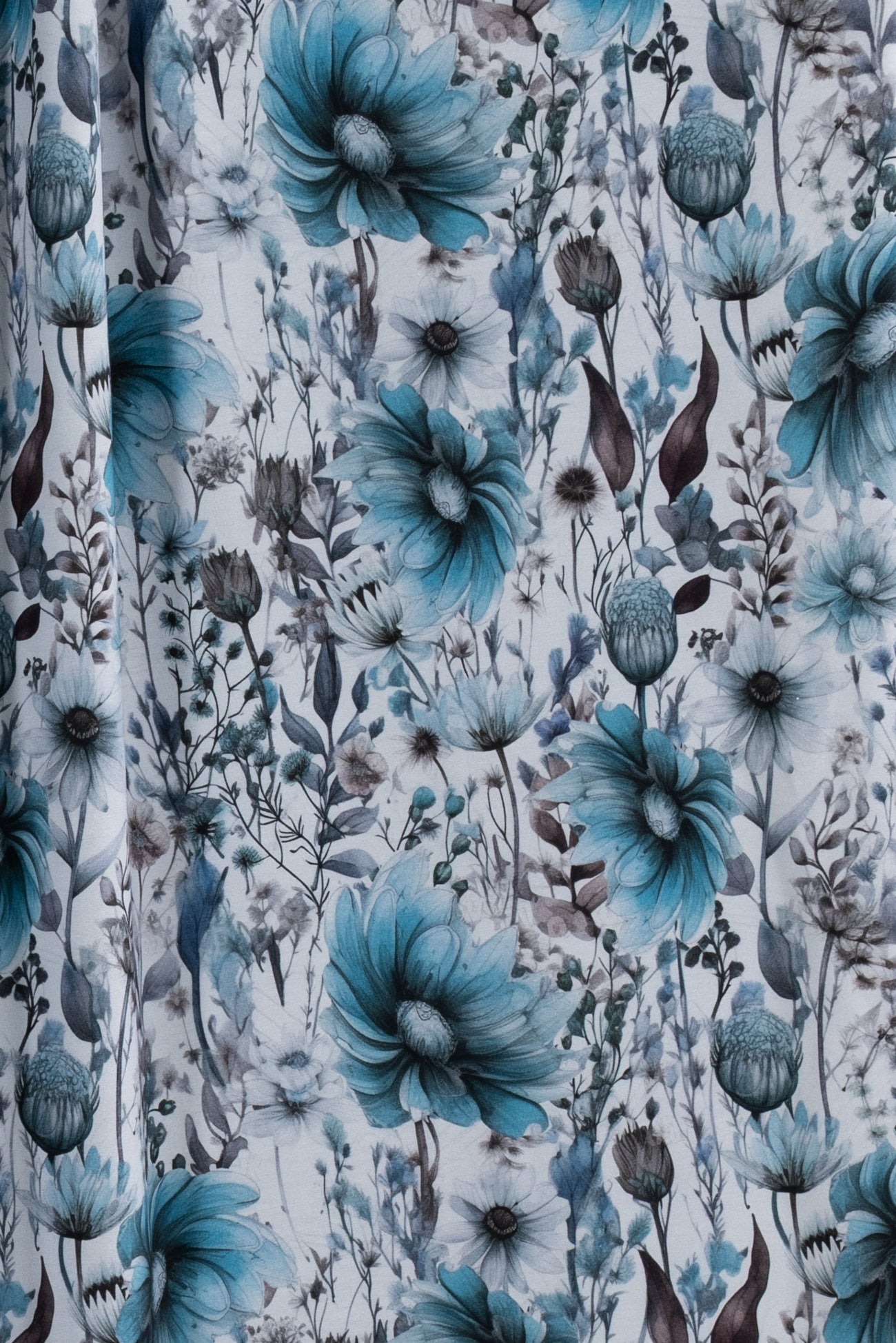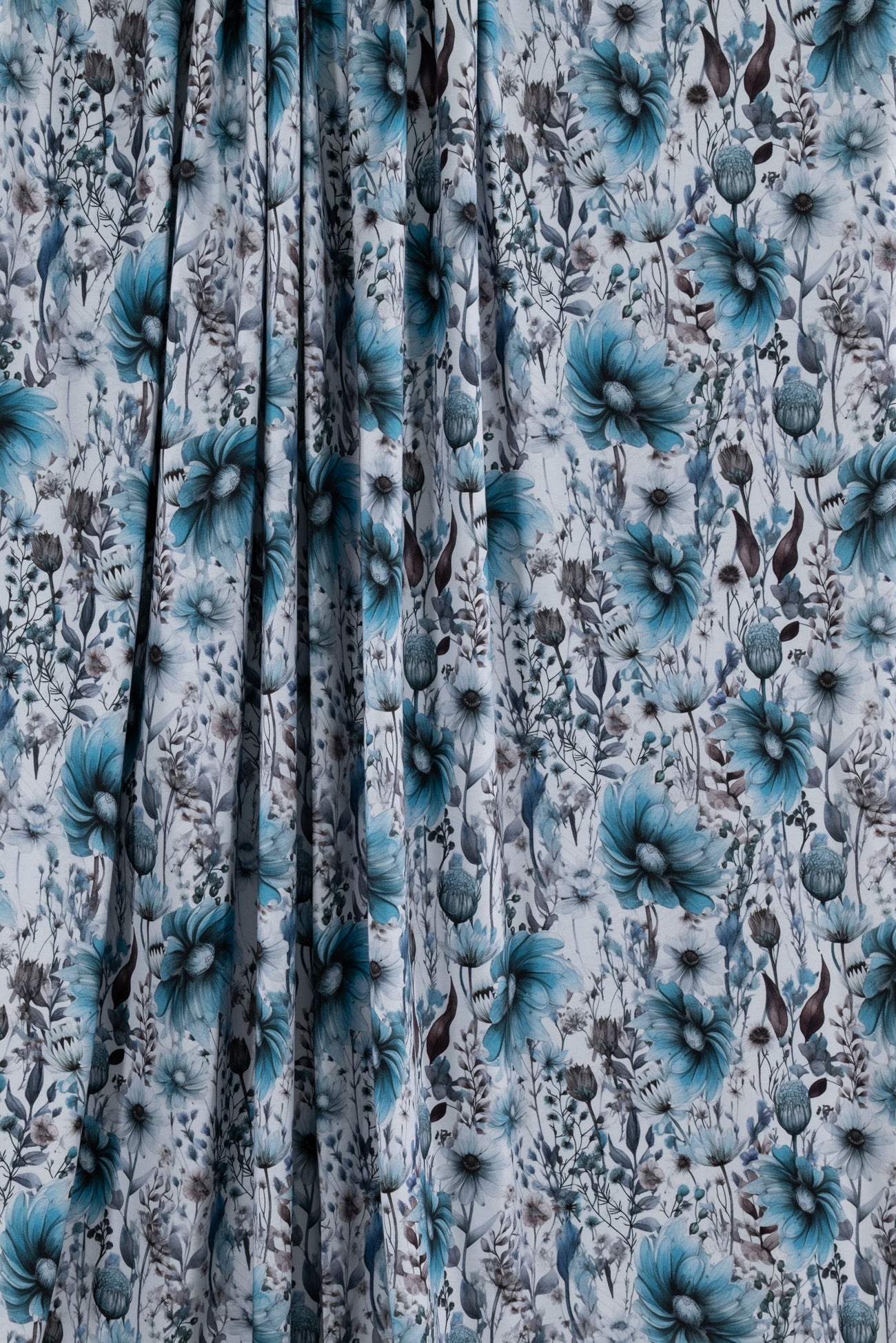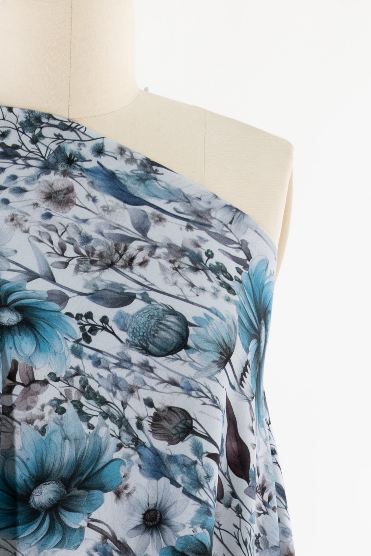 Richly colored floral in blues and grays with black accents, in a digital print on an impeccable European quality cotton/spandex jersey knit, produced in Denmark. Light/mid-weight, opaque, will skim the body in a flattering way. It has a soft, smooth hand, fluid drape, 4-way stretch, and some rolling at the cut edge. Right for a variety of garments; t-shirt, tunic, dress, soft pants, leggings, cardigan, skirt or loungewear, as well as children's and men's clothing. Oeko-Tex® certified. One-way design, 15 inch repeat.