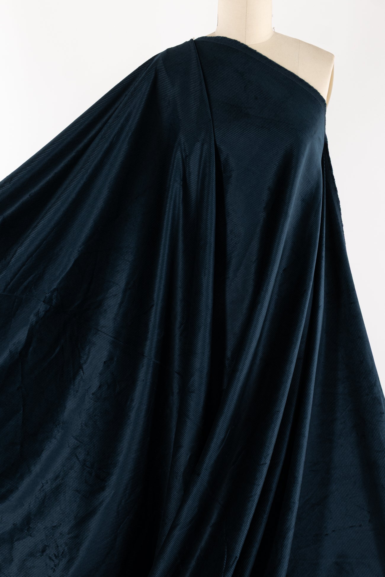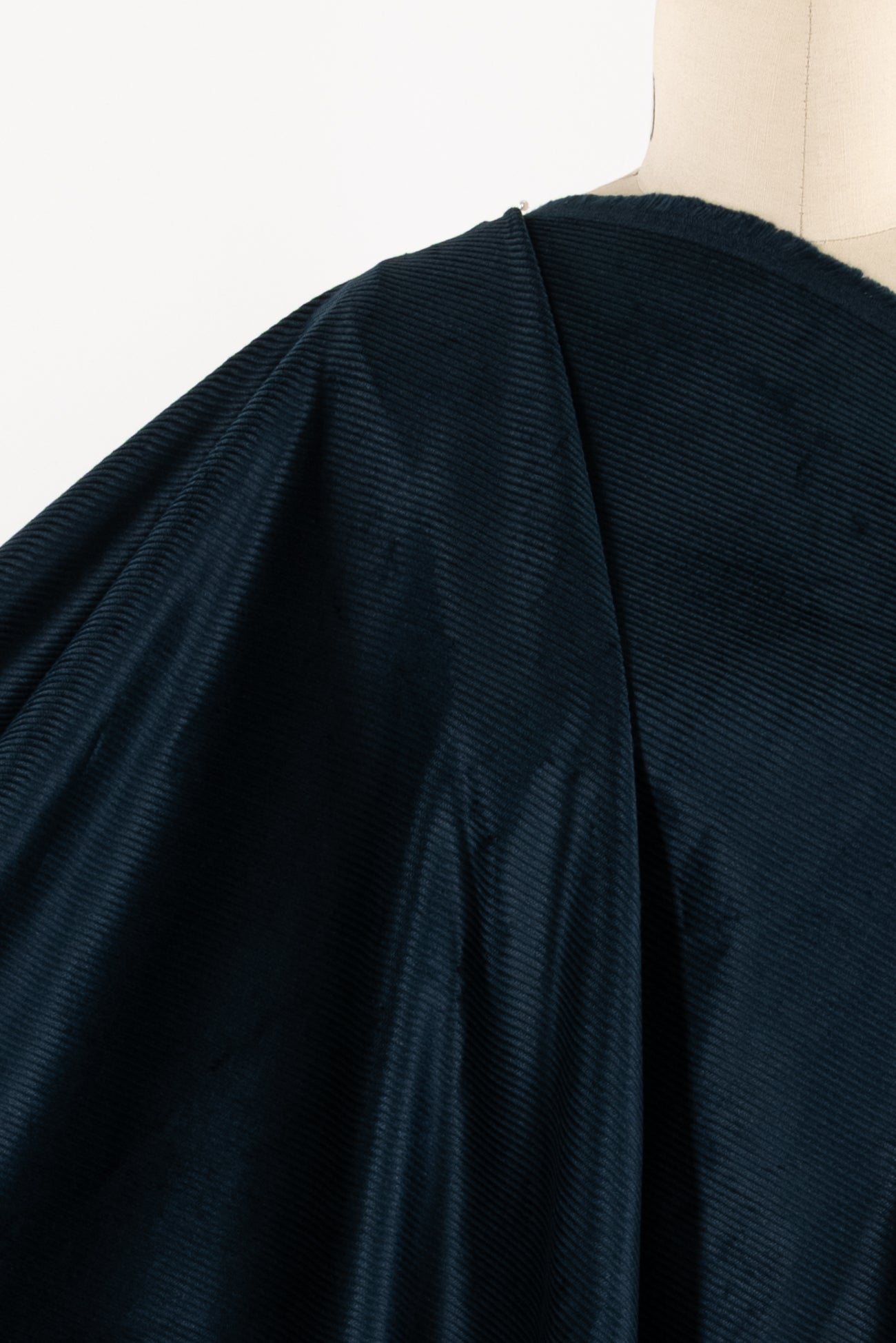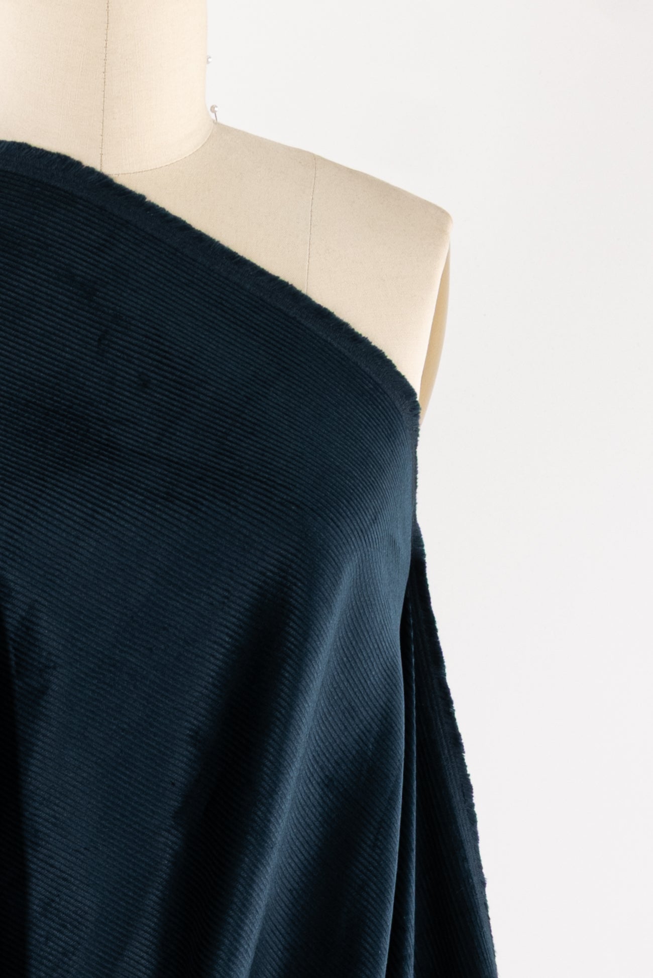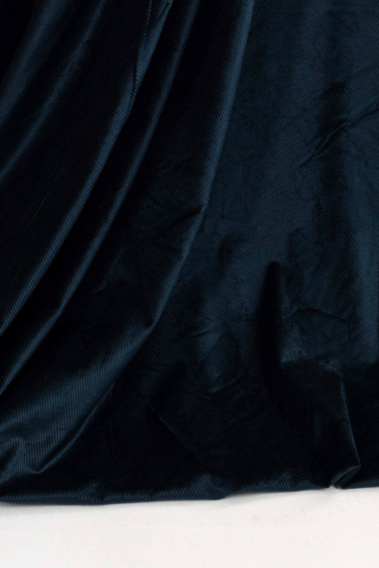 Deep dark teal blue in a classic mid-wale corduroy, fine quality deadstock from a French mill for an LA designer. Mid-weight with a soft hand, light drape and 10 wales/inch. Right for a jacket, light coat, vest, dress, shirt, skirt, pants or men's. Cut for nap.