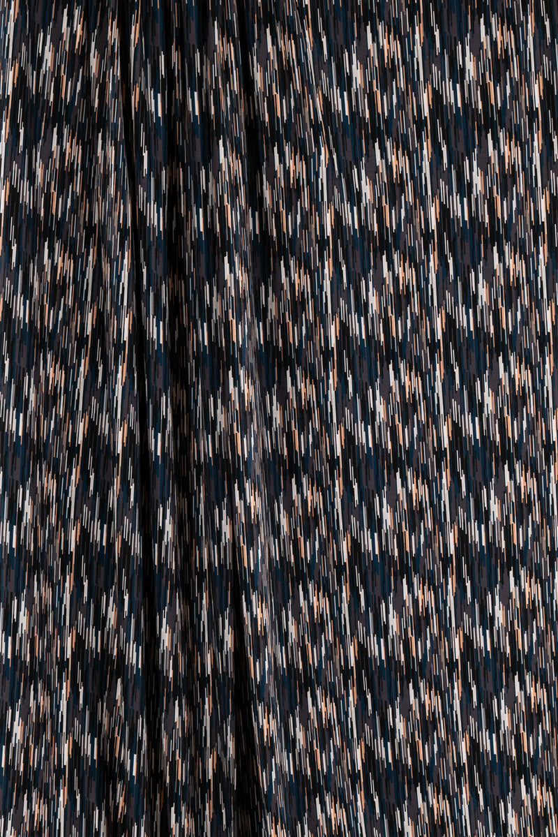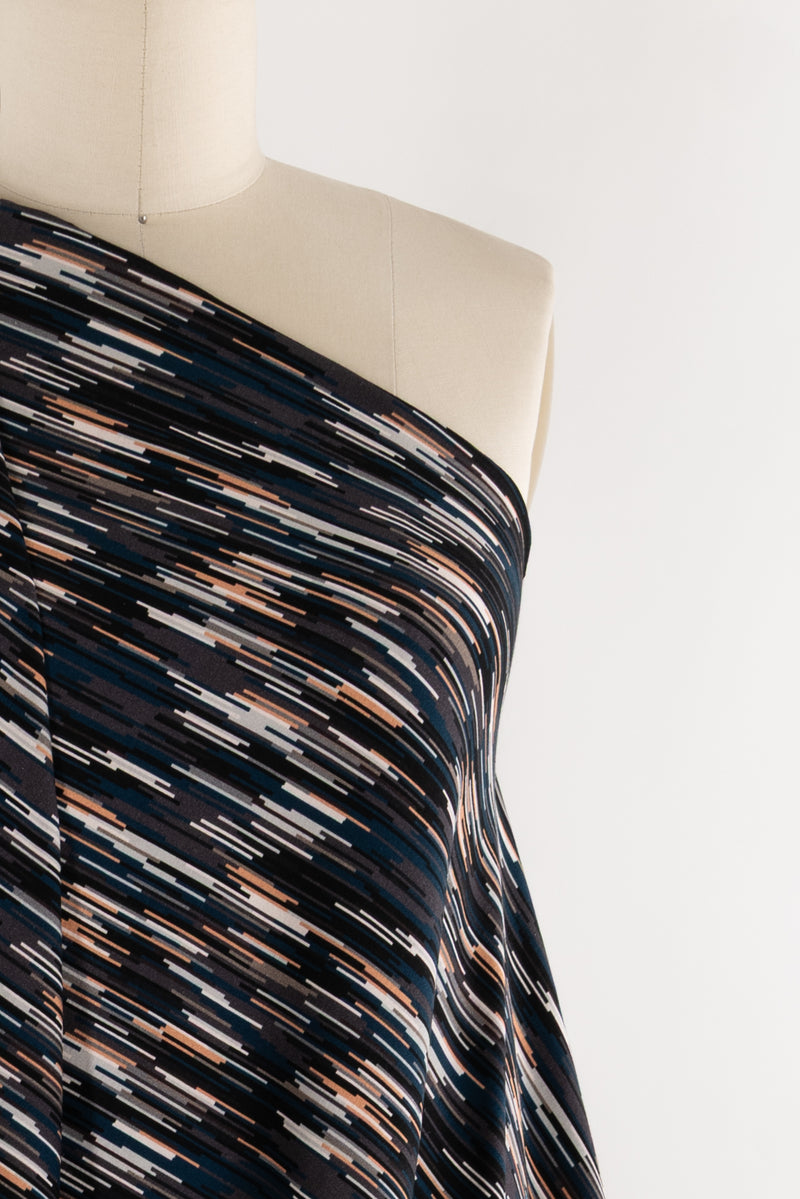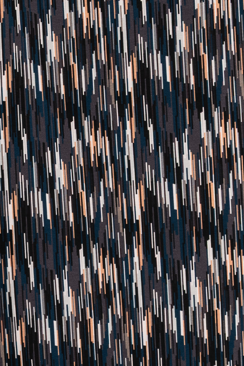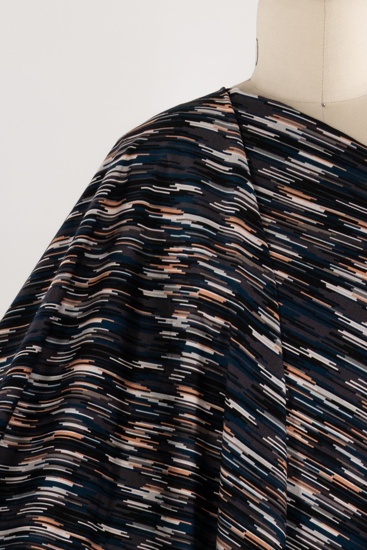 Dramatic broken vertical stripes in shades of deep teal, gray, white, apricot, and black, digitally printed on luxurious cotton knit jersey in the Netherlands. Impeccable quality, light/mid-weight, opaque, with a flattering body-skimming flow, appealing soft hand, fluid drape, crosswise stretch, some lengthwise stretch, a 10¼" repeat, and some rolling at the cut edge. Ideal for a wide range of garments, t-shirt, tunic, dress, skirt, soft pants, loungewear, caftan, kimono, men's, or children's. Oeko-Tex® certified.