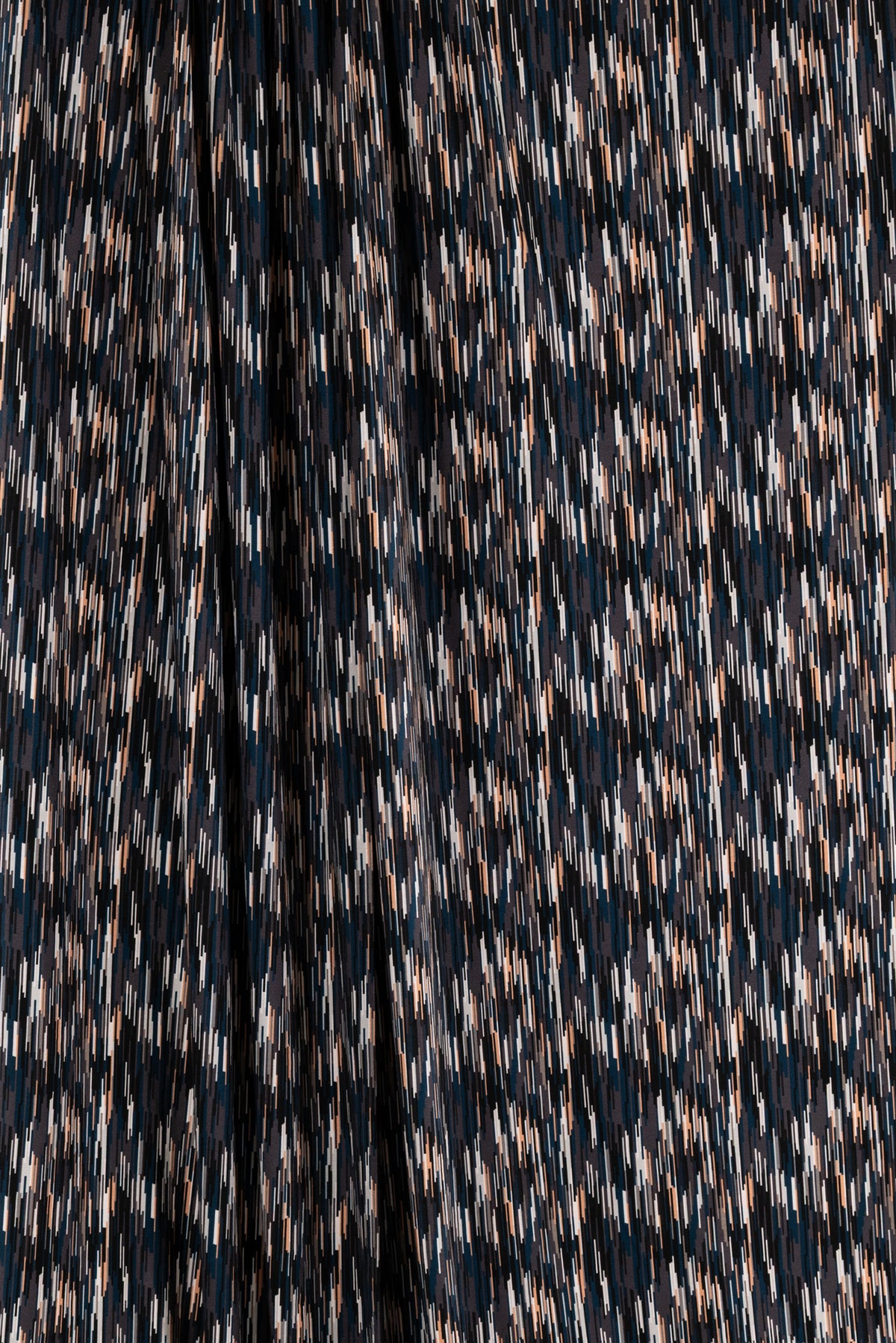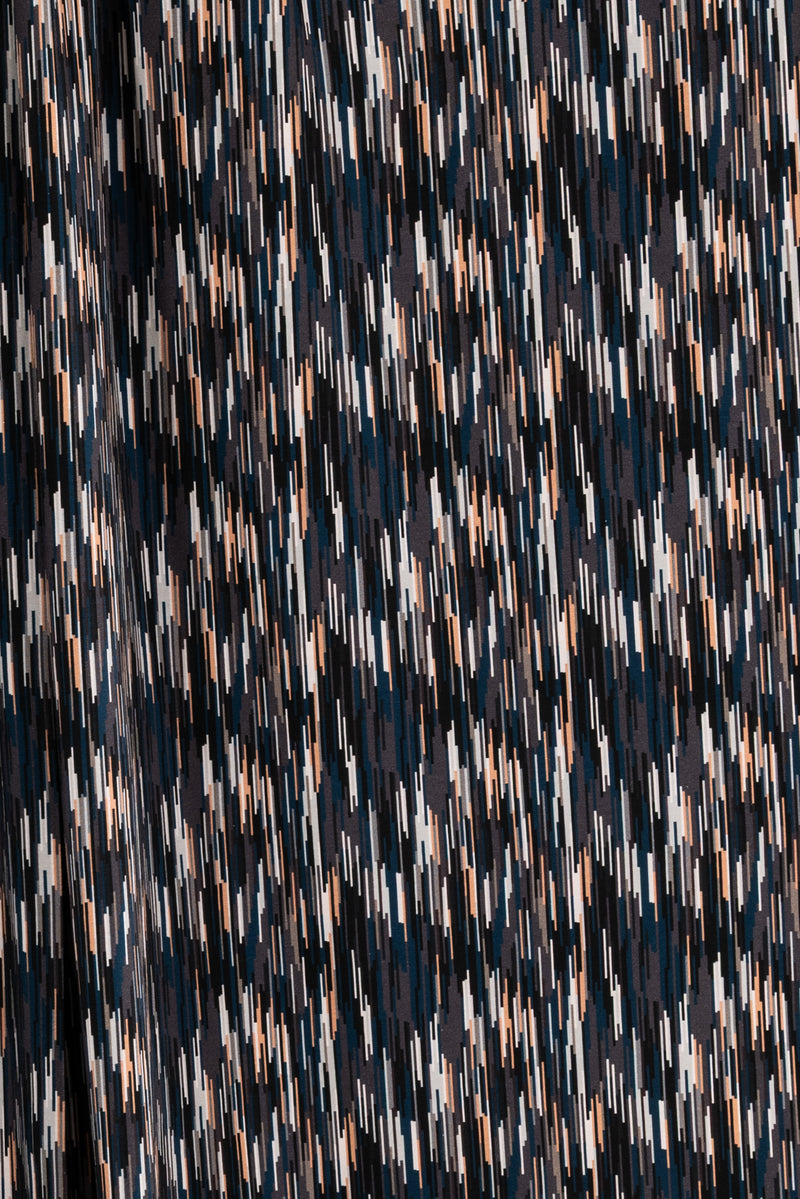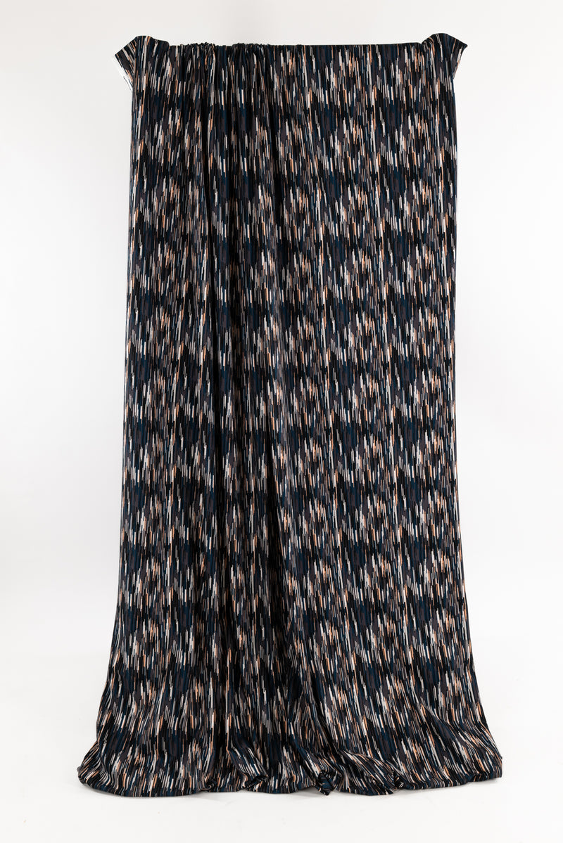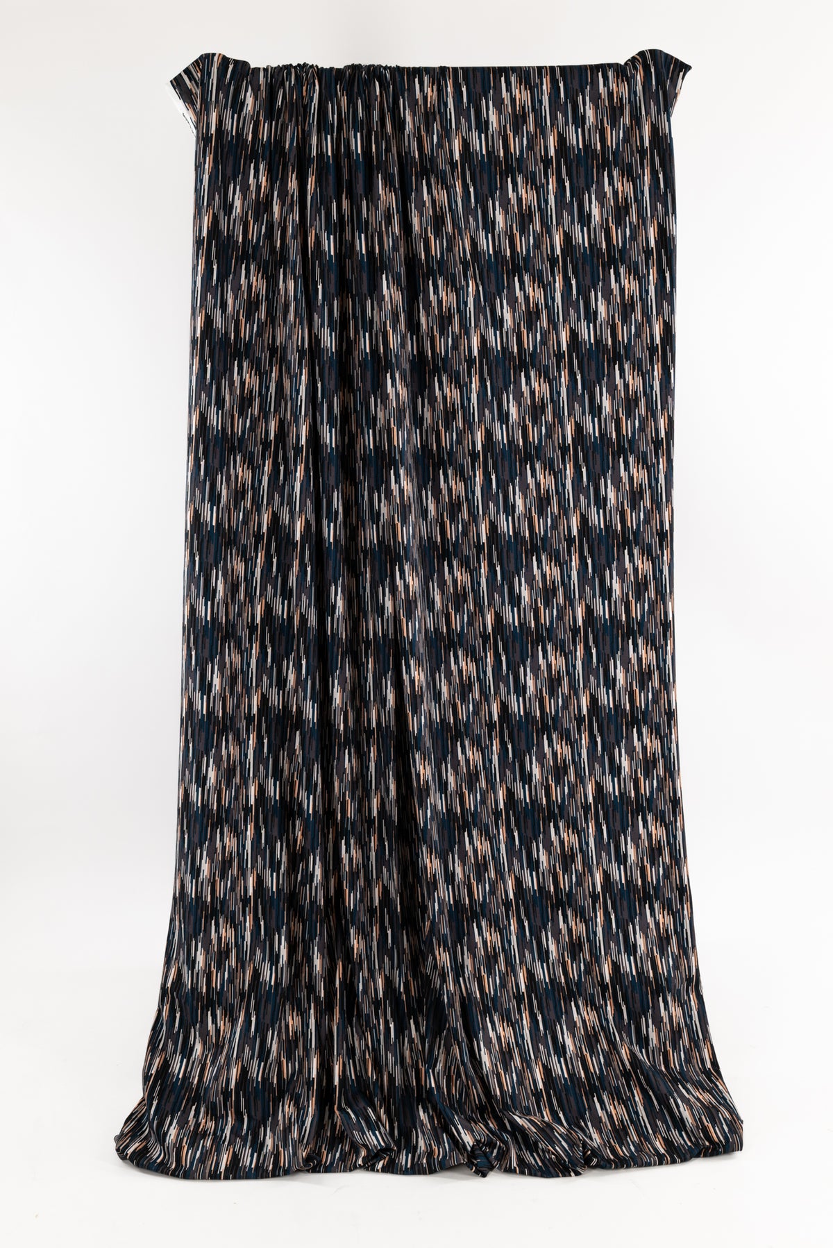 Dramatic broken vertical stripes in shades of deep teal, gray, white, apricot, and black, digitally printed on luxurious cotton knit jersey in the Netherlands. Impeccable quality, light/mid-weight, opaque, with a flattering body-skimming flow, appealing soft hand, fluid drape, crosswise stretch, some lengthwise stretch, a 10¼" repeat, and some rolling at the cut edge. Ideal for a wide range of garments, t-shirt, tunic, dress, skirt, soft pants, loungewear, caftan, kimono, men's, or children's. Oeko-Tex® certified.