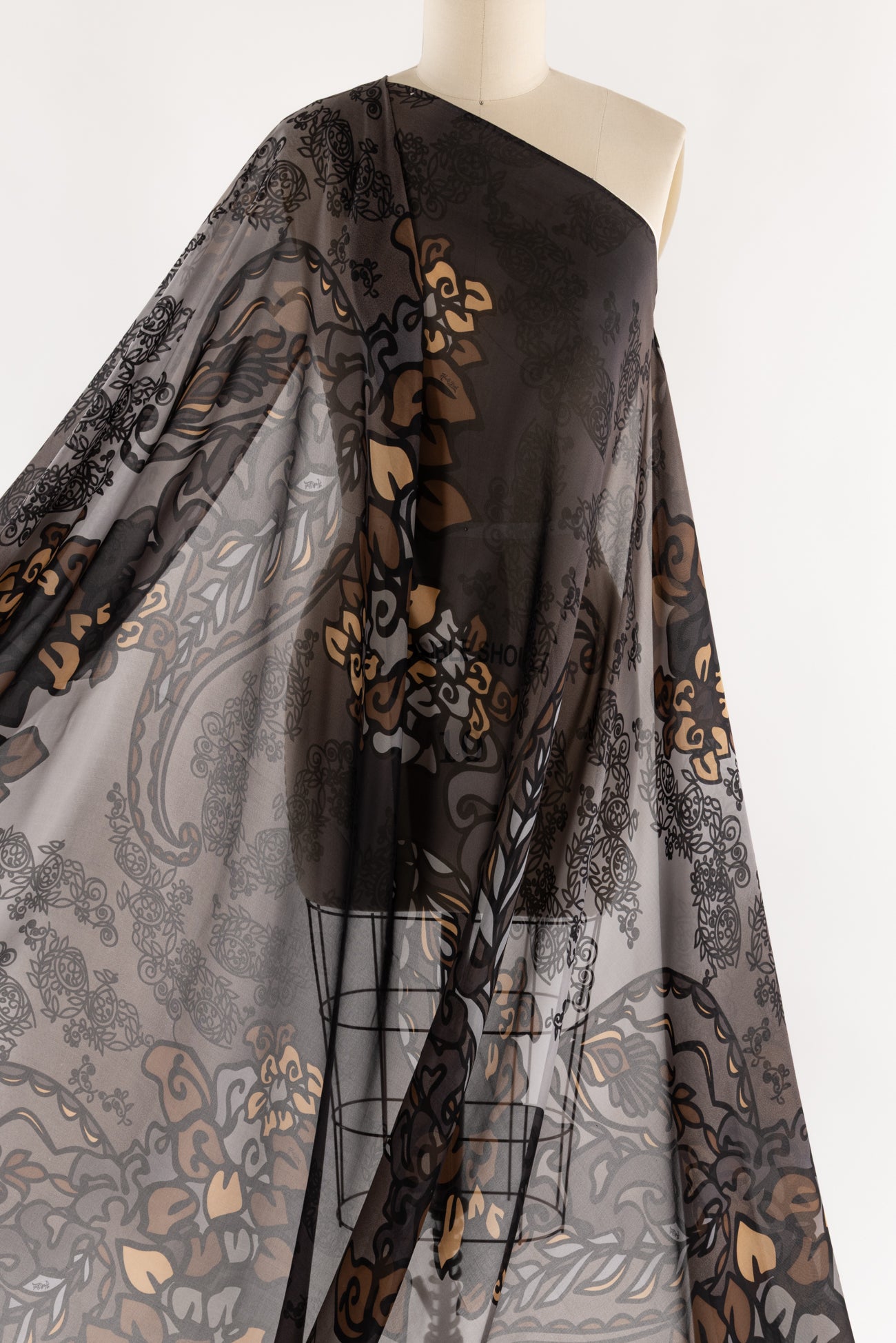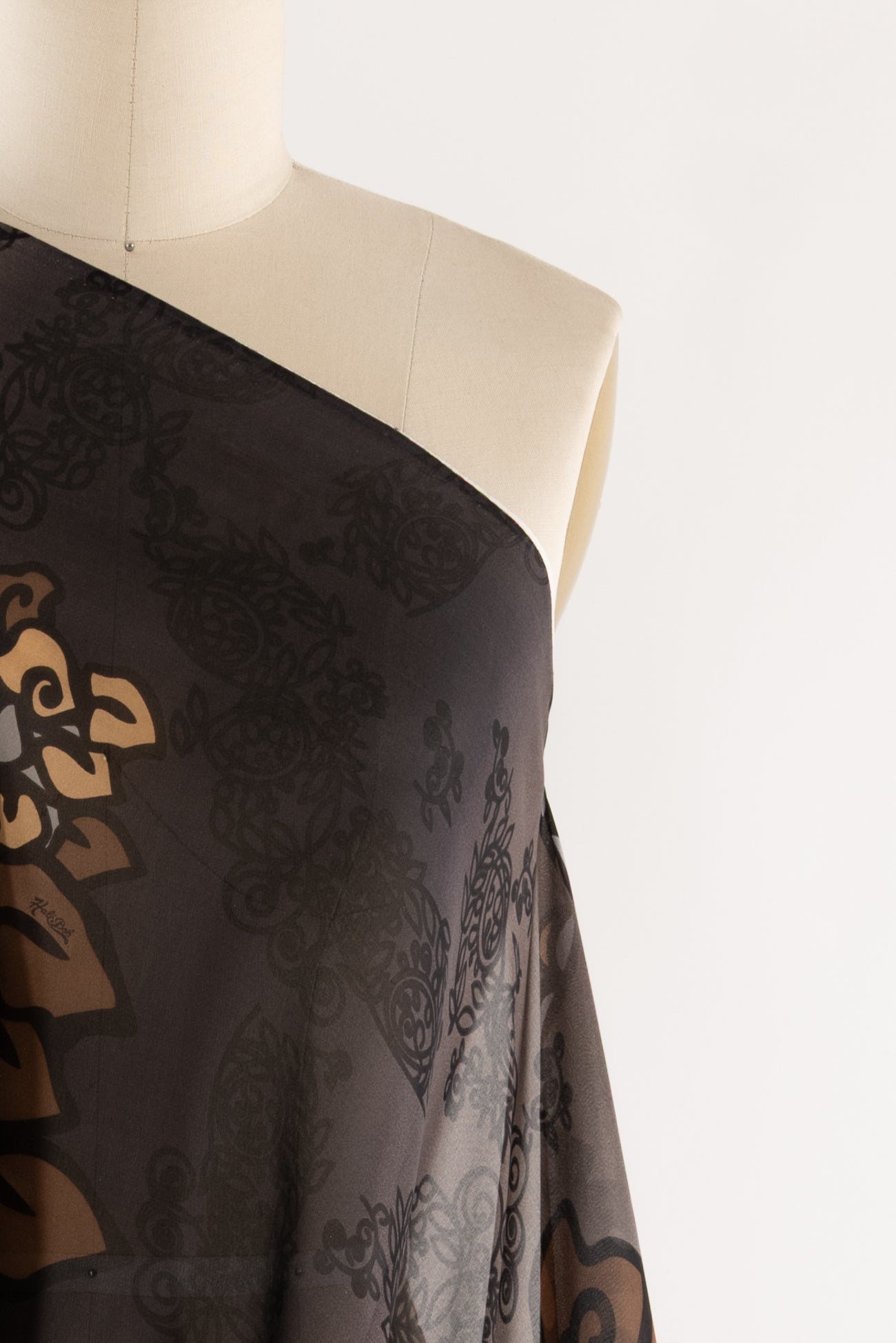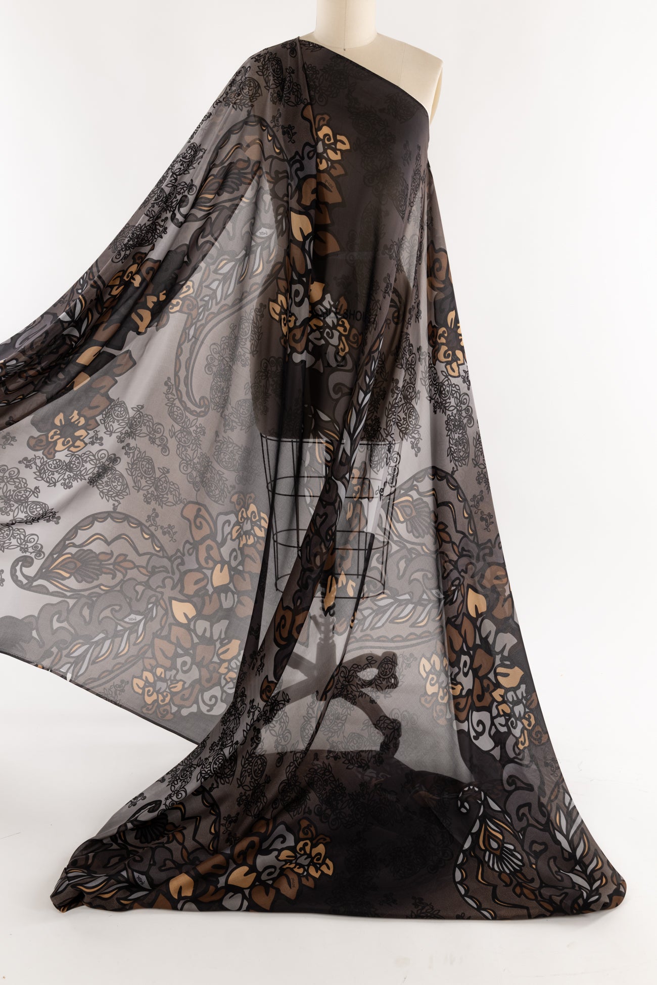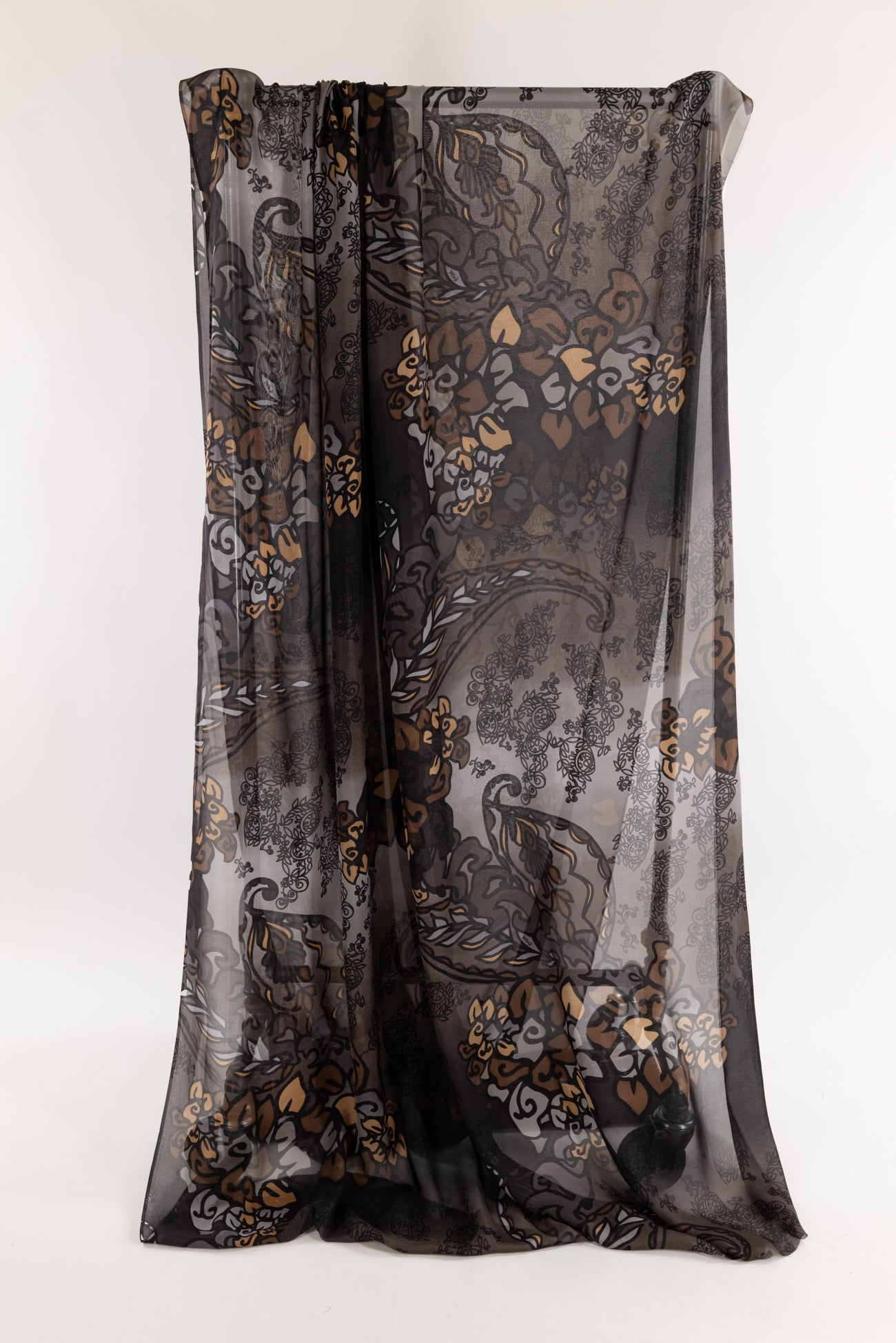 Bold and beautiful brown and black paisley in a fine habotai silk, quality deadstock from an LA designer. Lightweight, sheer, with a soft smooth silky hand, a 39" repeat and liquid drape. Quietly beautiful. To line or layer. Right for a shirt, tunic, dress, airy vest, kimono or caftan. Limited quantity.