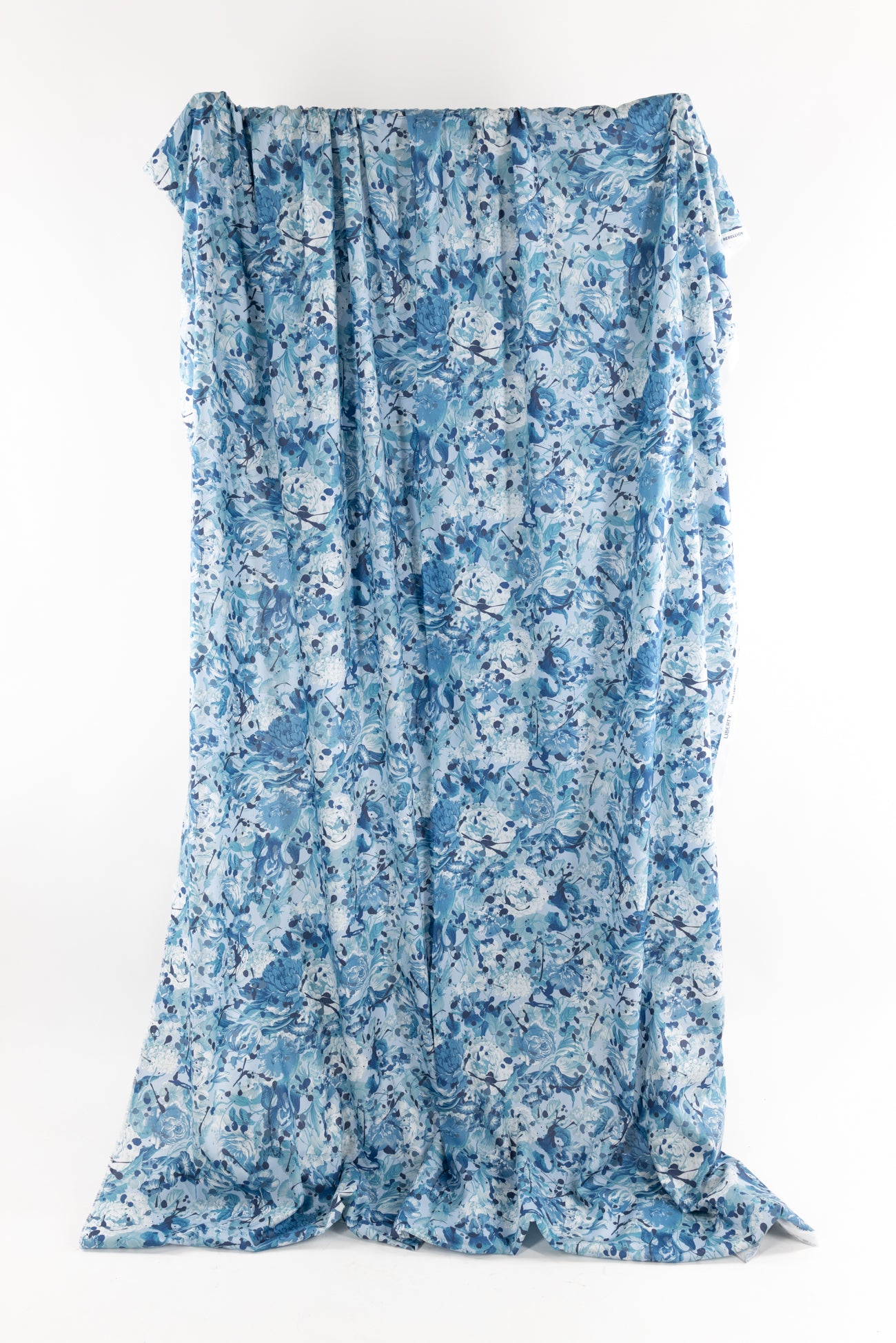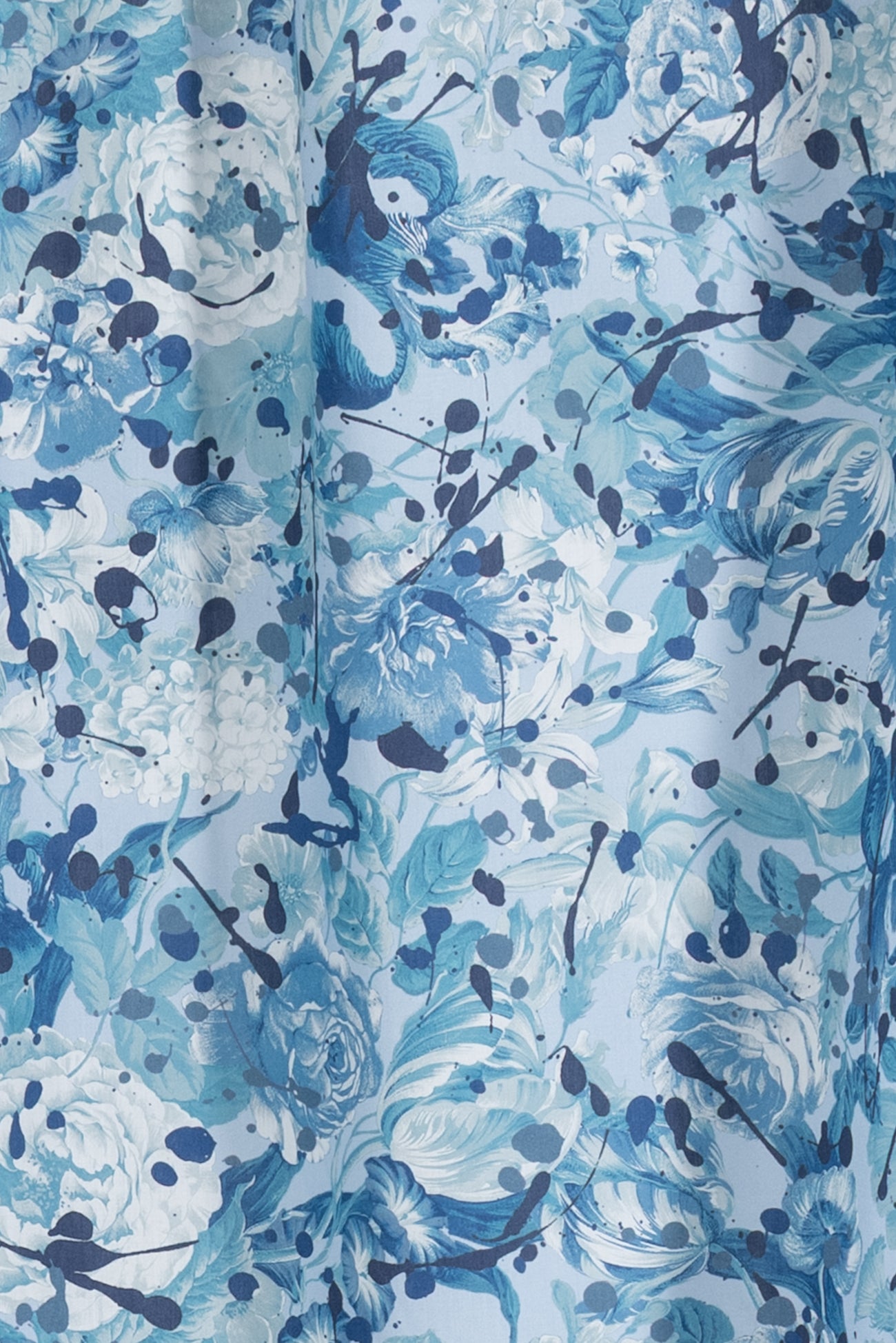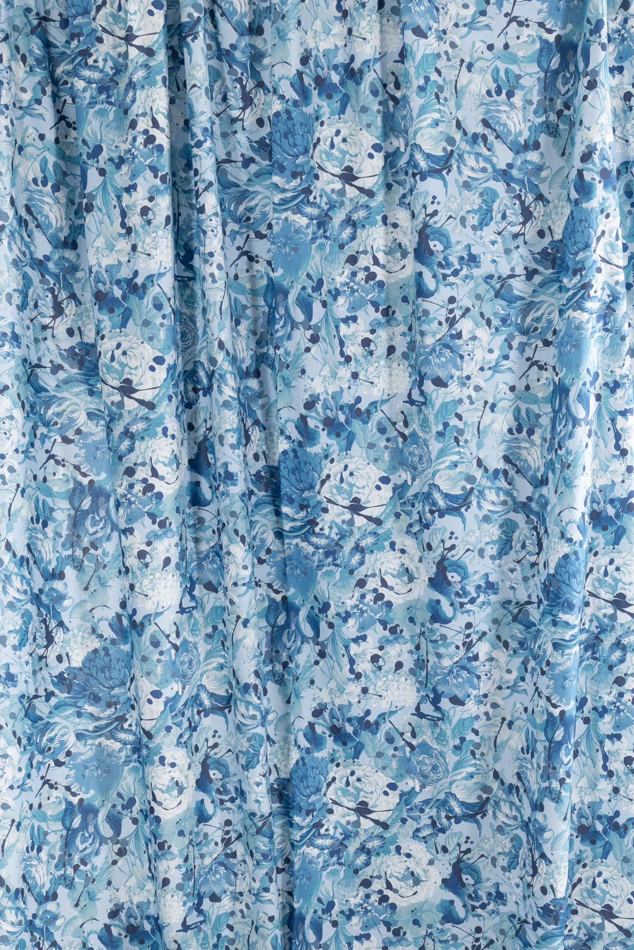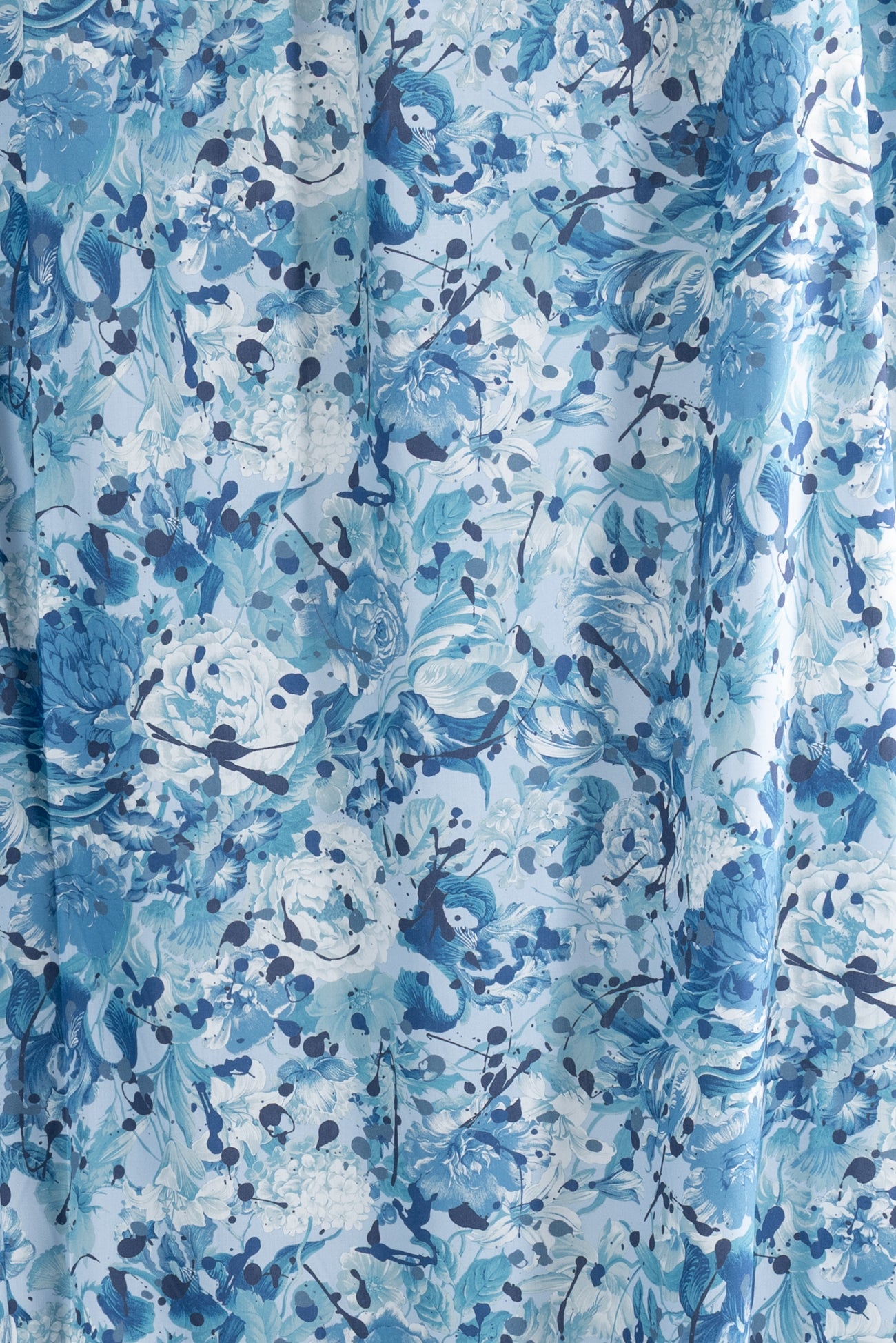 A romance of roses and tulips spattered with paint drops in shades of blue on white, a charming floral inspired by Liberty's archival studio designs with a contemporary touch. Produced in Northern Italy for Liberty of London, printed on the renowned and exceptional Tana Lawn, the cotton that behaves and feels like silk. Fine-grained, with a cool, smooth, soft hand, fluid drape and depth of color. Perfect for a shirt, dress, skirt, tunic, caftan, loungewear, children's, accessories, or home decor. Right to wear everyday or for statement pieces. One-way design 15" repeat. OEKO-TEX® certified.