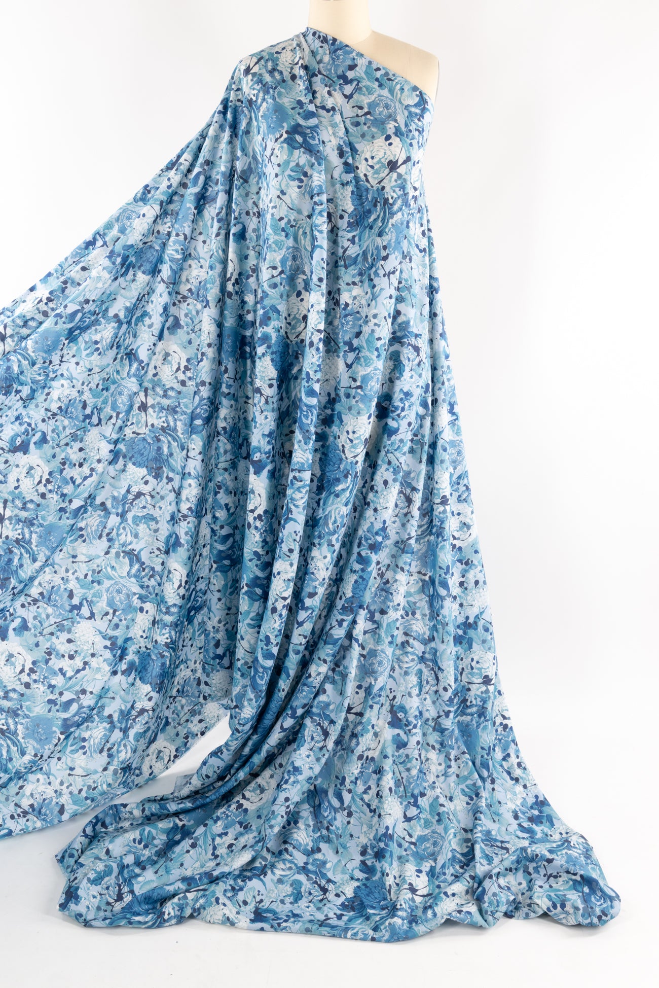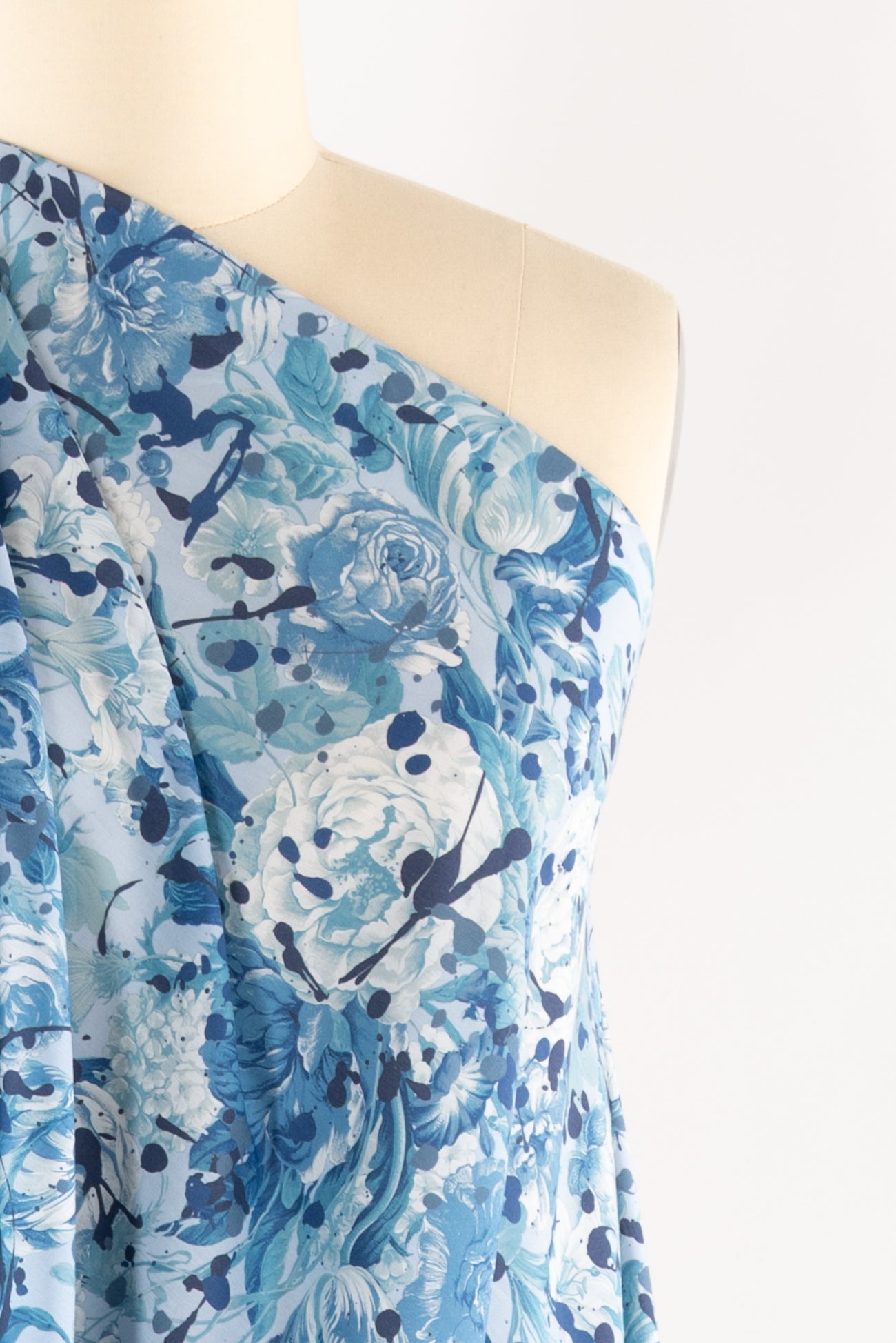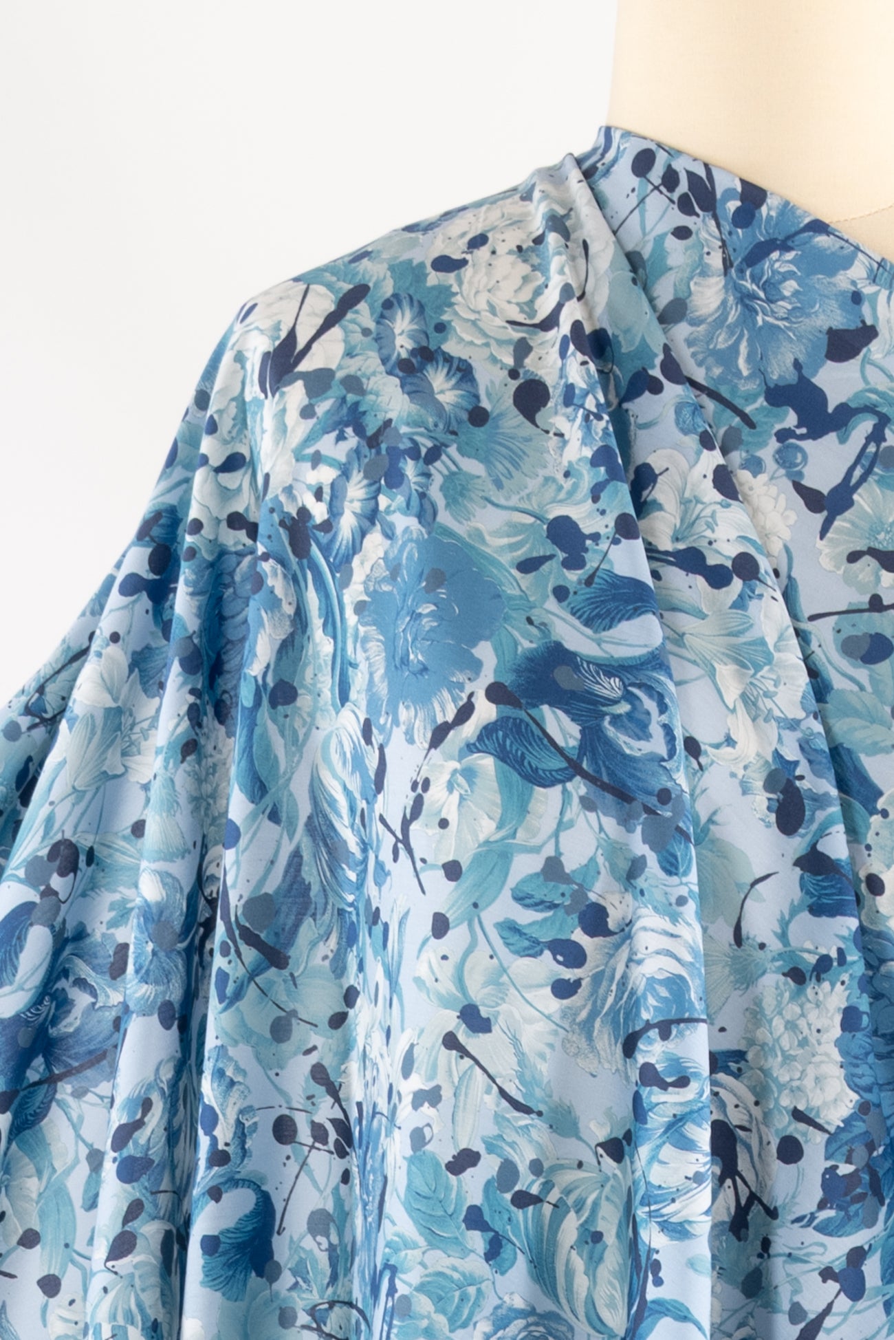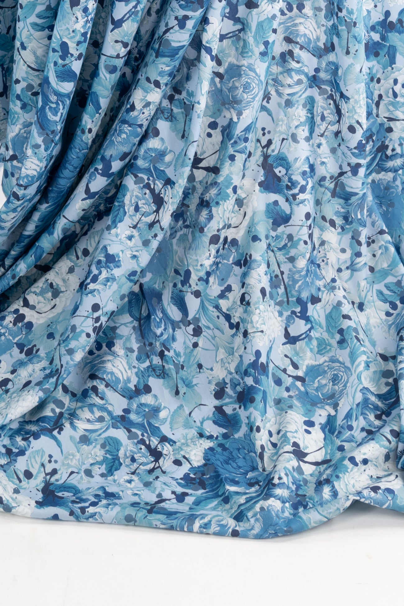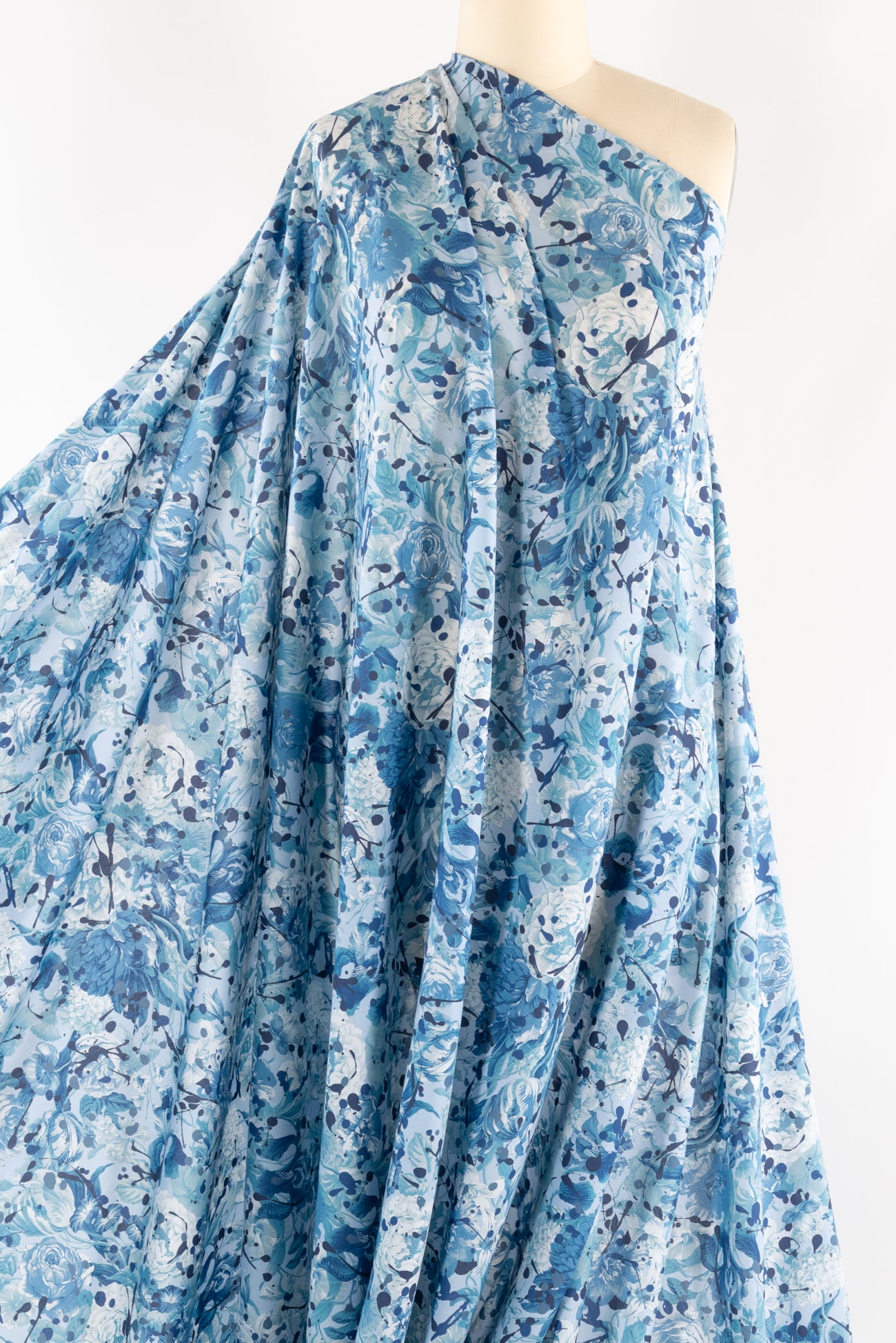 A romance of roses and tulips spattered with paint drops in shades of blue on white, a charming floral inspired by Liberty's archival studio designs with a contemporary touch. Produced in Northern Italy for Liberty of London, printed on the renowned and exceptional Tana Lawn, the cotton that behaves and feels like silk. Fine-grained, with a cool, smooth, soft hand, fluid drape and depth of color. Perfect for a shirt, dress, skirt, tunic, caftan, loungewear, children's, accessories, or home decor. Right to wear everyday or for statement pieces. One-way design 15" repeat. OEKO-TEX® certified.