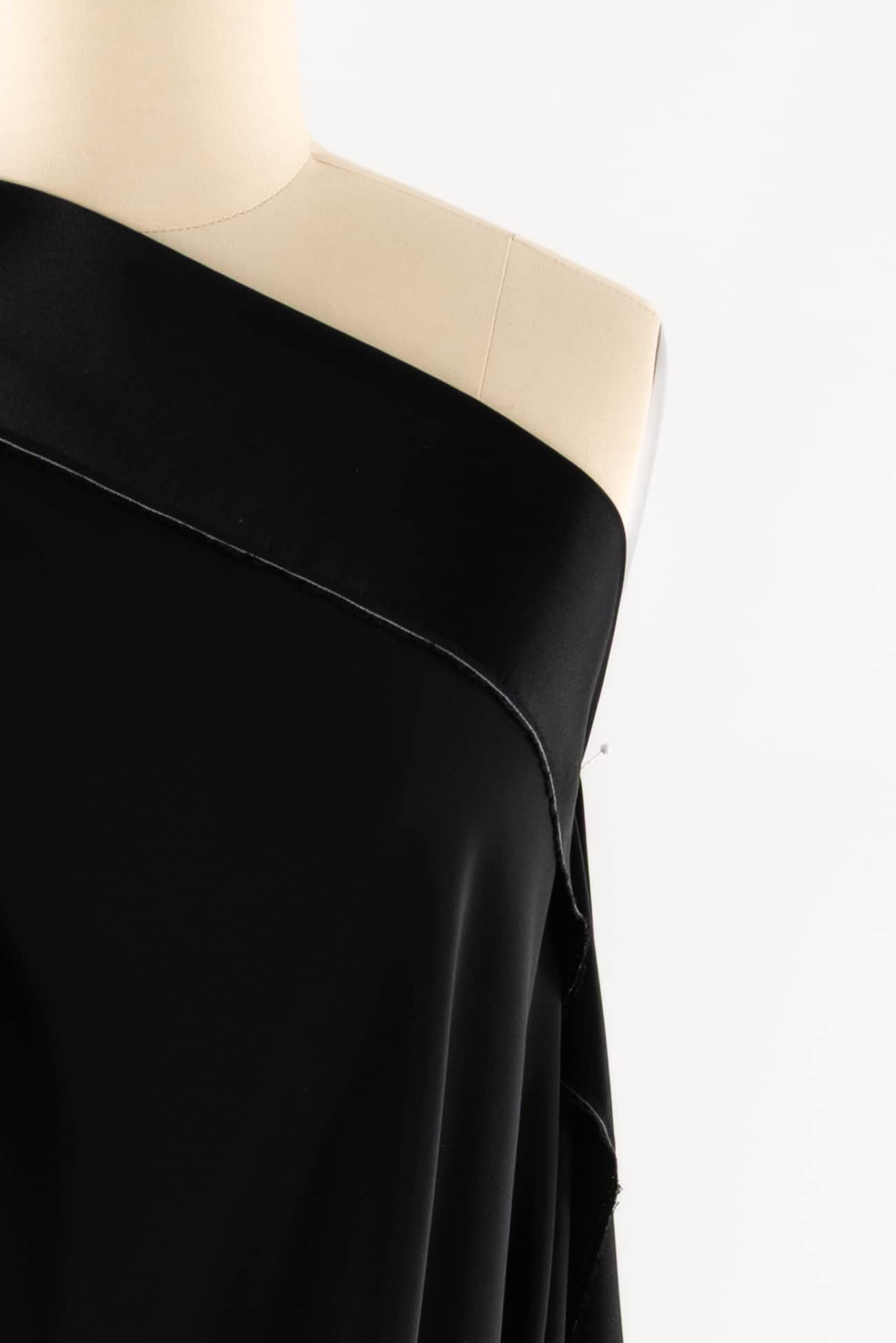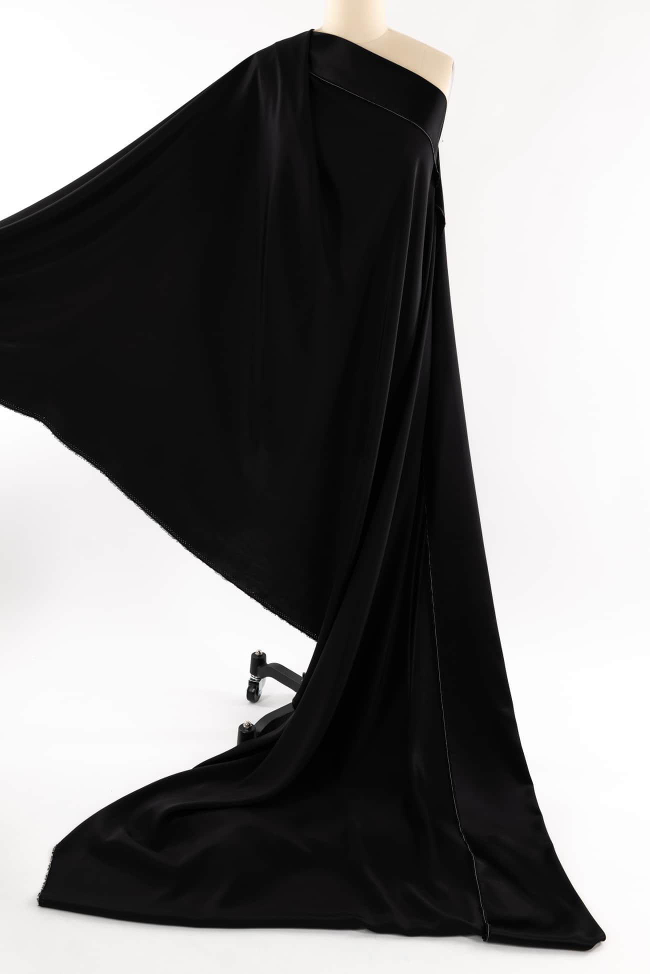 Black double sided satin back crepe silk, deadstock from an LA designer. Lightweight, opaque, with a smooth satin hand on one side, matte crepe on the other and liquid fluid drape. Right for a shirt, tunic, dress, skirt, soft pant, kimono, caftan or a luxurious lining. Limited quantity.