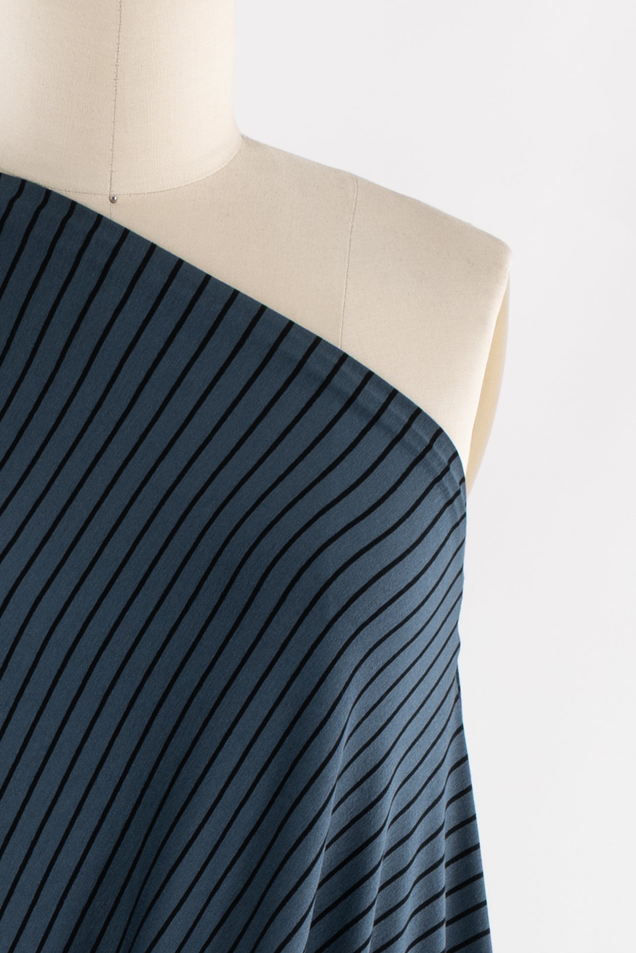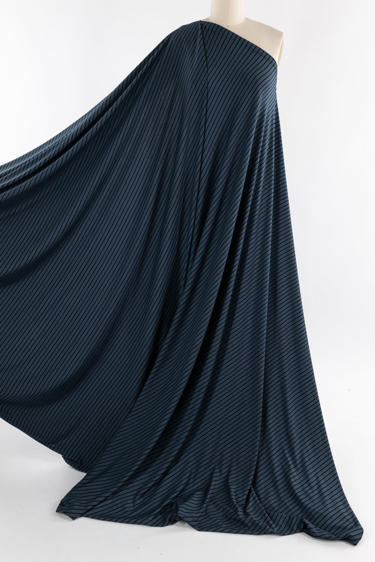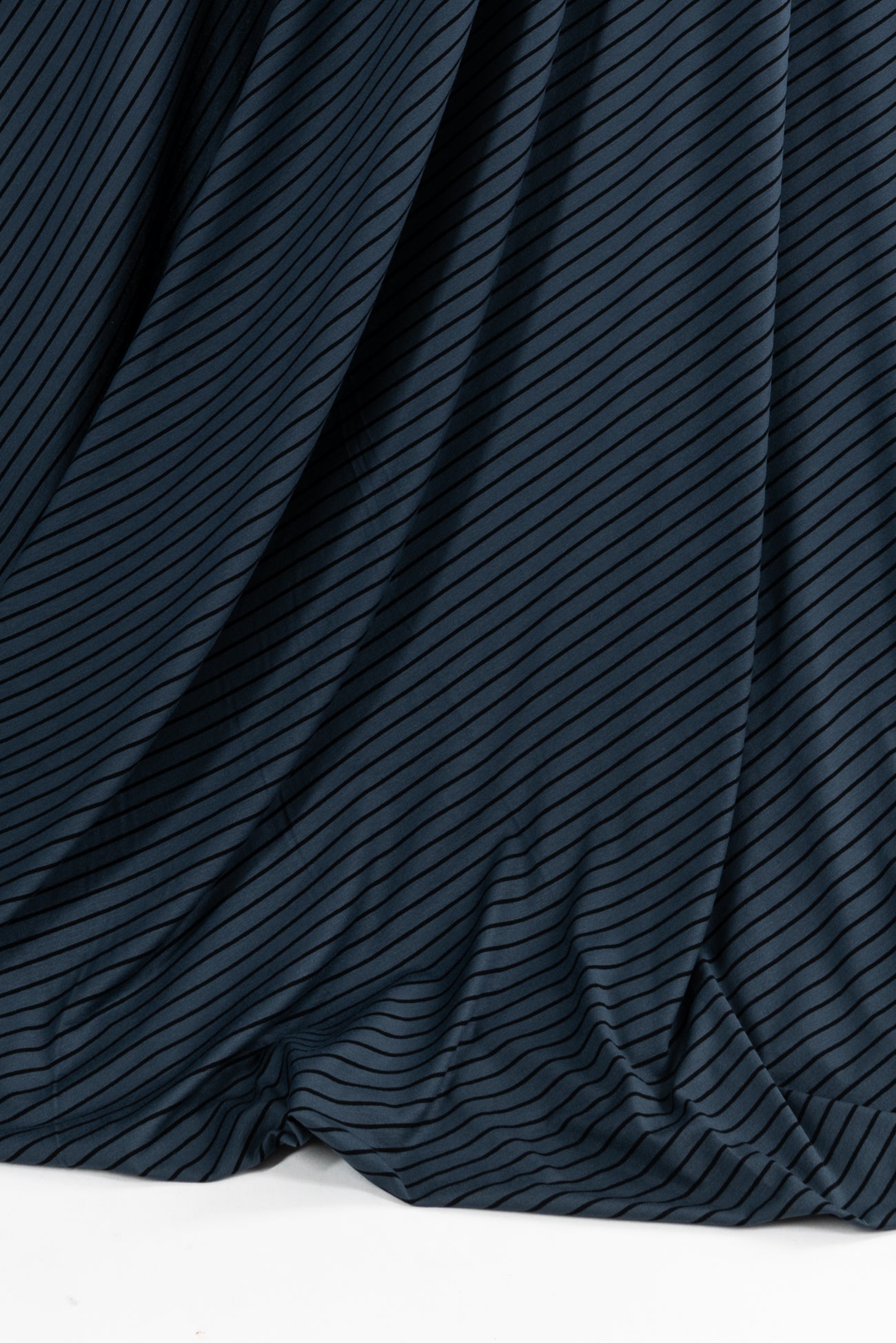 Ocean blue and black gray stripes alternate in a beautiful quality rayon knit. Deadstock, manufactured in the USA, this is a perfect light/mid-weight jersey with enough substance and stability to skim the body in the most flattering way. Opaque, with 4-way stretch and some rolling at the cut edge. A beautiful knit with a soft hand and drape, ½" repeat and a smooth matte finish. Just right for t-shirts, tunics, dresses, soft pants, leggings, a cardi, skirt, men's, or children's. Also great for trims, bindings, and contrast pieces.