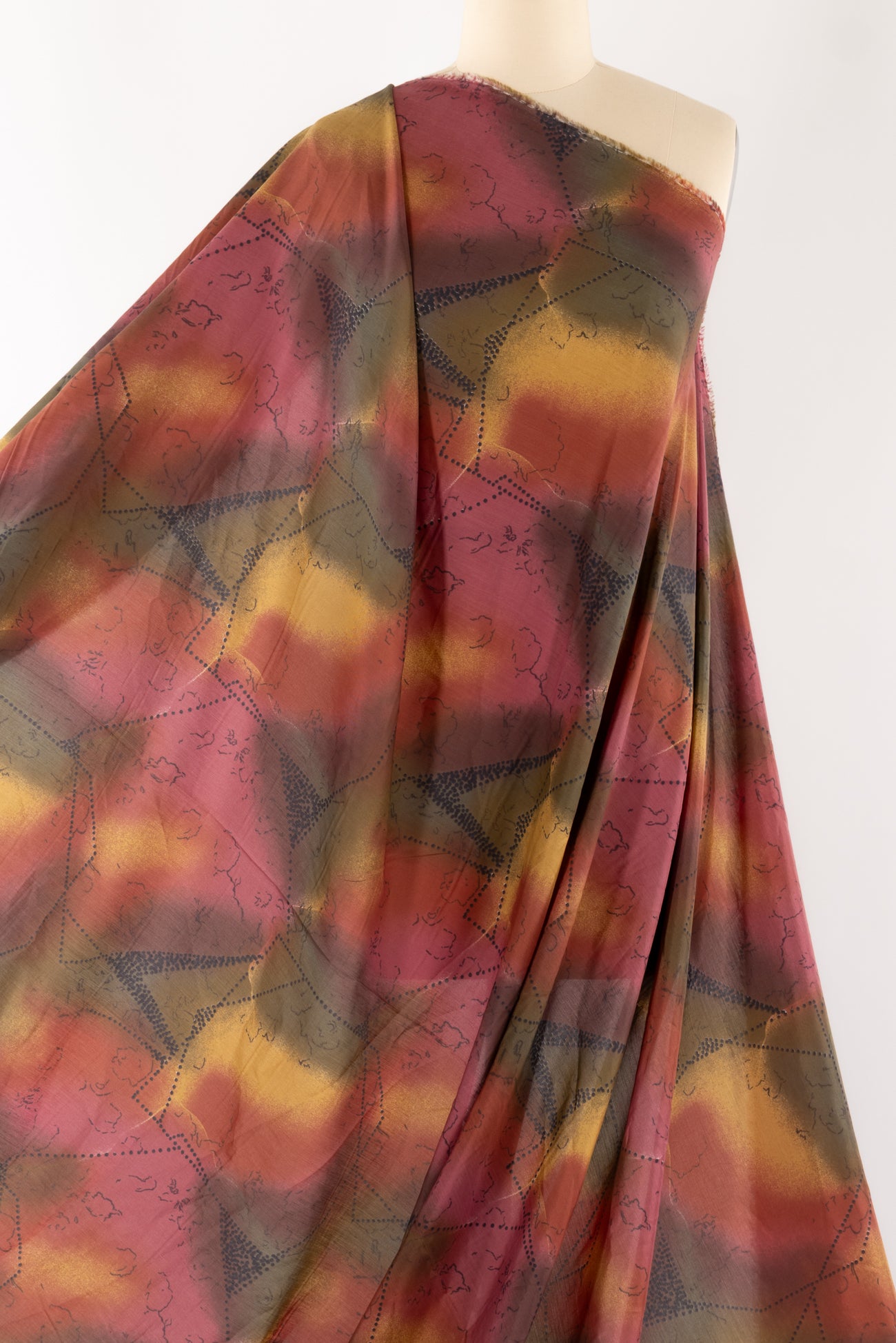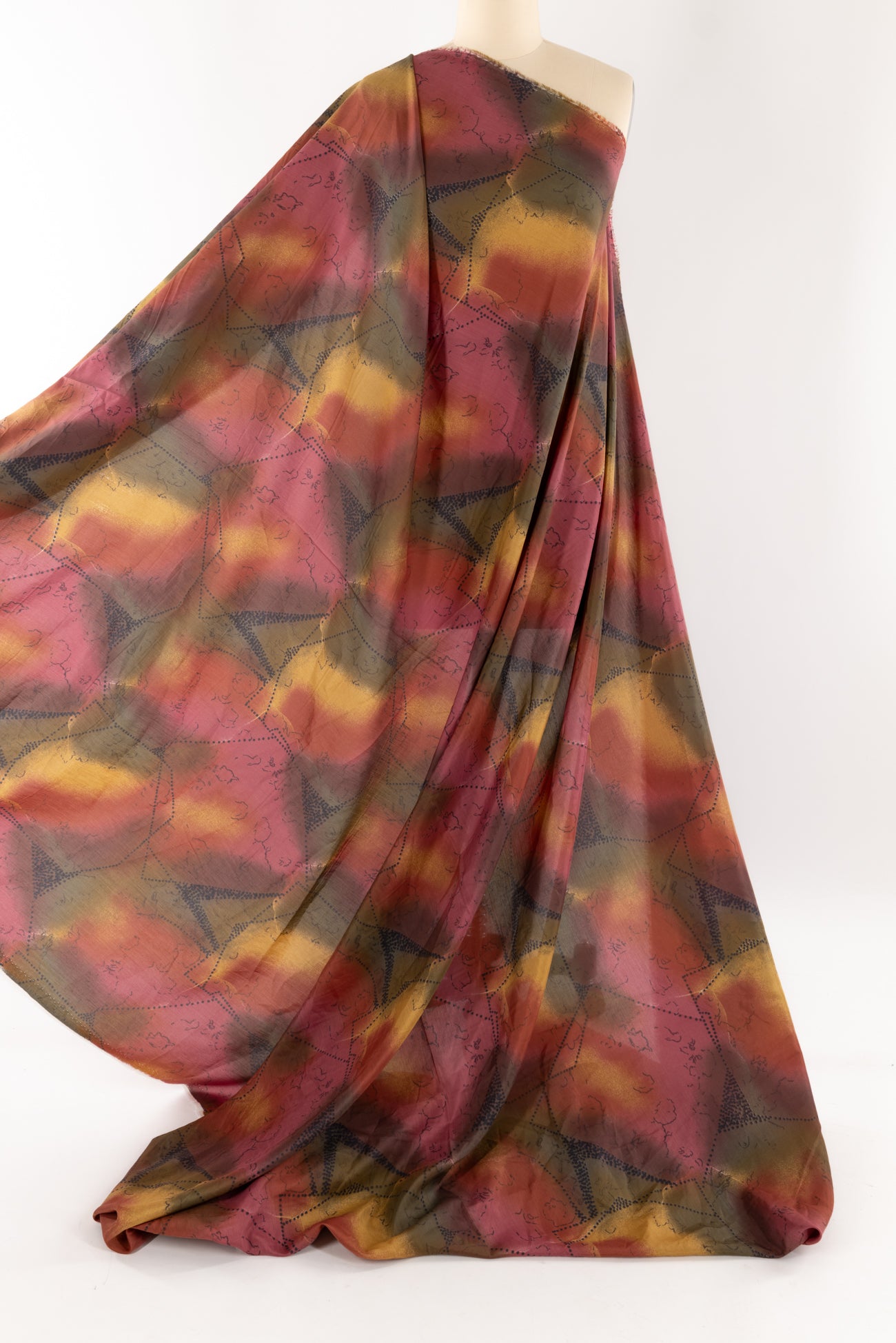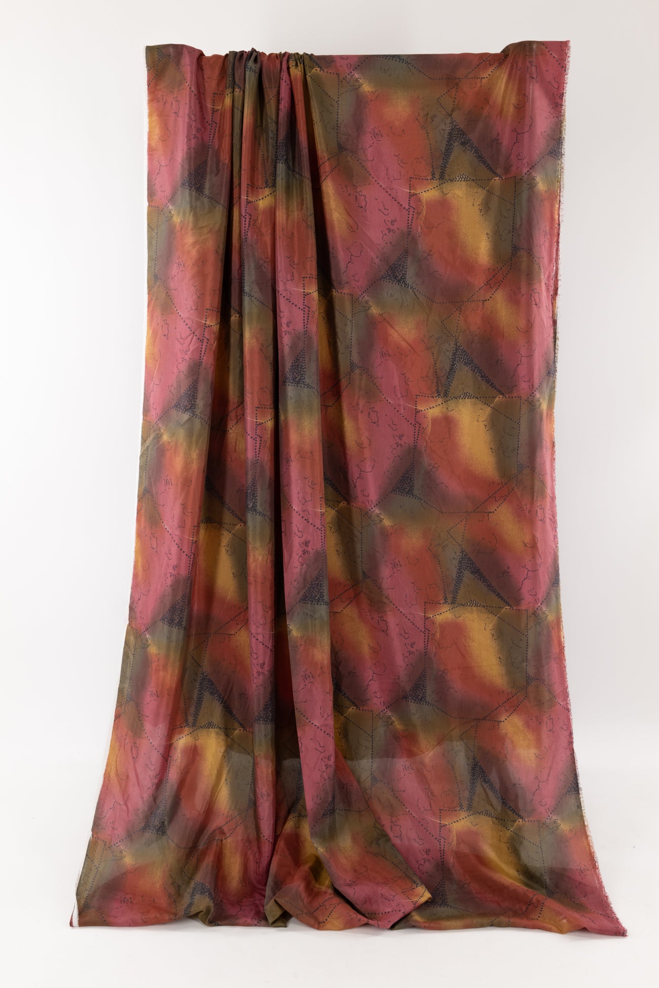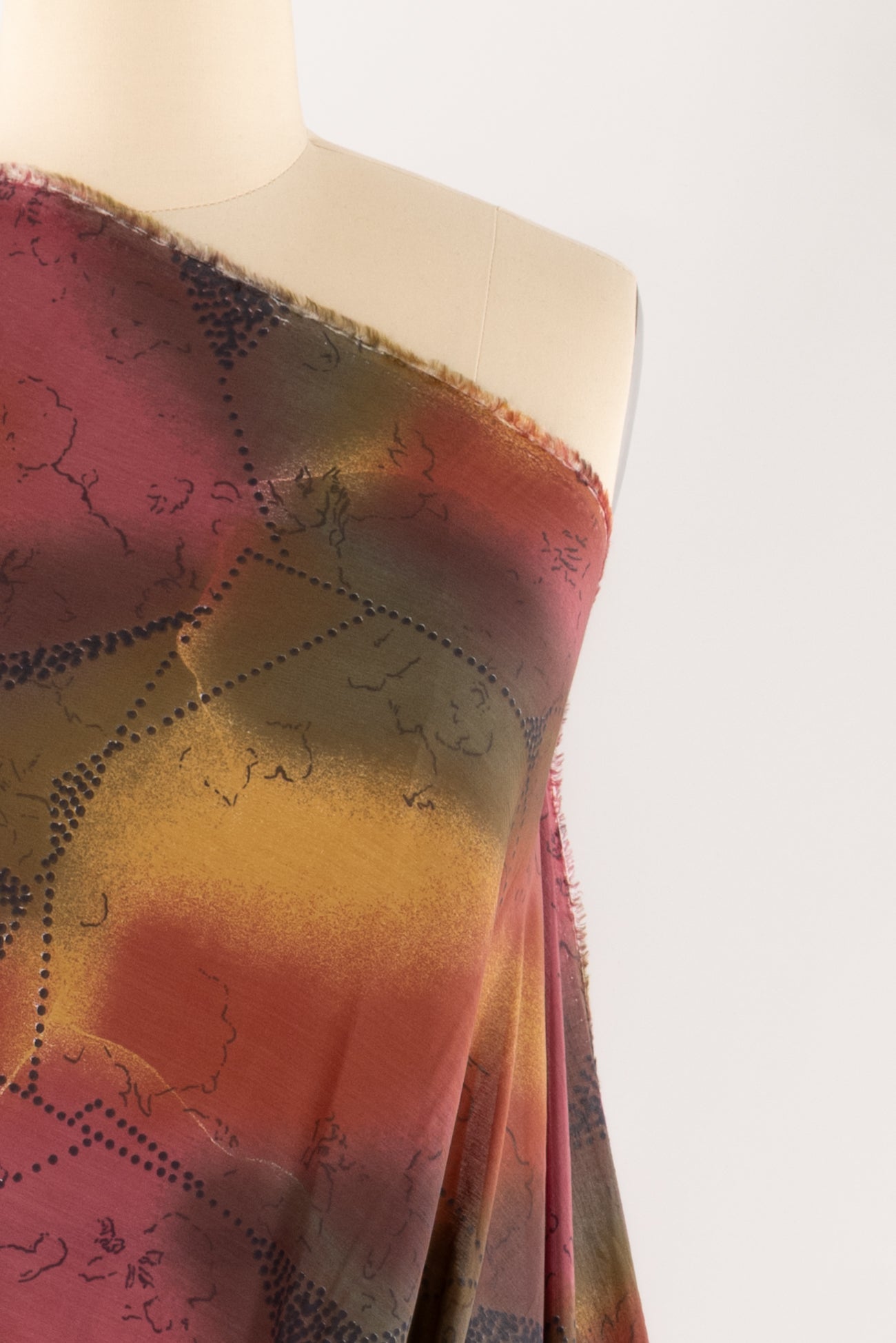 Stunning abstract in desert colors enhanced with black dots and scribbles, digitally printed on fine quality viscose, deadstock from an Italian mill. Lightweight, opaque, with a silky smooth hand, a 16¼" repeat and fluid airy drape. Right for a dress, shirt, tunic, soft pant, kimono, caftan, jumpsuit, loungewear, men's or children's.
