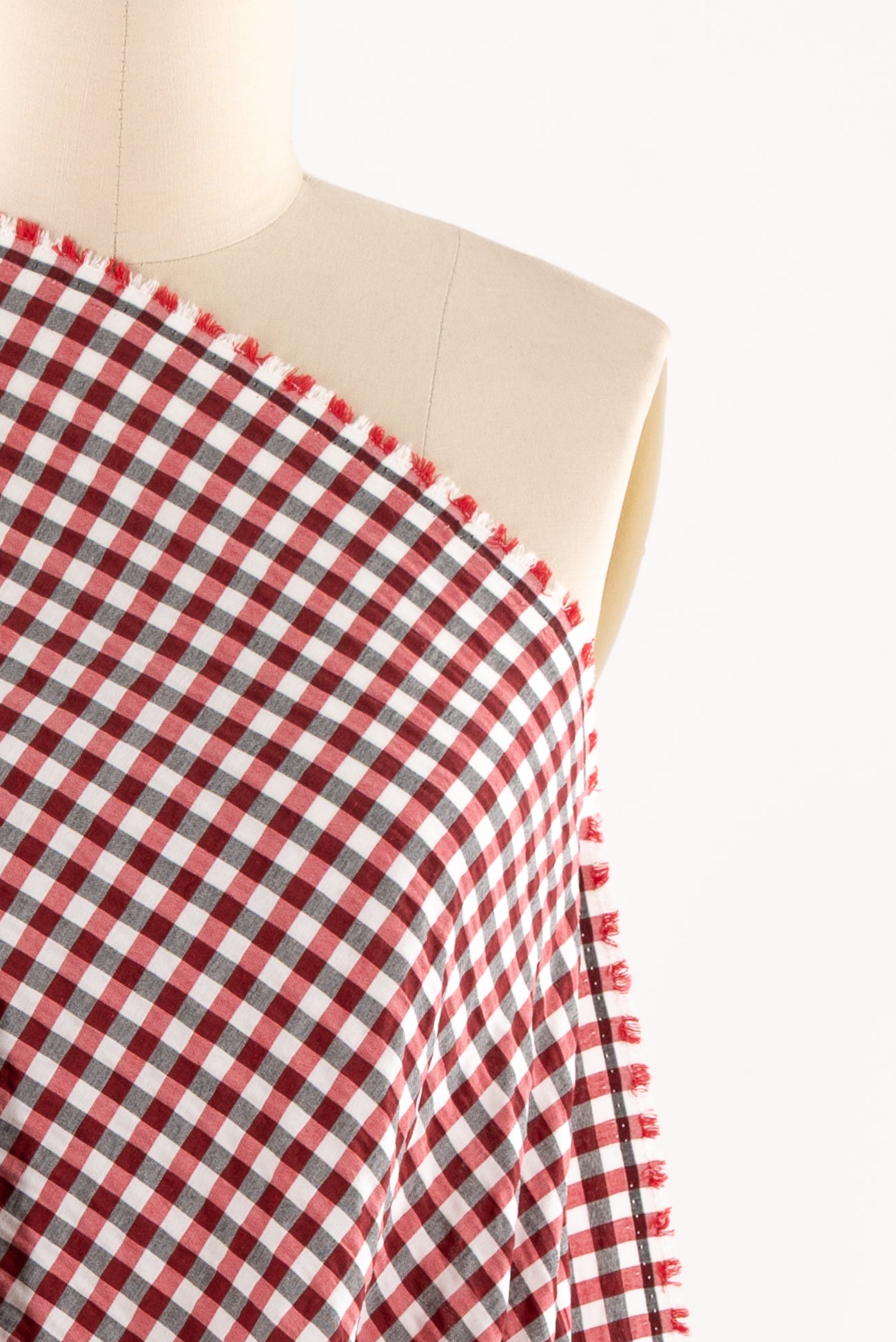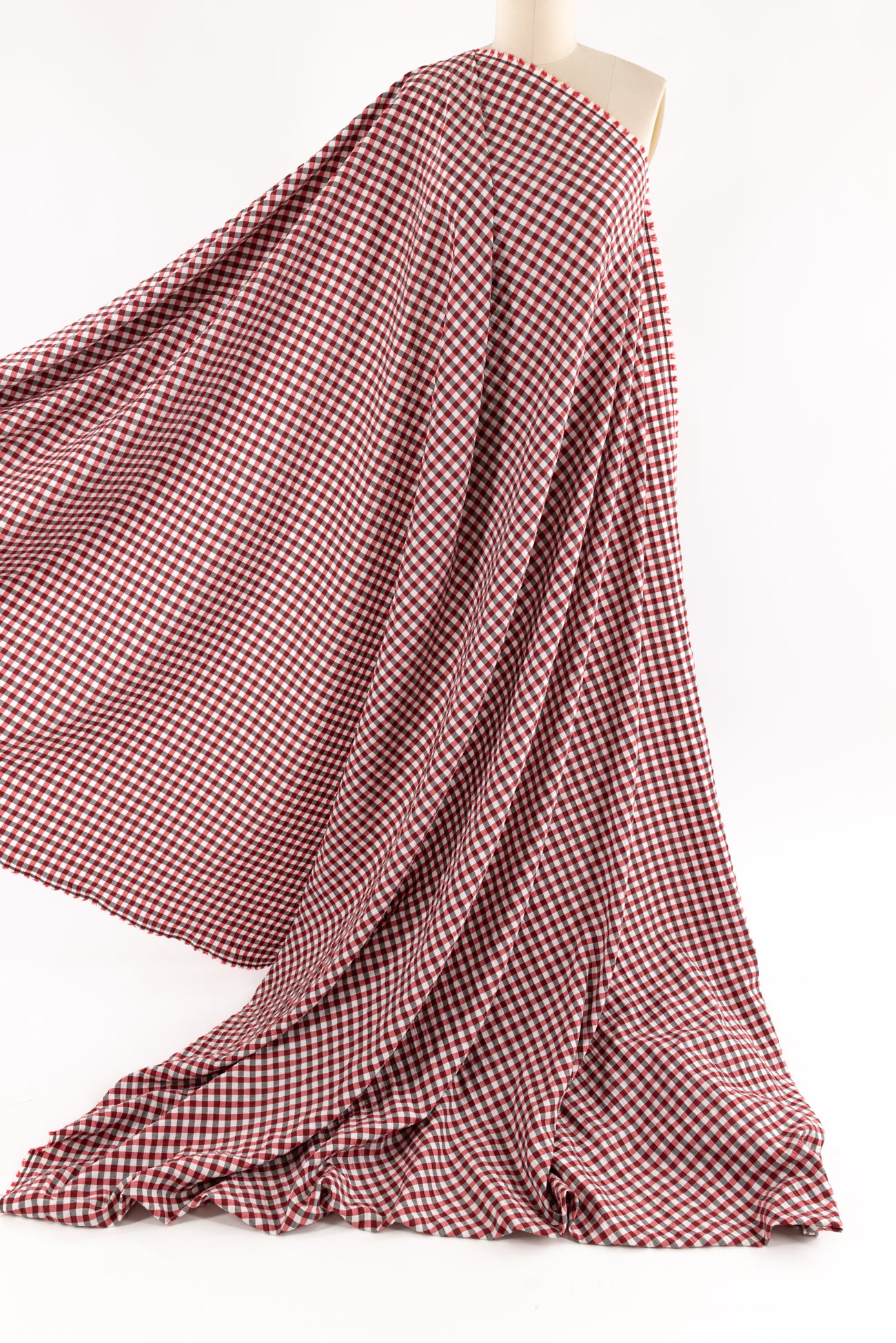 Sophisticated take on gingham in red, black, and white, deadstock from LA cult couturier Jane Mohr for Dress to Kill. Lightweight, opaque, with a light overall plissé pucker, smooth hand, and airy drape. Right for a dress, shirt, skirt, tunic, caftan, menswear, children's. Marcy says, 'I love gingham, from Dorothy's dress in The Wizard of Oz to Brigitte Bardot's gingham wedding dress that turned this fabric into a French fashion staple, used today by designers like Dior and Prada.'