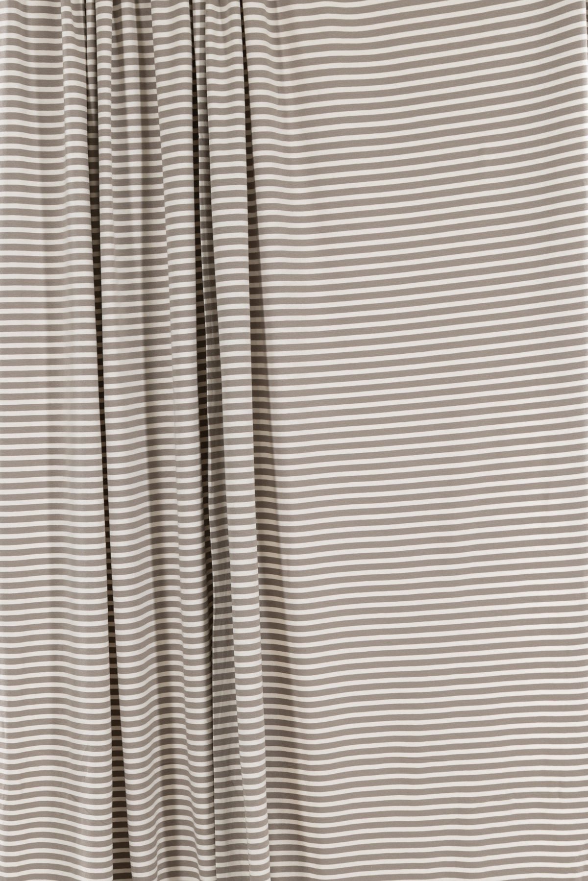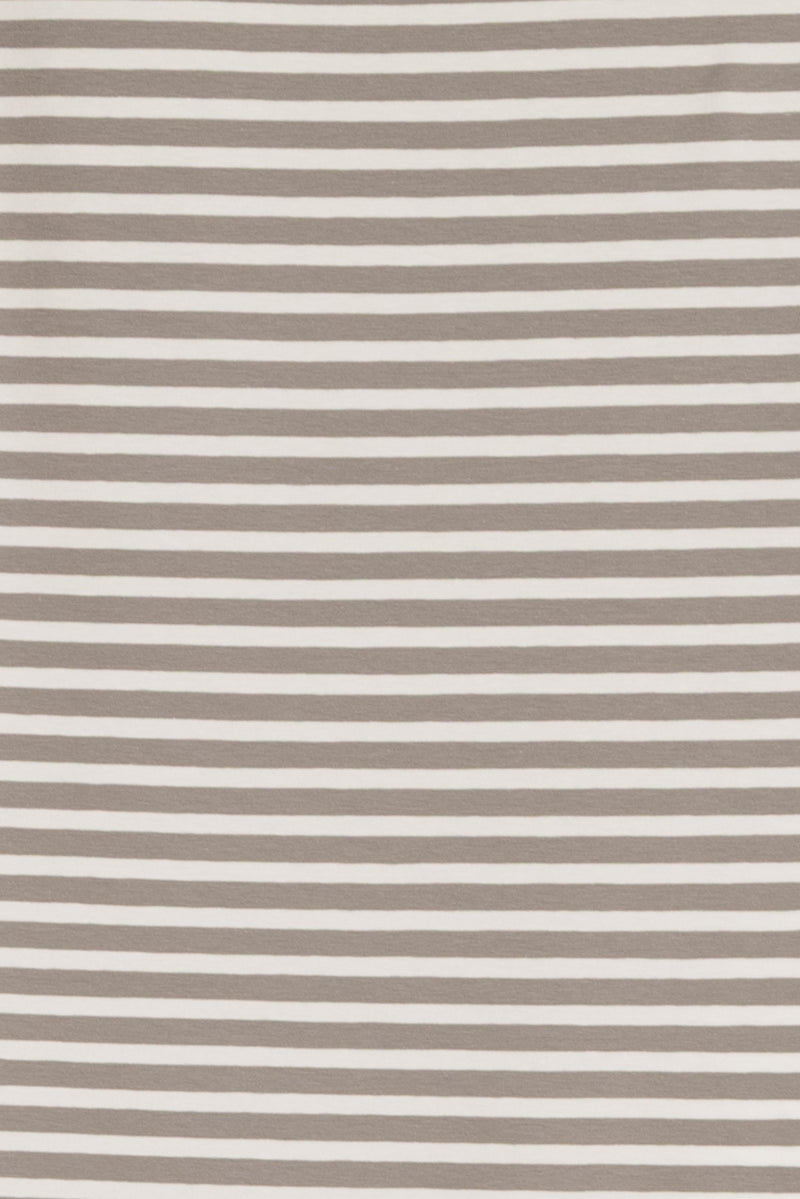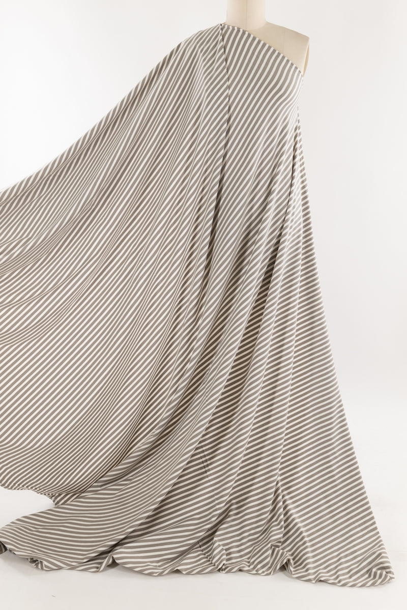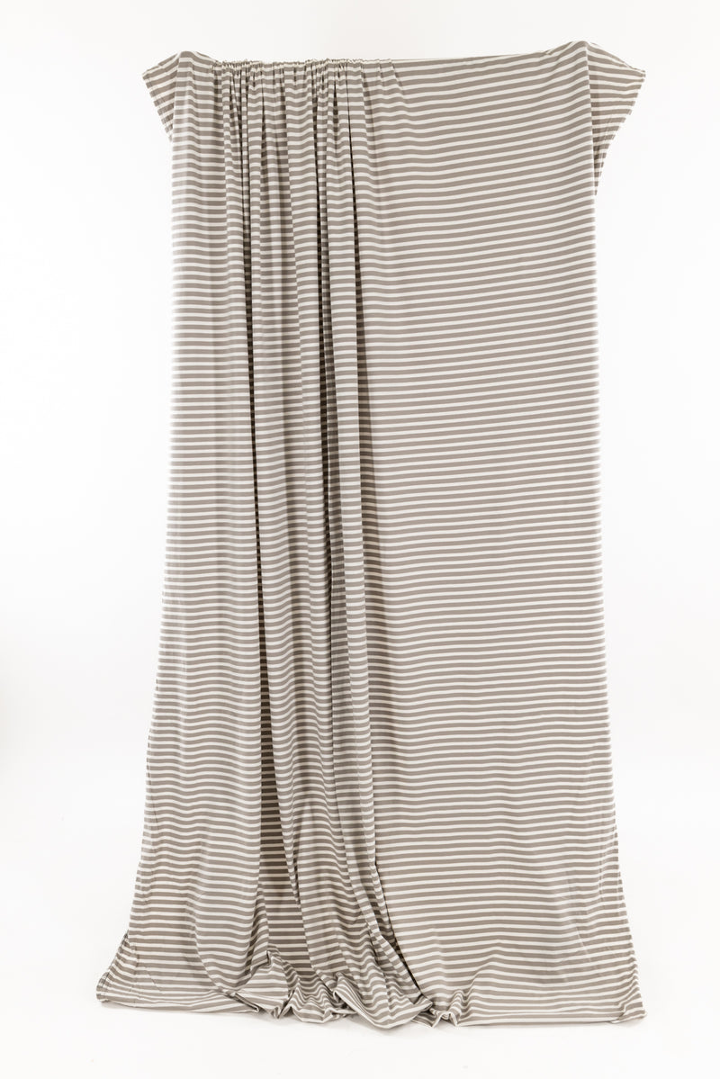 Charming gray/taupe and warm white stripes in a fine quality cotton spandex jersey produced in South Korea. Mid-weight with an appealing soft hand and drape, ½" repeat and 4-way stretch with some rolling at the cut edge. Right for a t-shirt, cardi, top, tunic, dress, skirt, soft pants, sweater, loungewear, kimono, caftan, jumpsuit, men's, children's clothes, or accents. Oeko-Tex® certified.