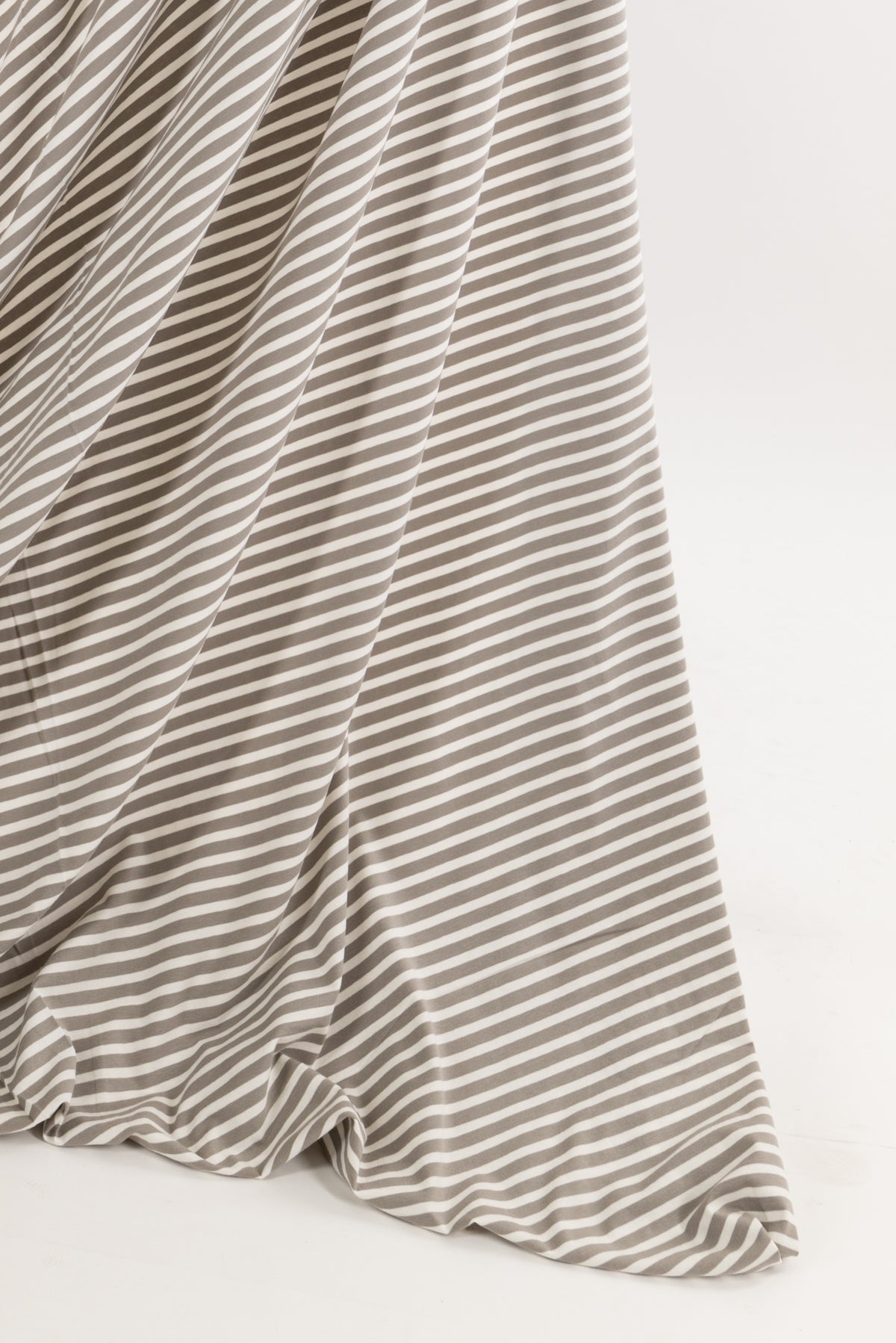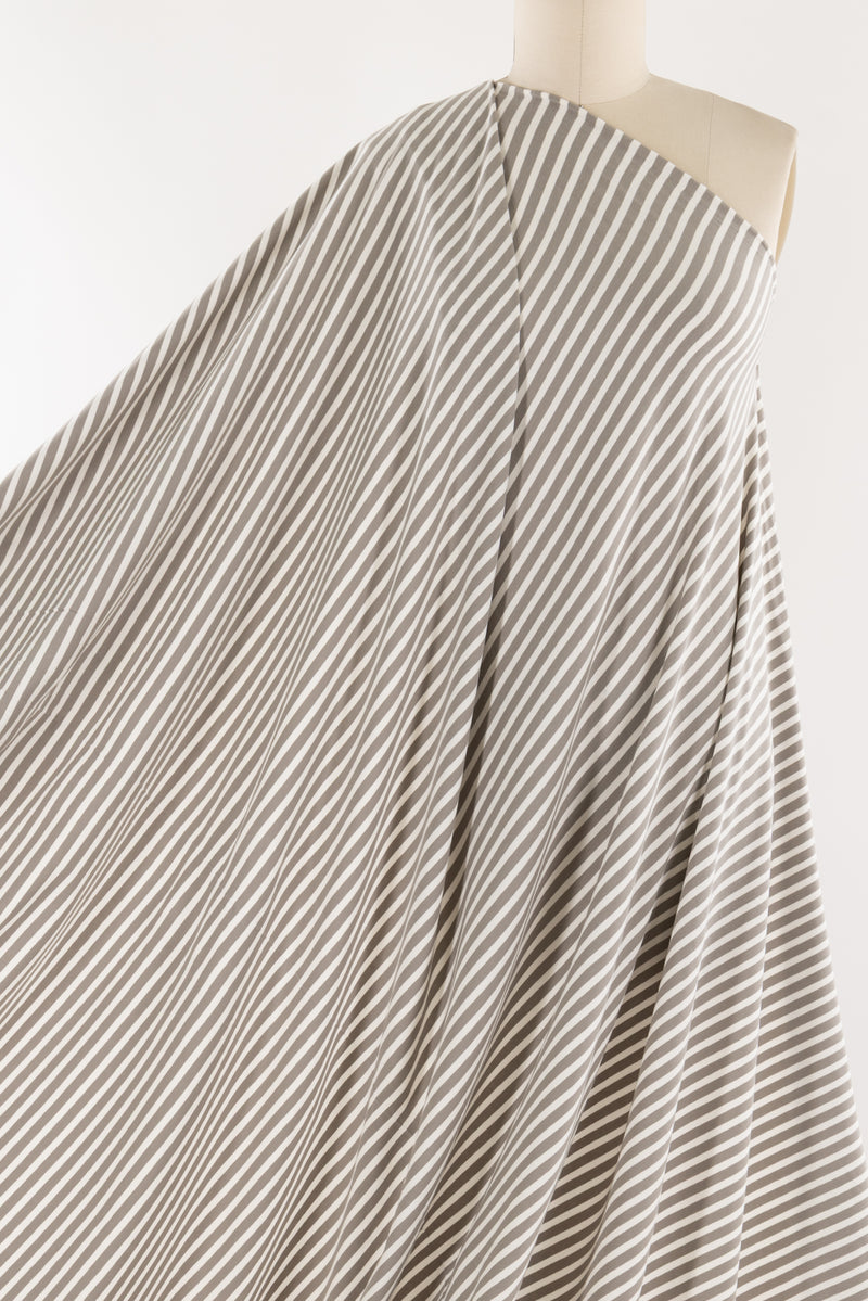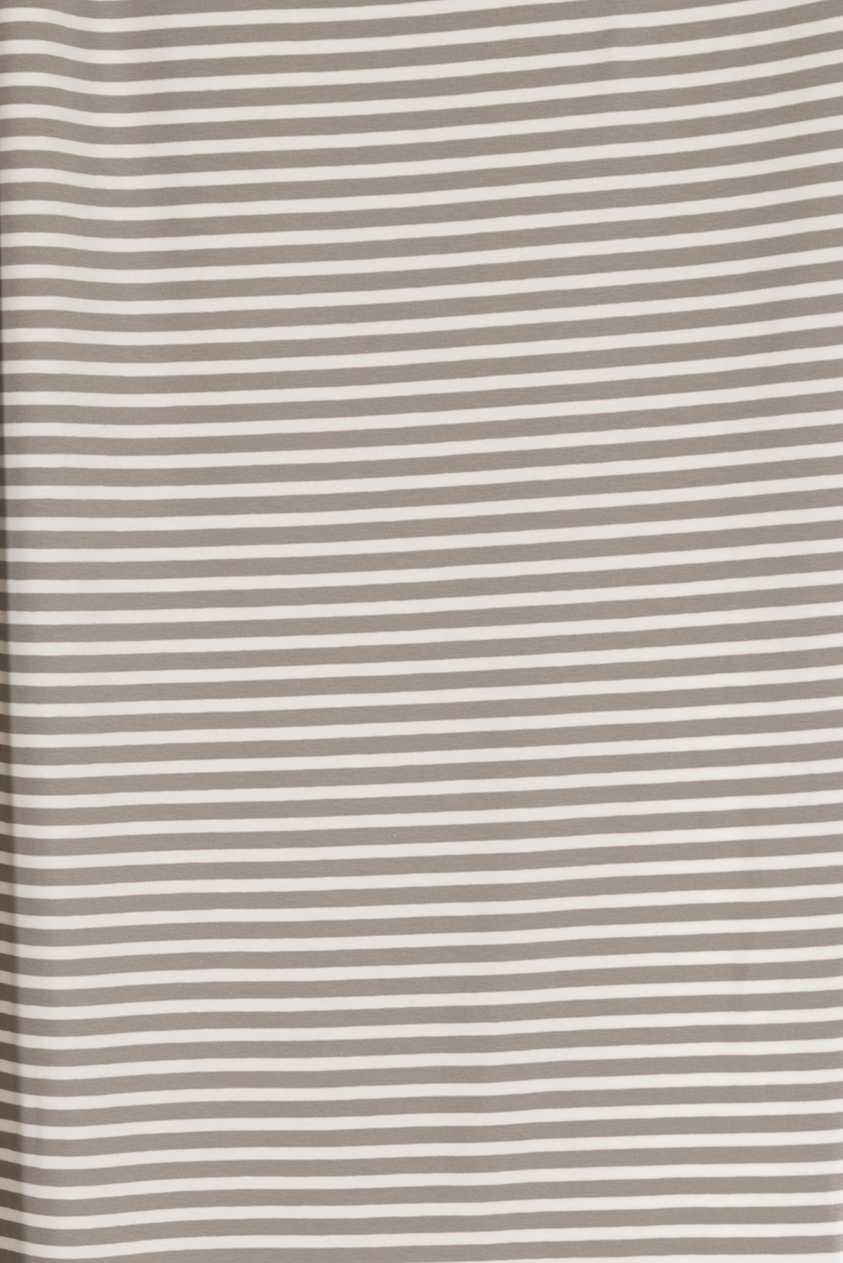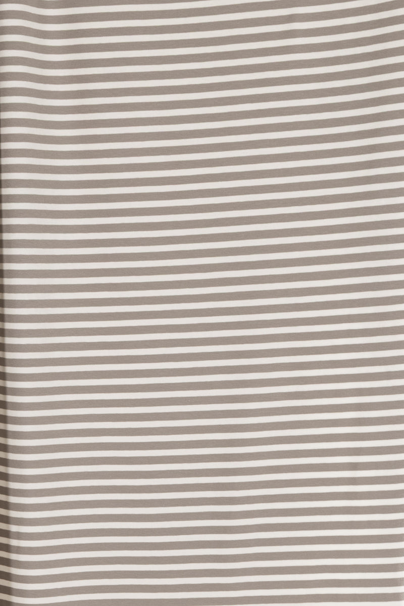 Charming gray/taupe and warm white stripes in a fine quality cotton spandex jersey produced in South Korea. Mid-weight with an appealing soft hand and drape, ½" repeat and 4-way stretch with some rolling at the cut edge. Right for a t-shirt, cardi, top, tunic, dress, skirt, soft pants, sweater, loungewear, kimono, caftan, jumpsuit, men's, children's clothes, or accents. Oeko-Tex® certified.