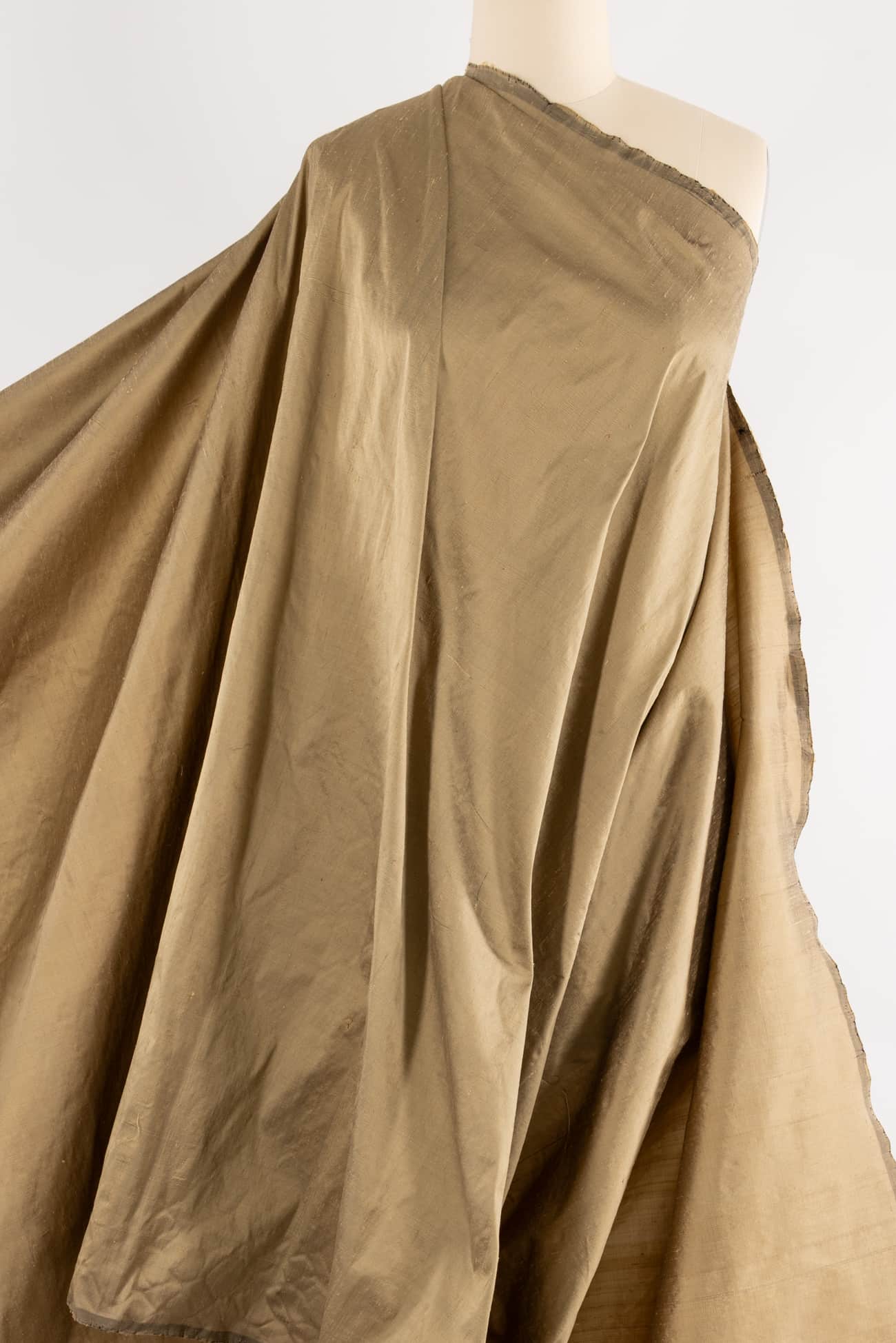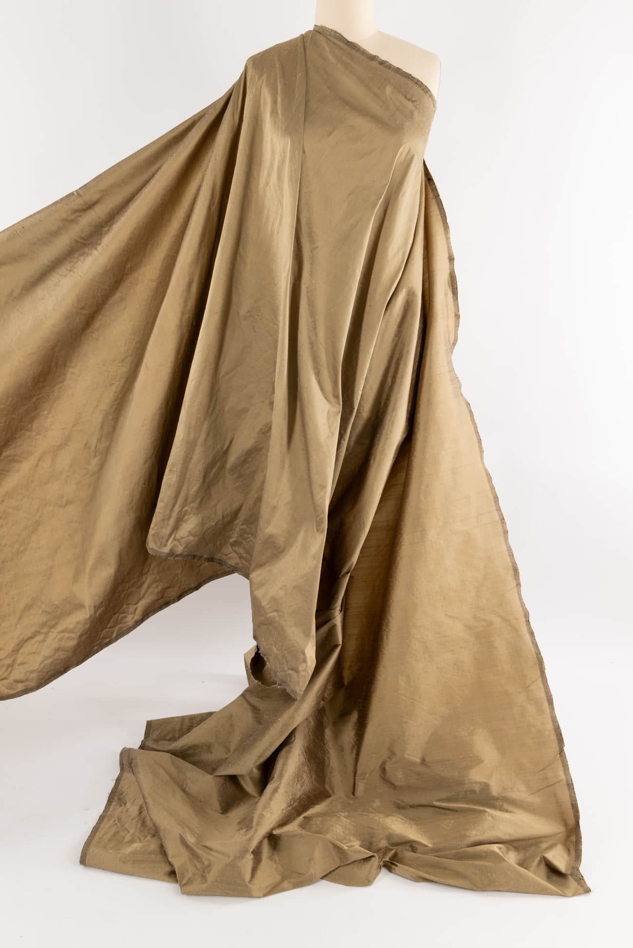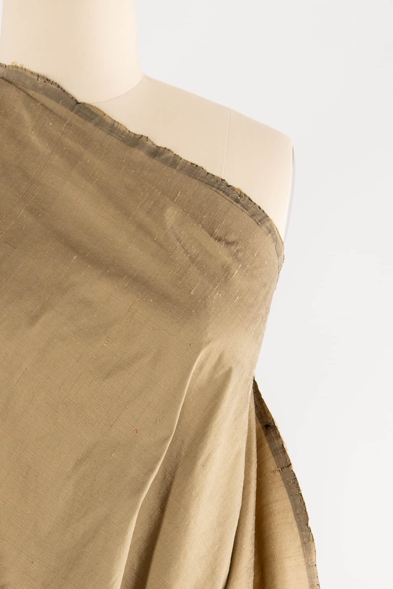 Classic silk dupioni* in a rich warm toned neutral; a kicked back gold crossweave, a mix of pale gold/yellow and black threads in a fine quality deadstock from an LA designer. Light/shirting weight, opaque, softly textured, with a soft hand and lightly crisp yet malleable drape. Dress it up or down, make a dress, shirt, skirt, vest, soft pant, light jacket, or duster coat. Makes a luxurious lining, works for accessories and home decor too. A silk jacket or vest is a basic in my wardrobe and makes a smooth layering piece to slide over/under other garments and travels well.