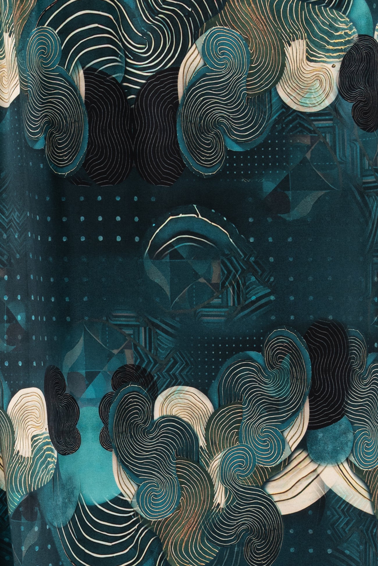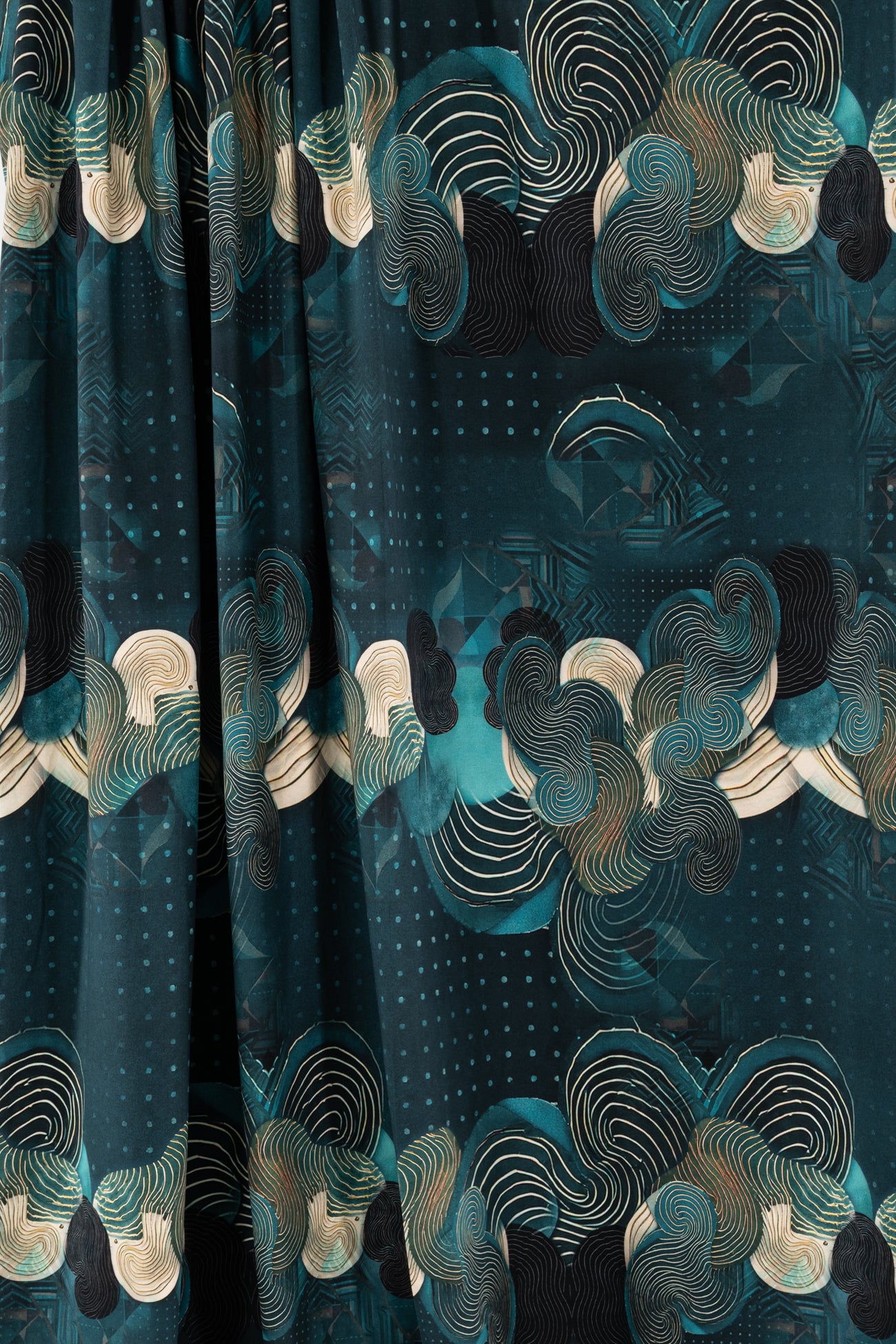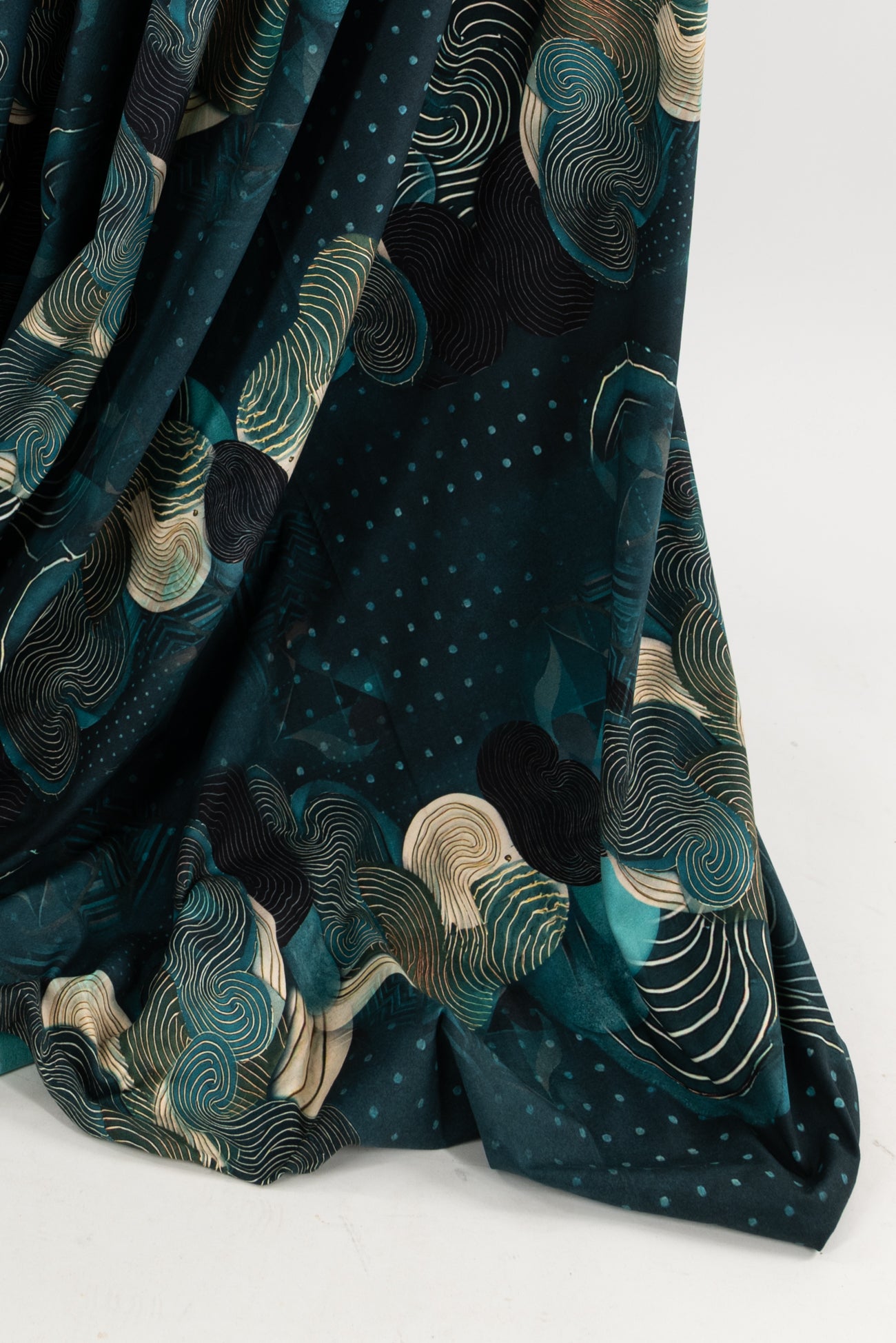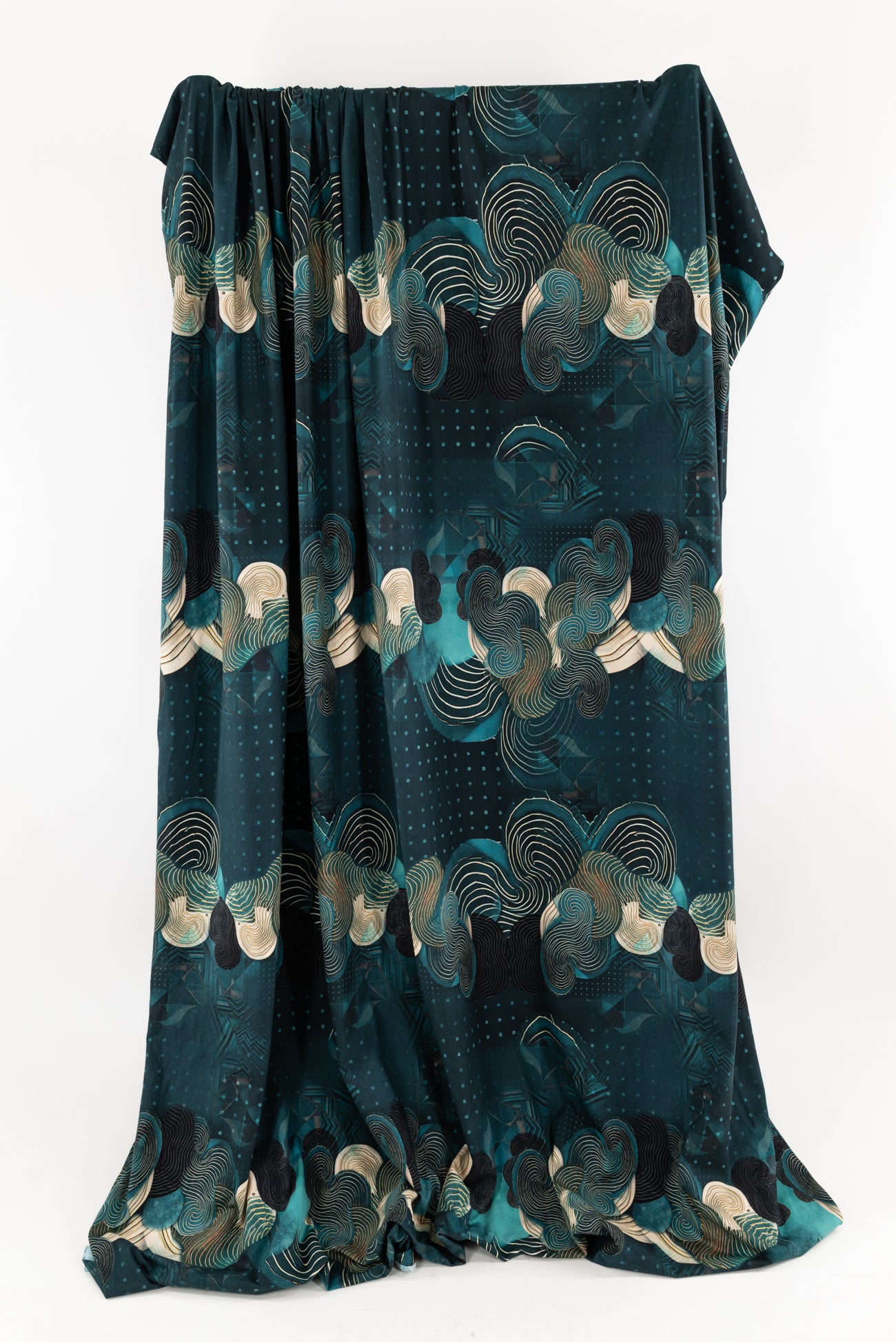 Rich shades of teal, turquoise, navy, sand, gray, and black, elegantly combine fluid spirals with dots and geometrics. Luxurious cotton knit jersey, digitally printed in the Netherlands. Impeccable quality, light/mid-weight, opaque, with a flattering body-skimming flow, appealing soft hand, fluid drape, crosswise stretch, some lengthwise stretch, a 36½" repeat, and some rolling at the cut edge. Ideal for a wide range of garments, t-shirt, tunic, dress, skirt, soft pants, loungewear, caftan, kimono, or children's. Oeko-Tex® certified.