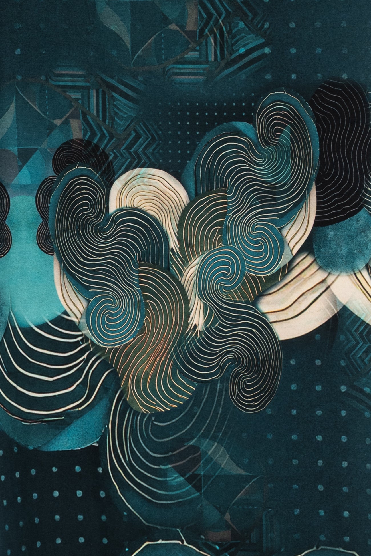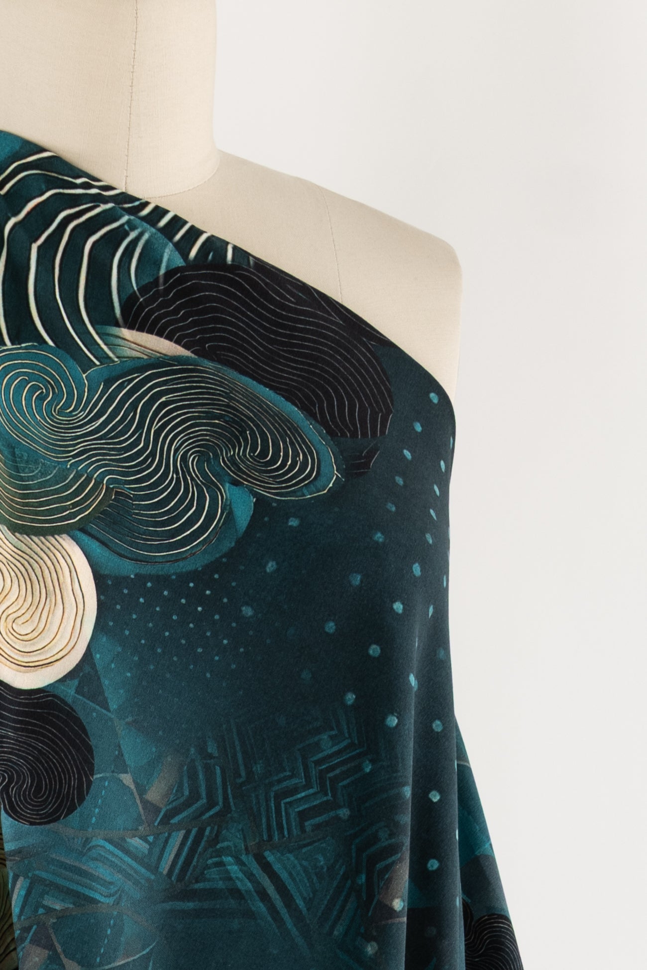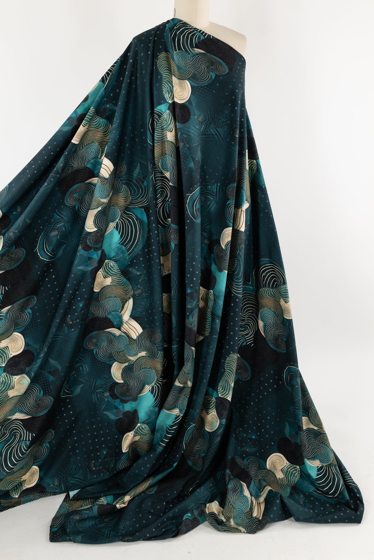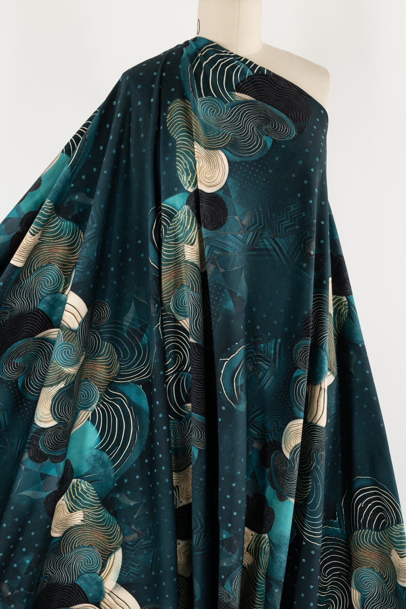 Rich shades of teal, turquoise, navy, sand, gray, and black, elegantly combine fluid spirals with dots and geometrics. Luxurious cotton knit jersey, digitally printed in the Netherlands. Impeccable quality, light/mid-weight, opaque, with a flattering body-skimming flow, appealing soft hand, fluid drape, crosswise stretch, some lengthwise stretch, a 36½" repeat, and some rolling at the cut edge. Ideal for a wide range of garments, t-shirt, tunic, dress, skirt, soft pants, loungewear, caftan, kimono, or children's. Oeko-Tex® certified.